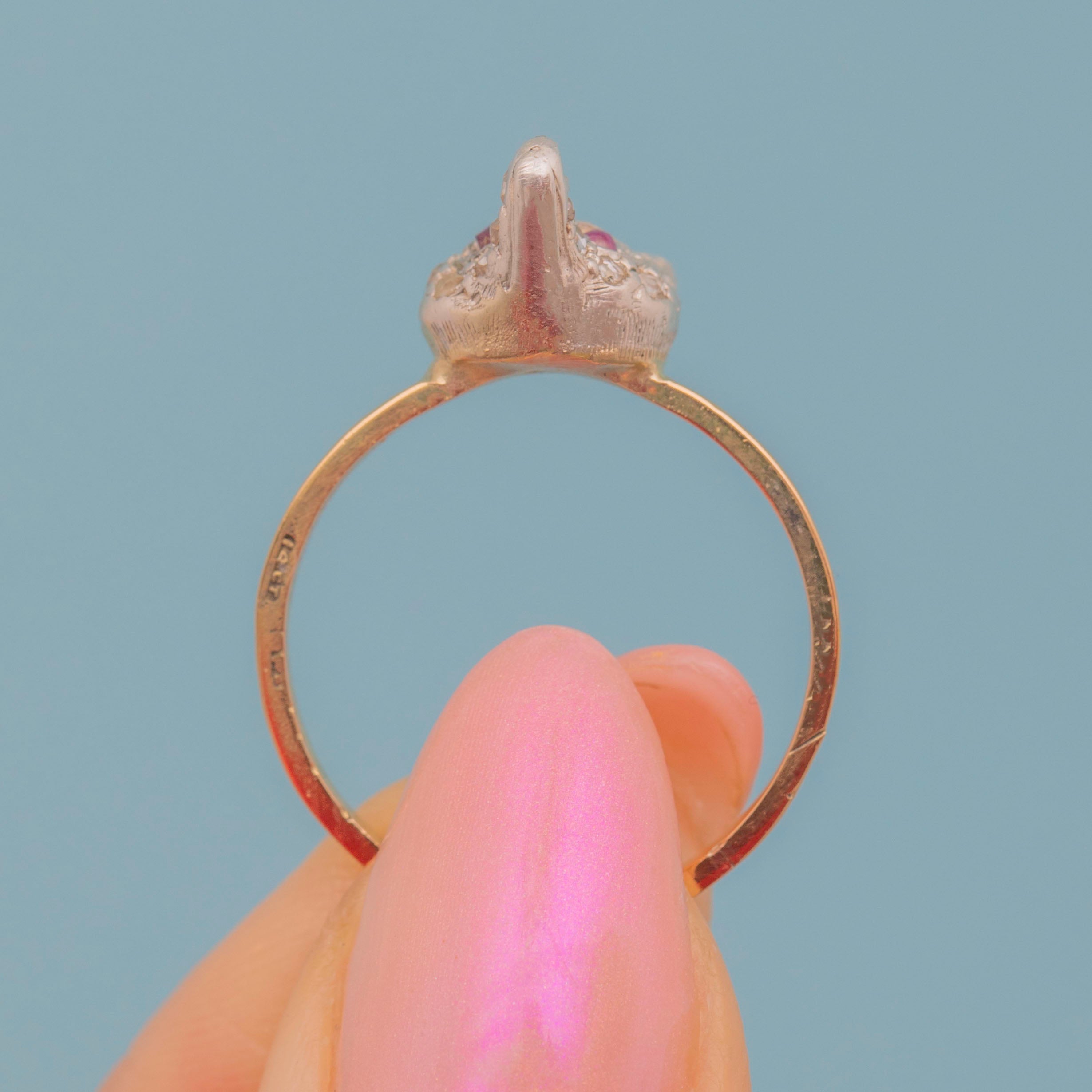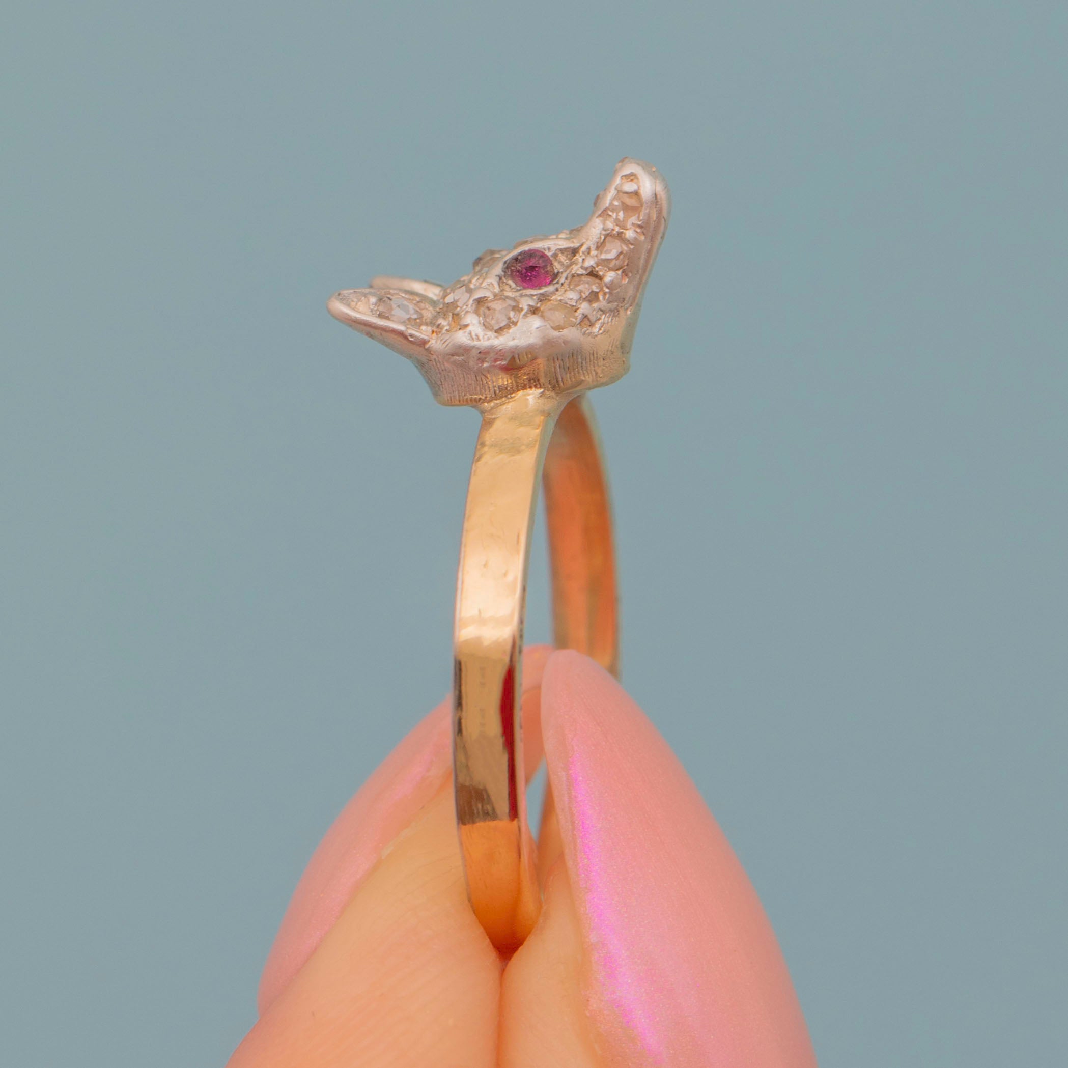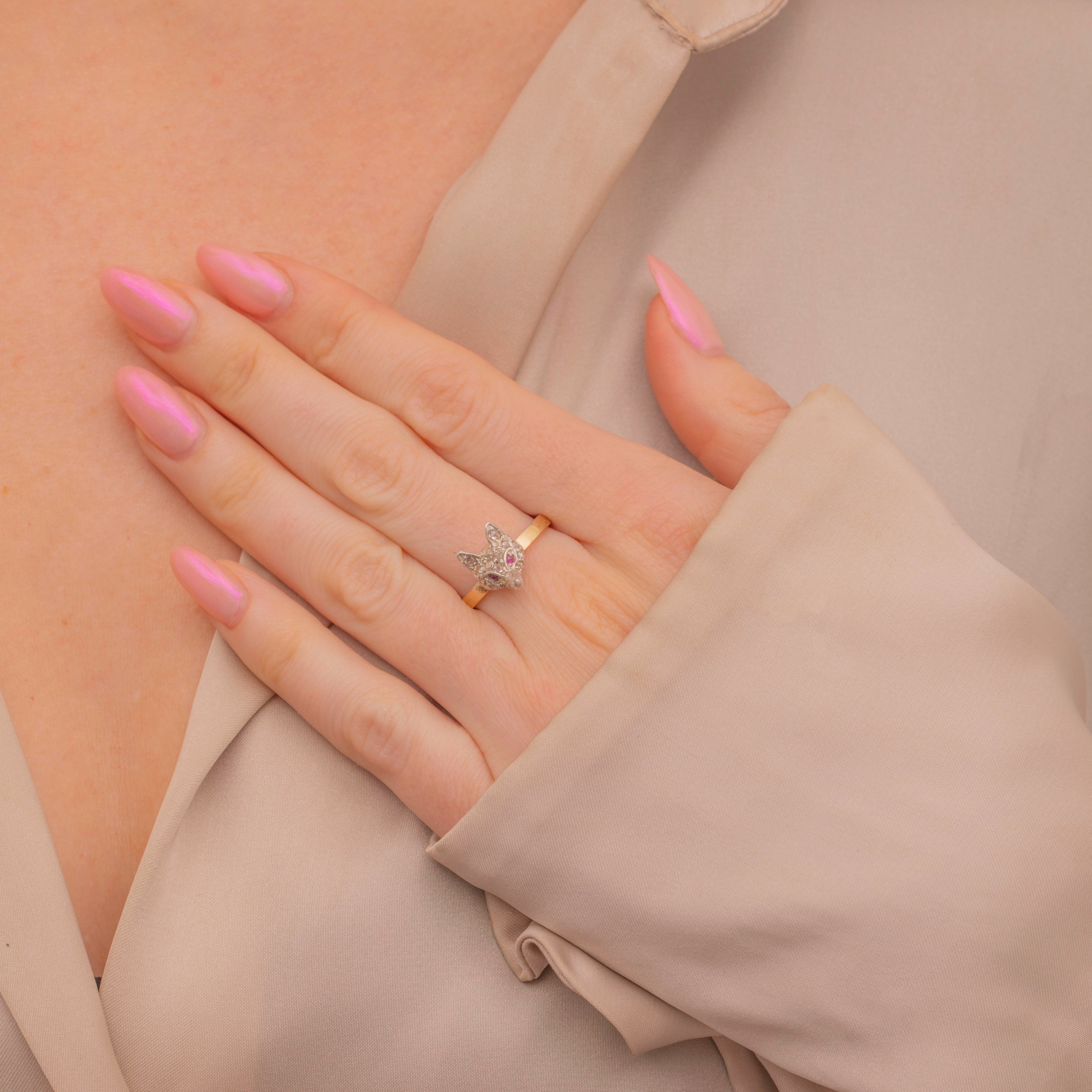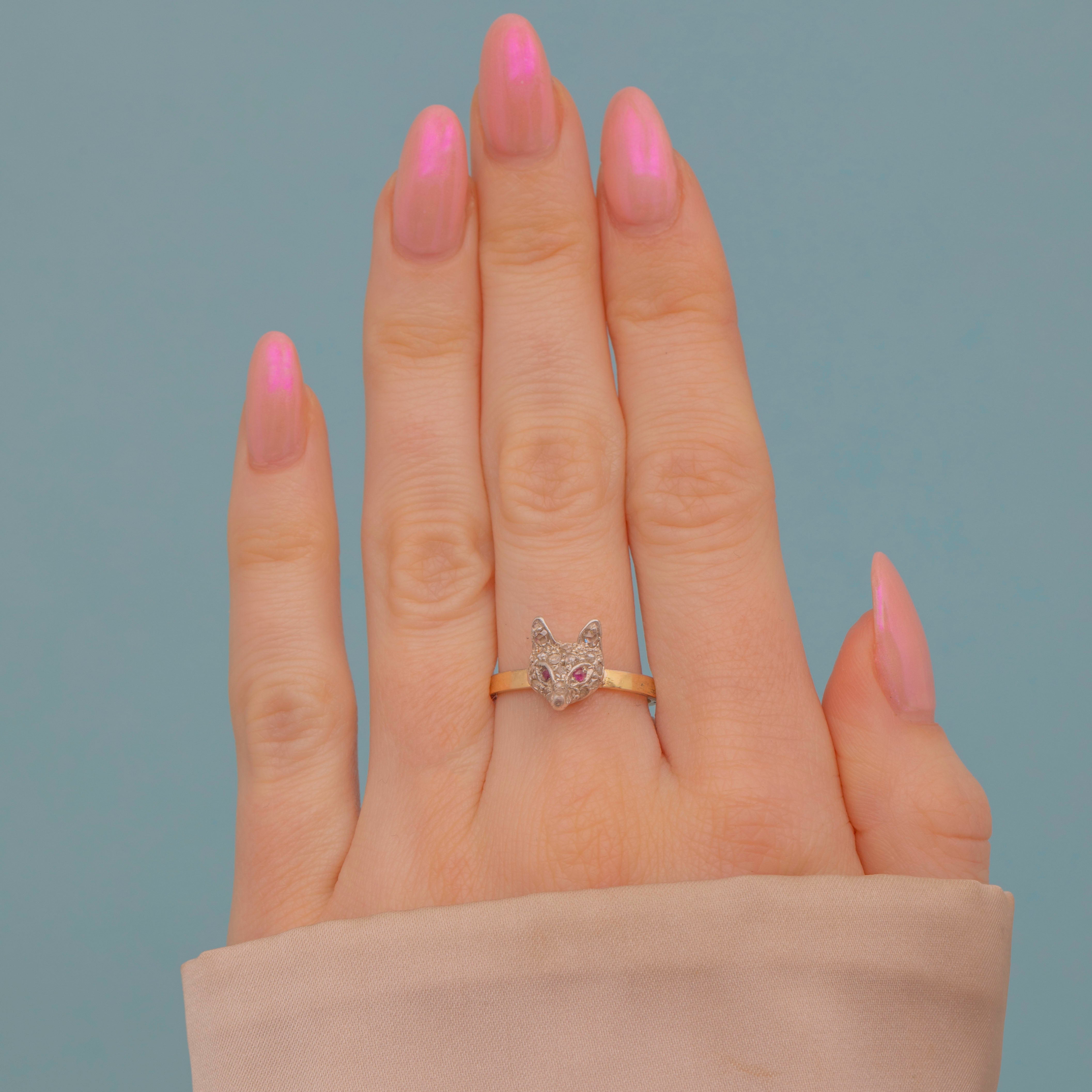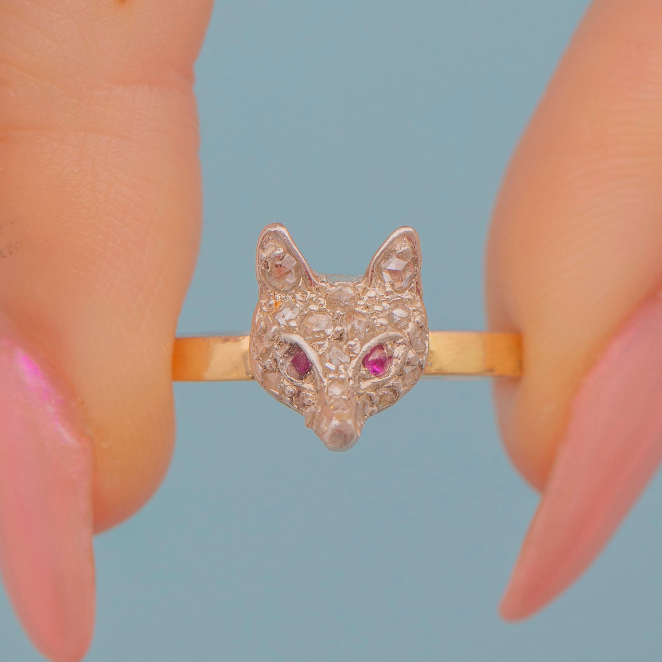 Antique 14ct Gold Diamond Fox Ring, Ruby Eyes