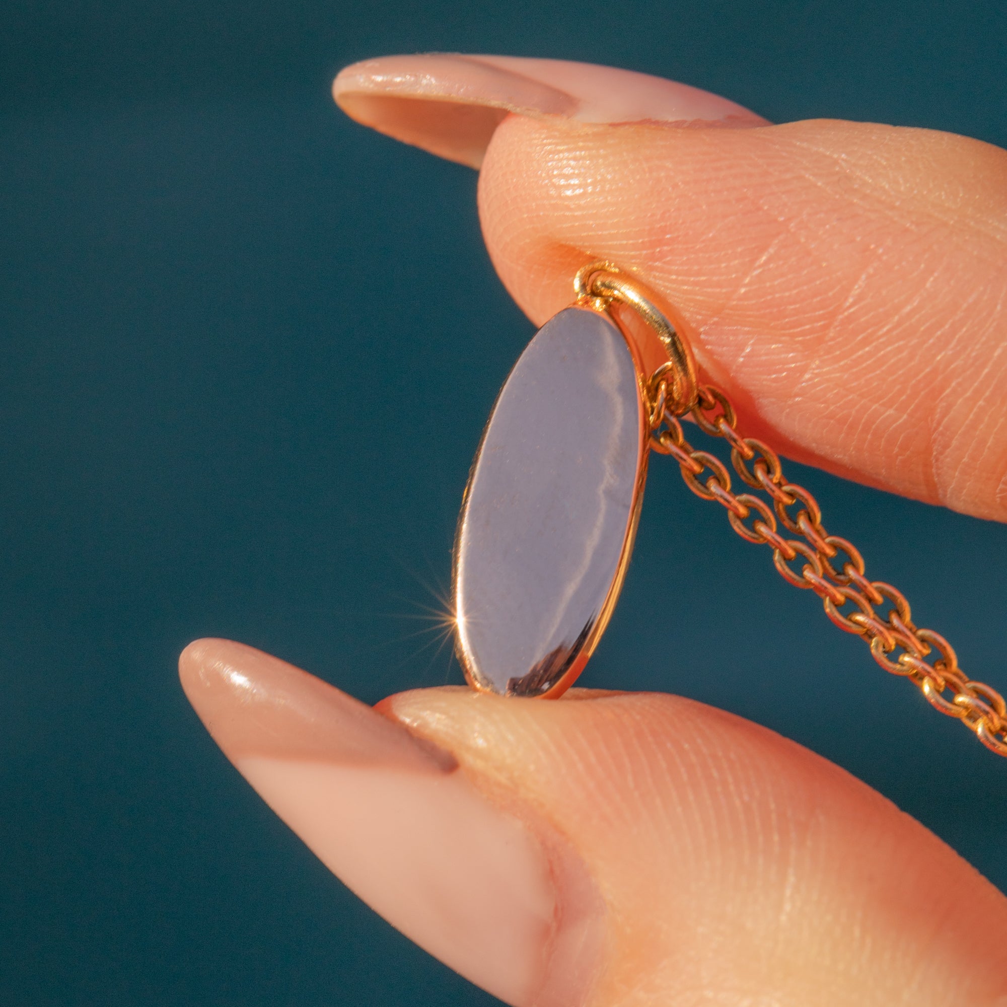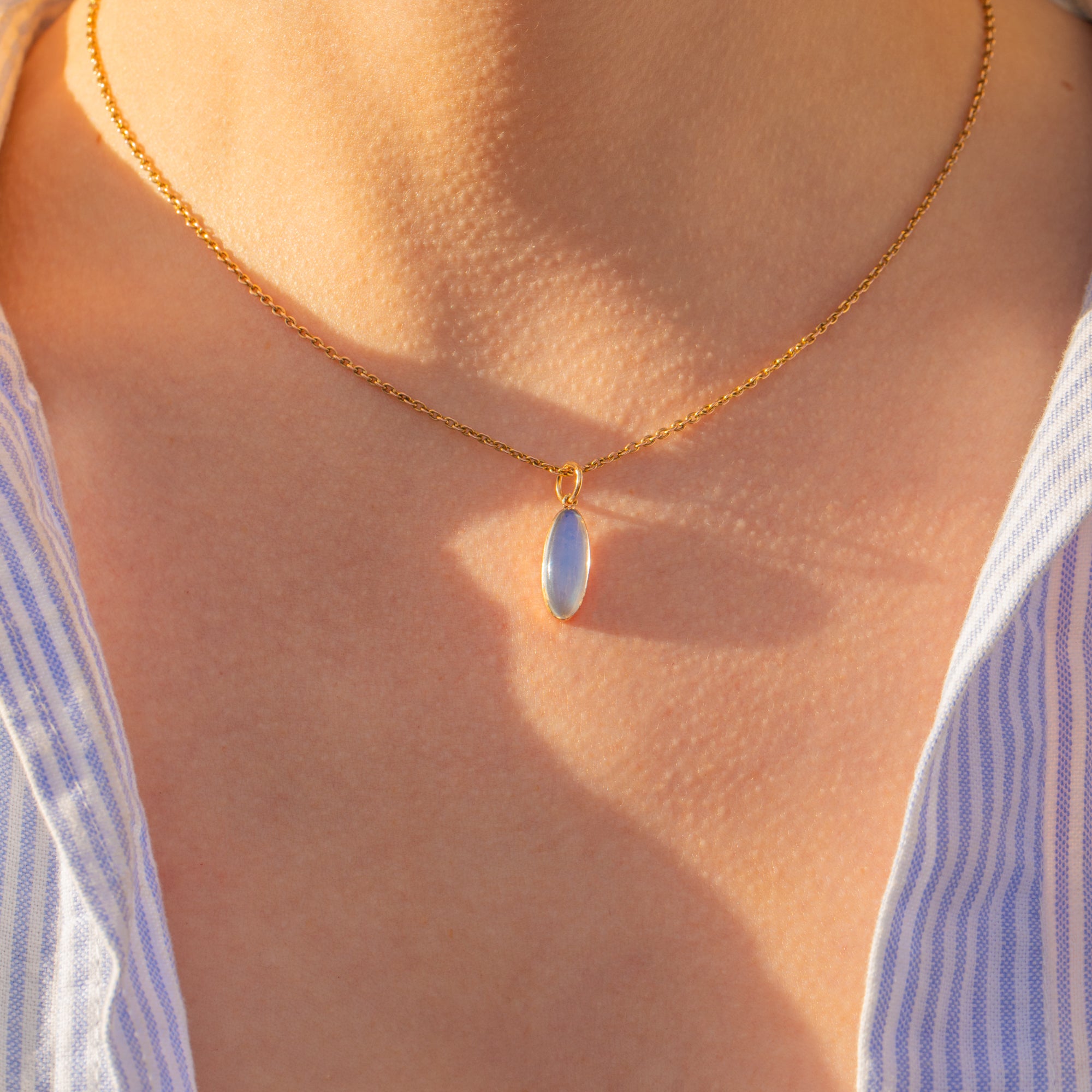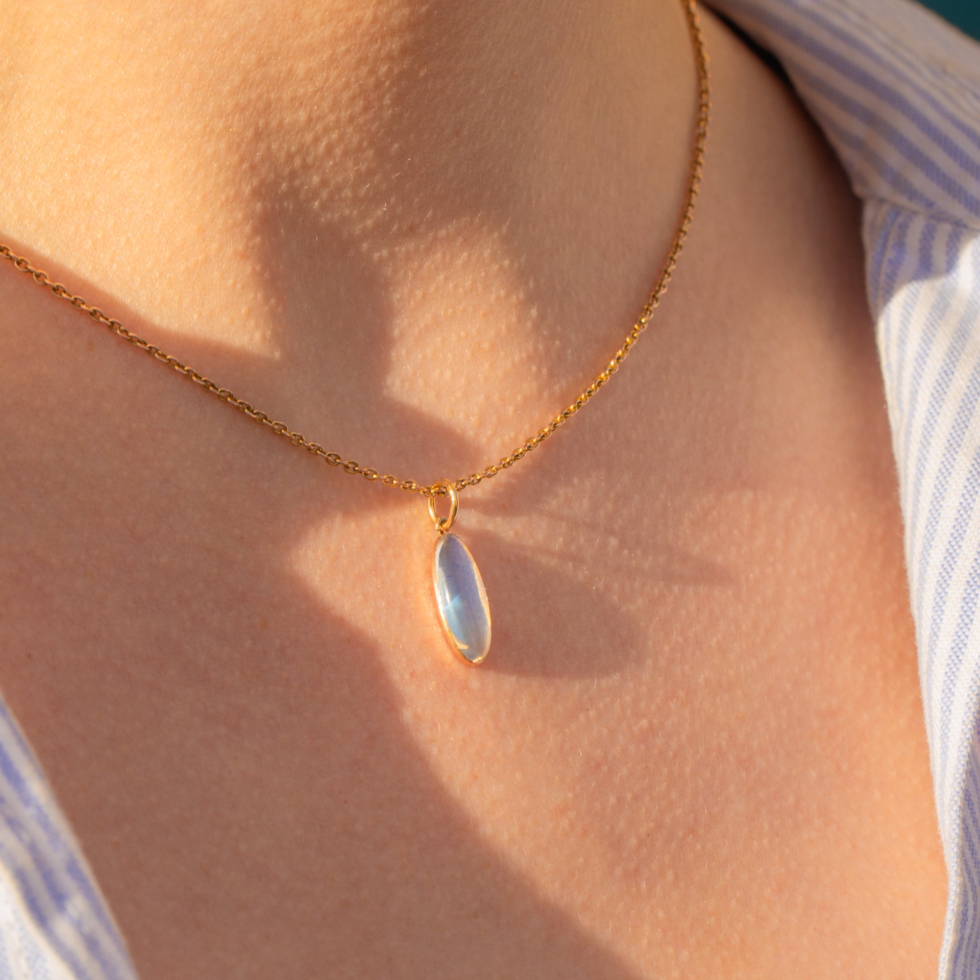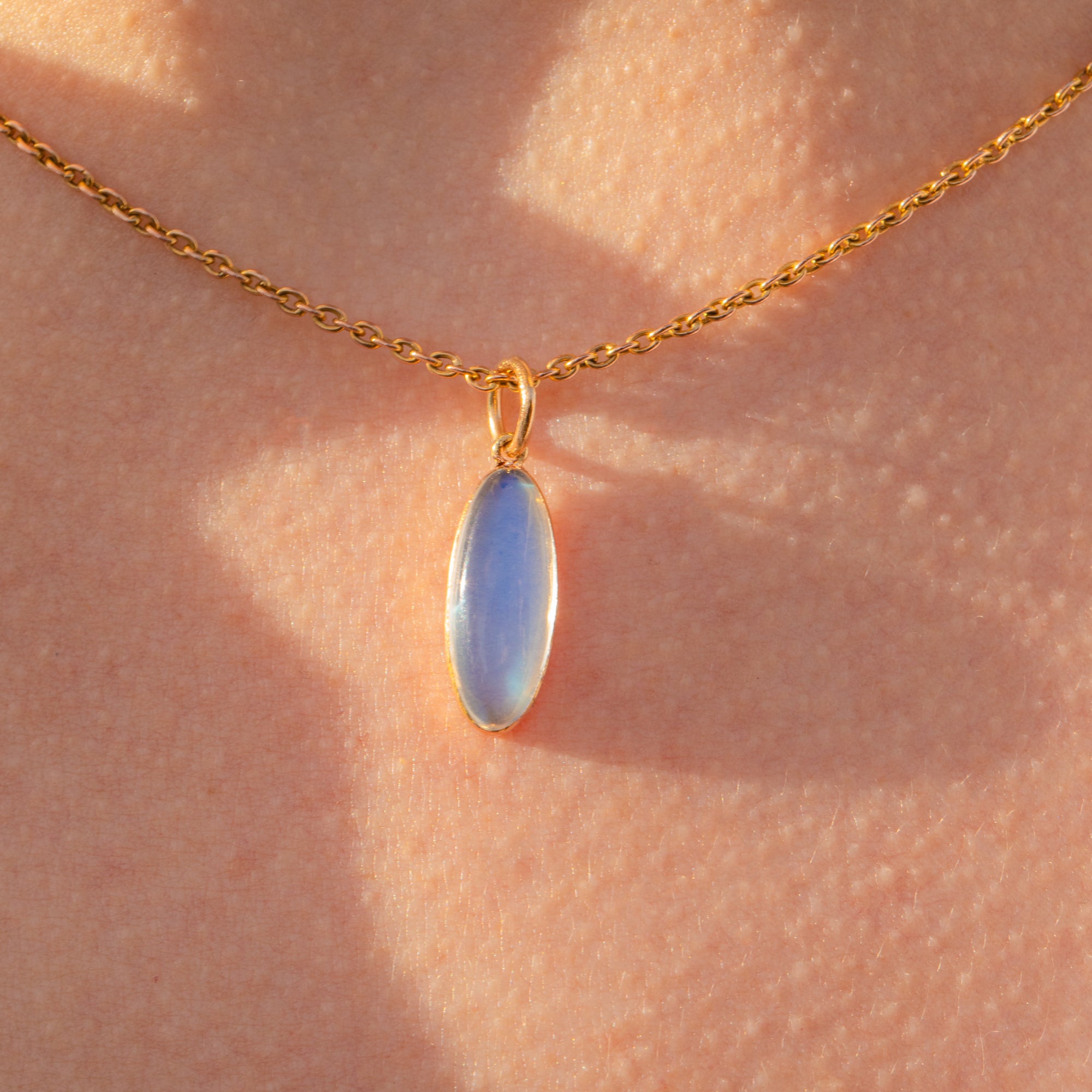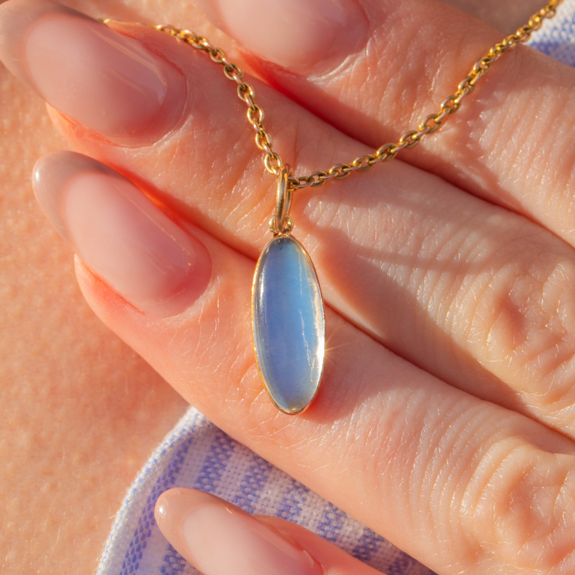 Soak up the mystic beauty of this antique 14ct Gold oval Moonstone cabochon charm! Her ethereal Moonstone cabochon exudes a soft pastel blue schiller that billows across her smooth surface; she is sure to enchant anyone lucky enough to lay eyes on her.
