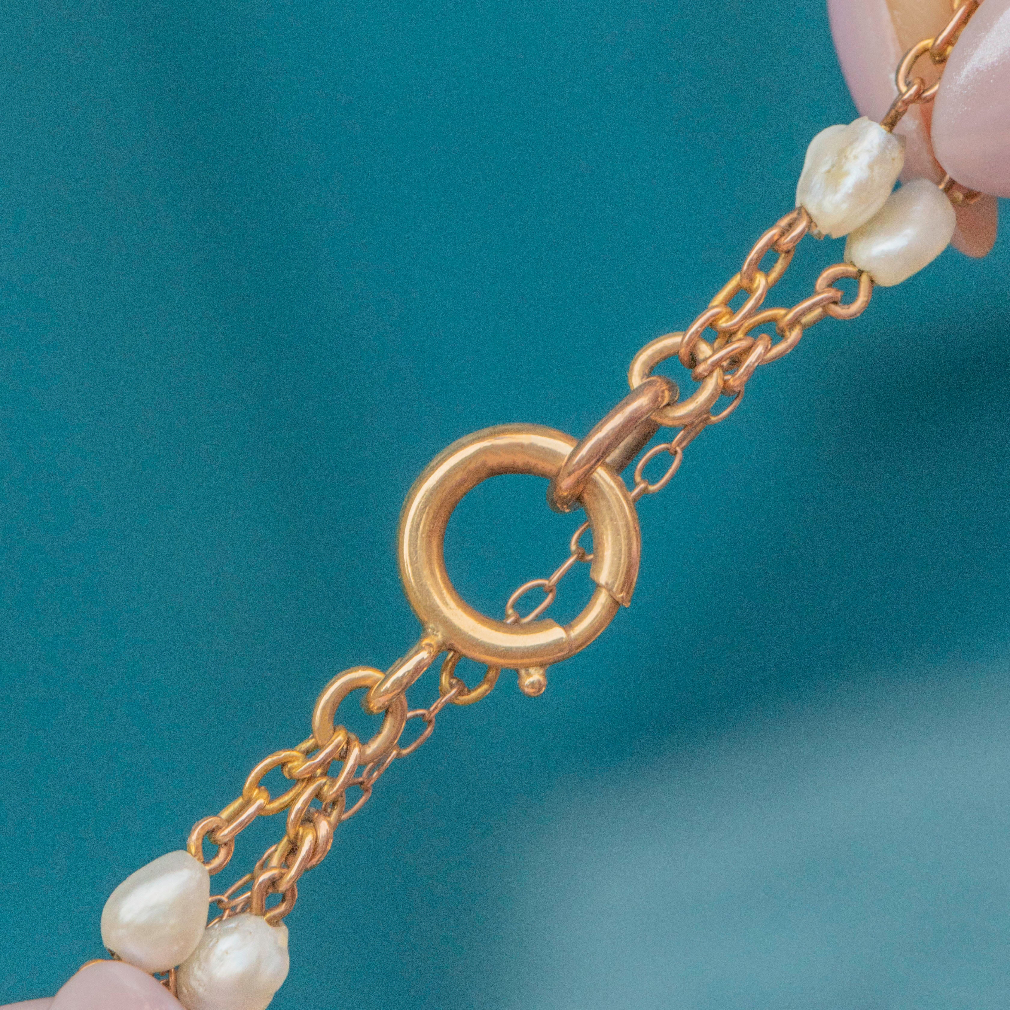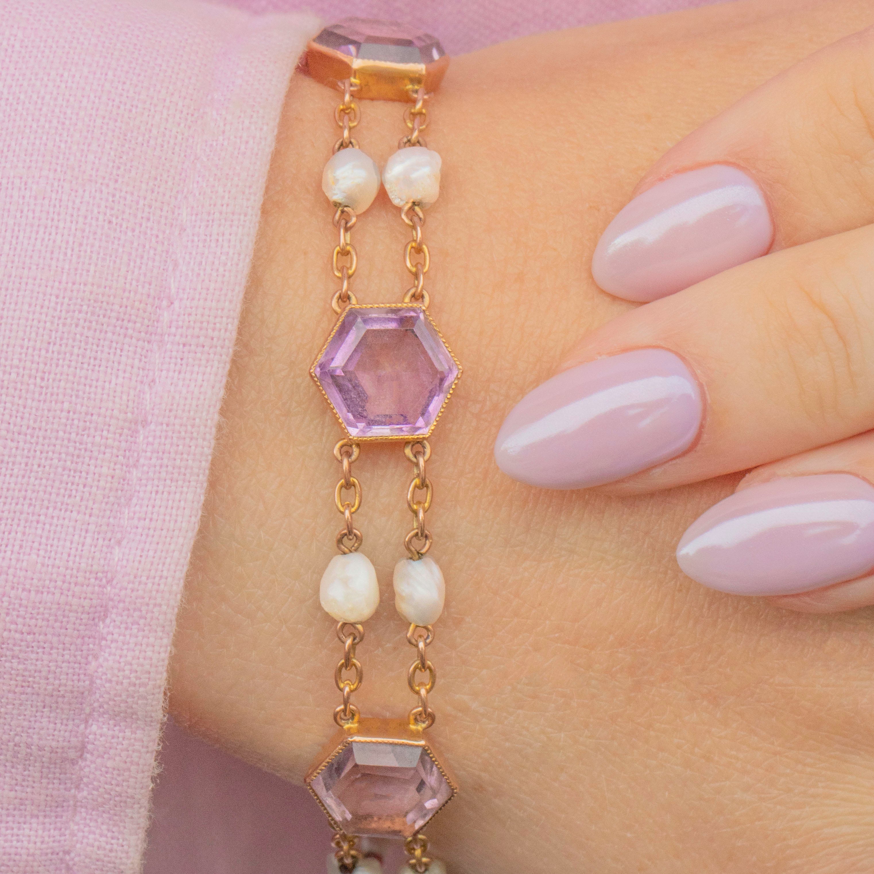 EXCELLENT. This antique 15ct Gold Amethyst Baroque Pearl bracelet is in excellent condition. The Amethysts have a lovely lilac hue and the Pearls each have their own unique shape- an homage to Mother Nature. The bracelet has been finished with a large Gold bolt ring, which will allow you to wear it with the utmost confidence!