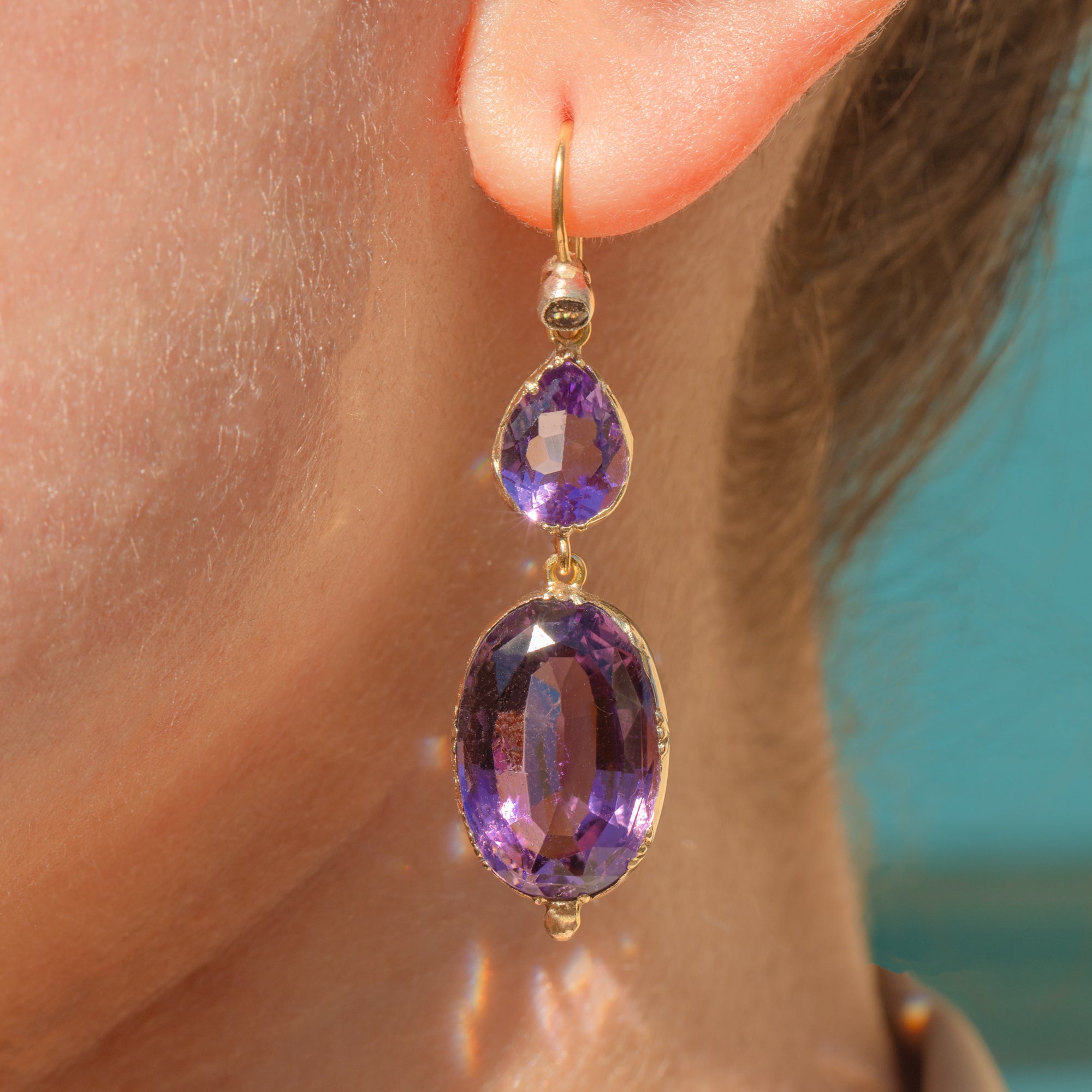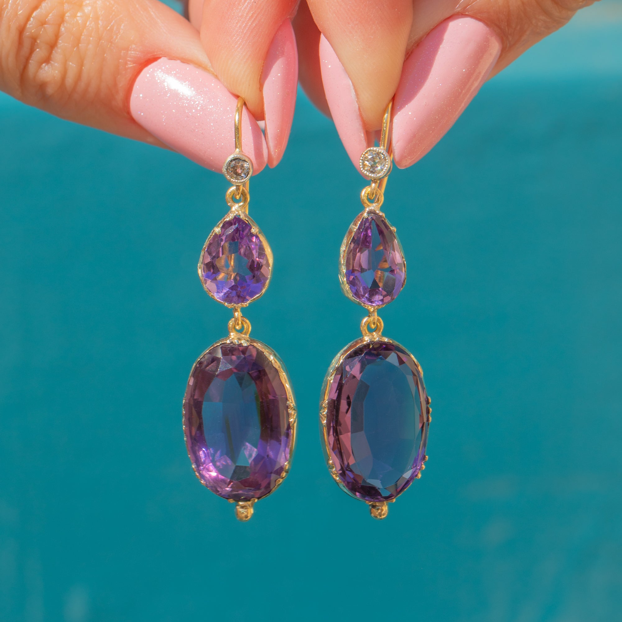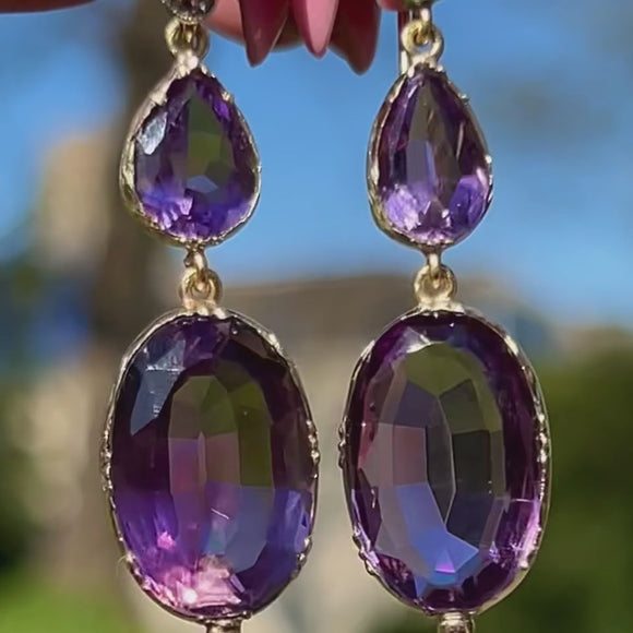 Add splendour to your attire with these bold antique 15ct Gold Amethyst Diamond drop earrings!