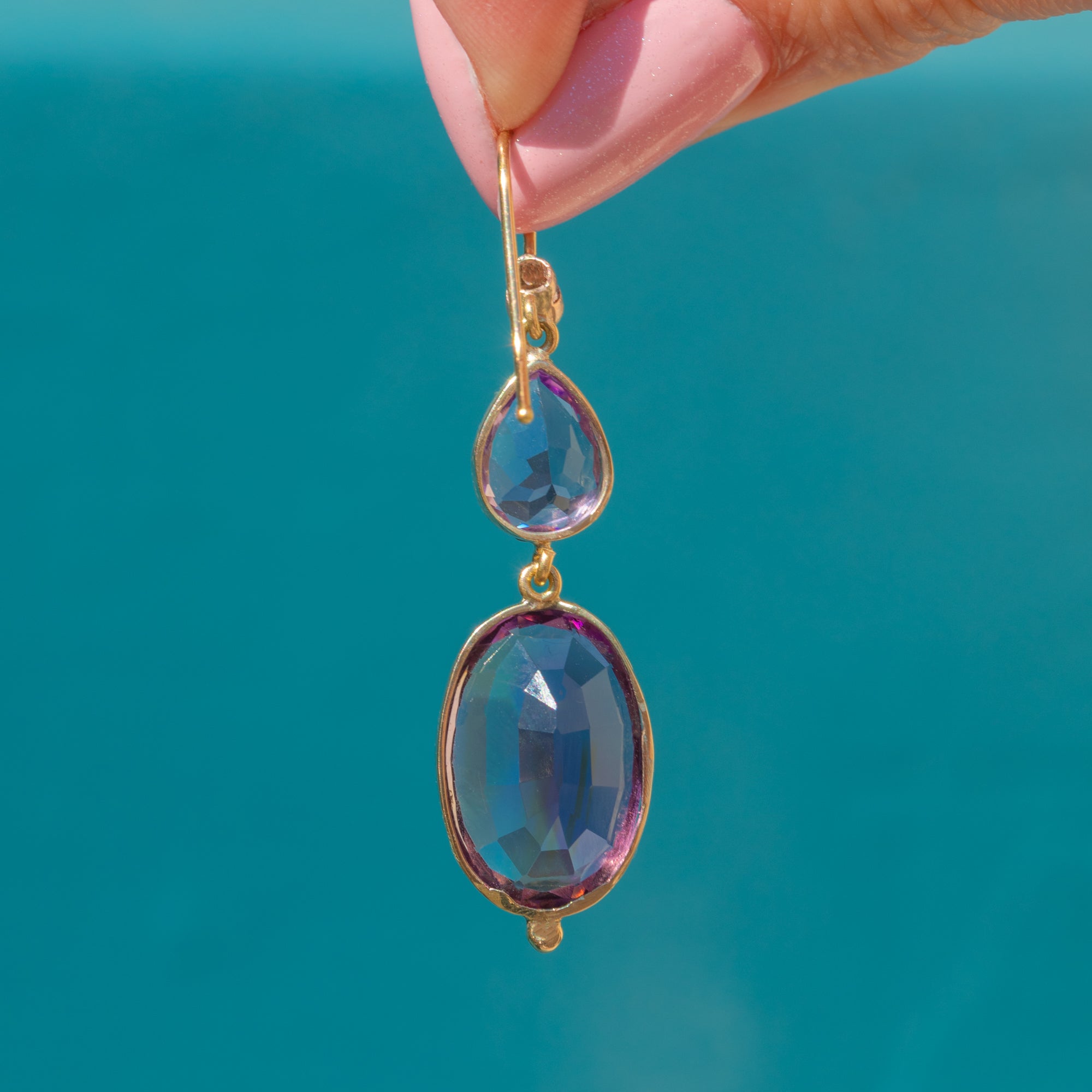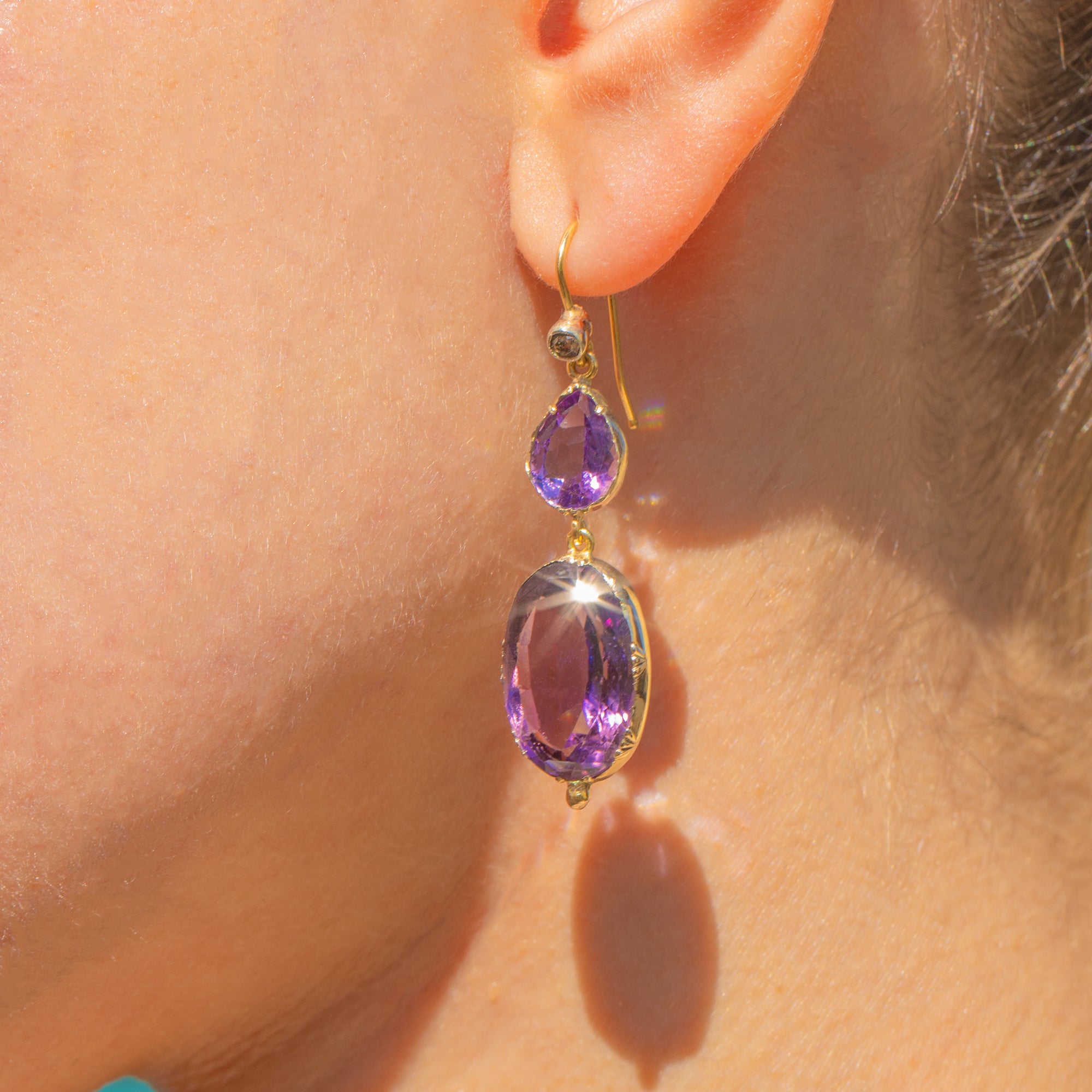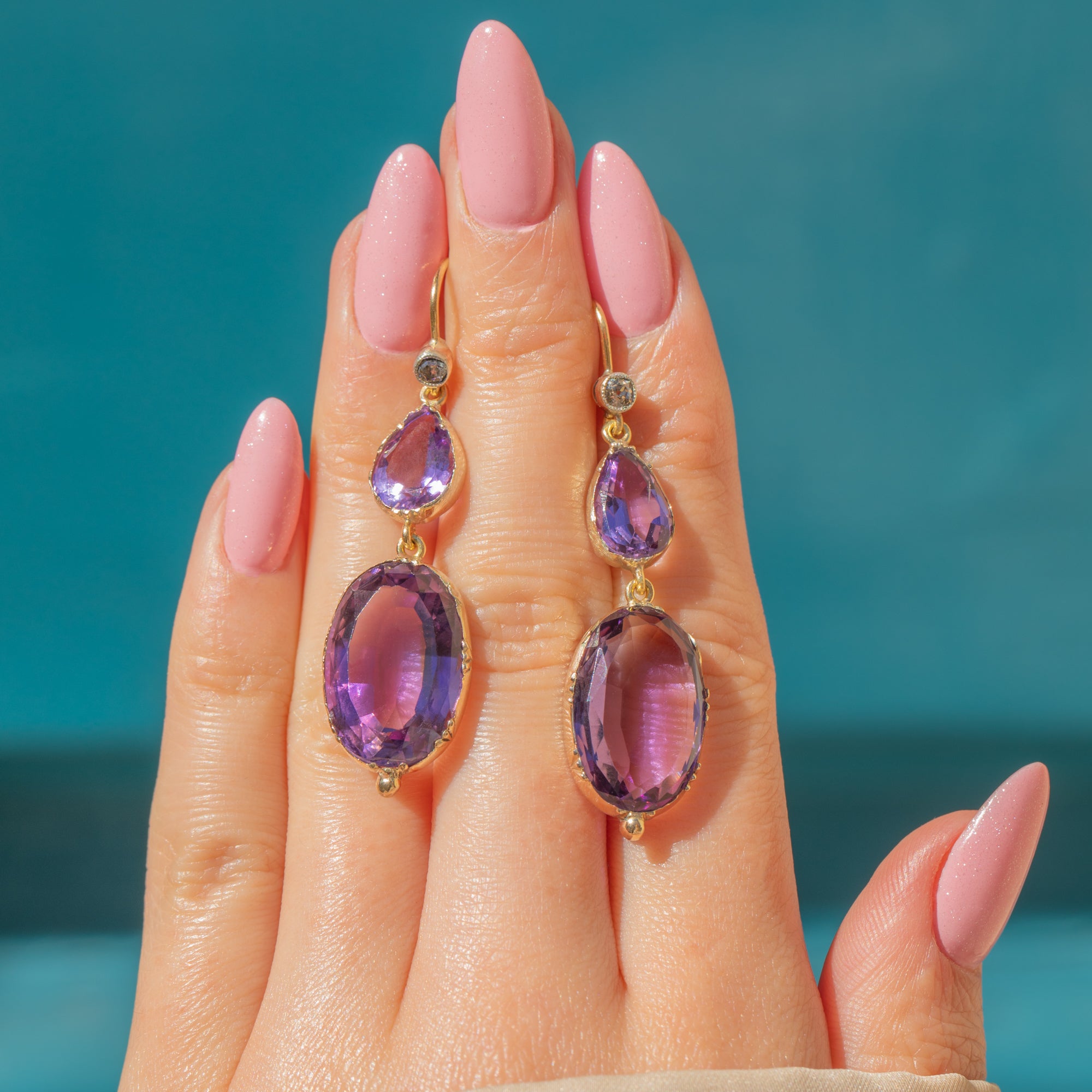 Add splendour to your attire with these bold antique 15ct Gold Amethyst Diamond drop earrings!