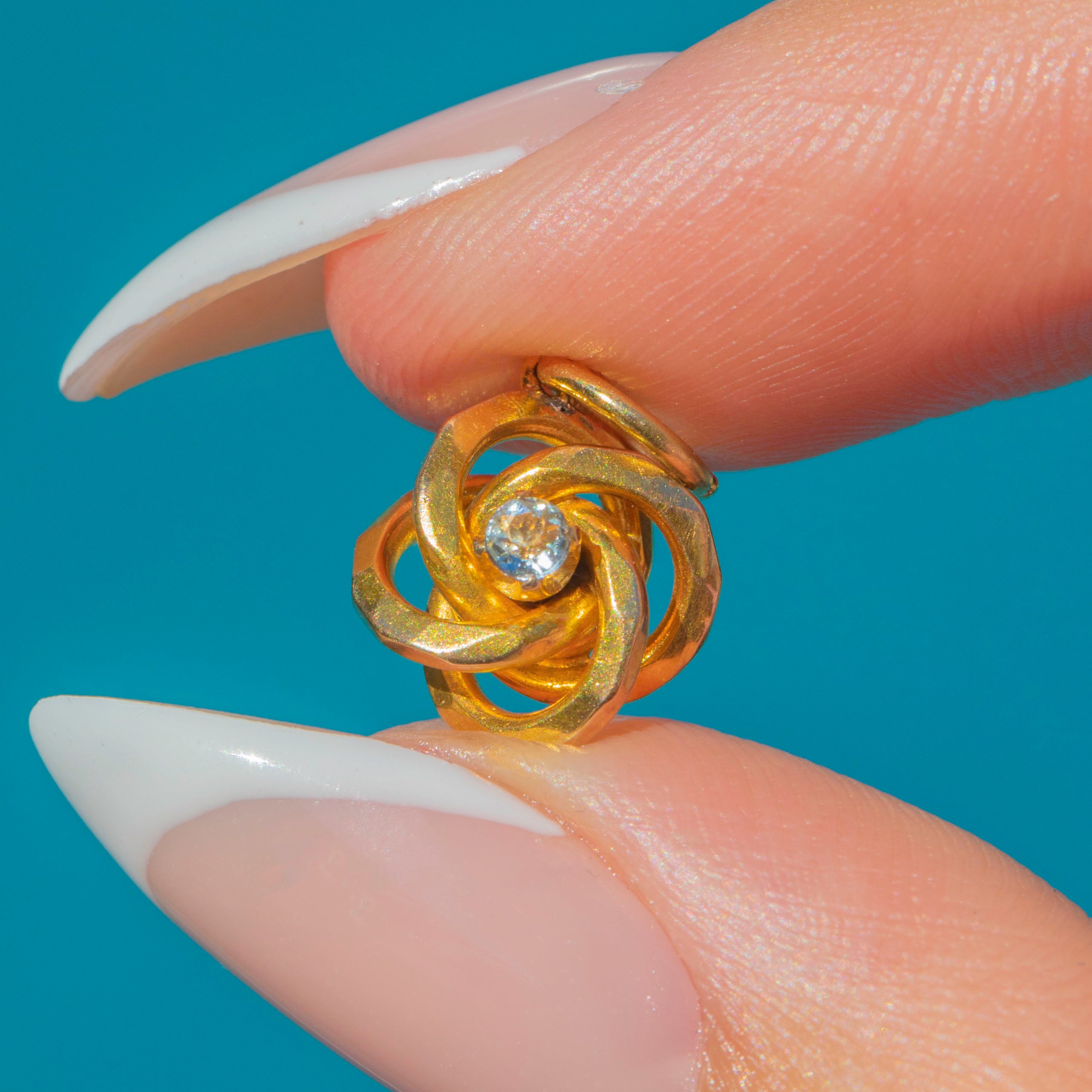 This Antique Victorian charm is crafted in 15ct Gold and modelled in a classic knot motif, symbolising unity and eternal love. At its centre sits a sparkling pale blue Aquamarine, adding a delicate touch of colour to the warm golden tones.