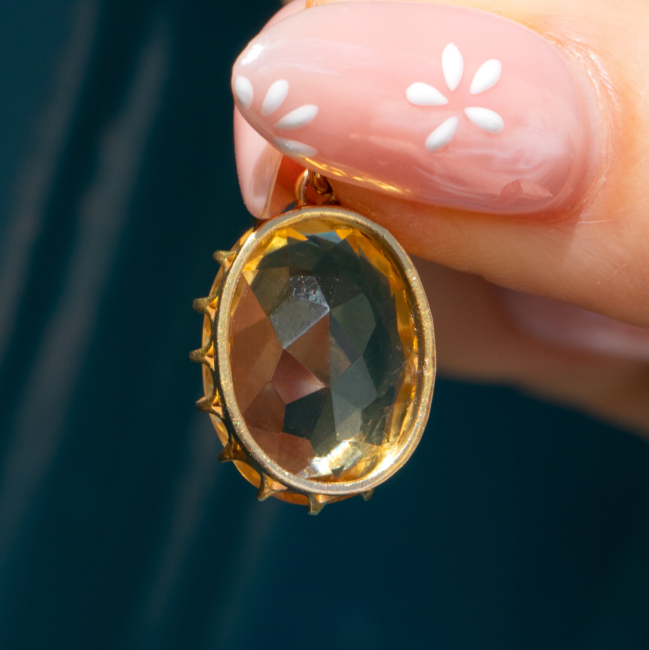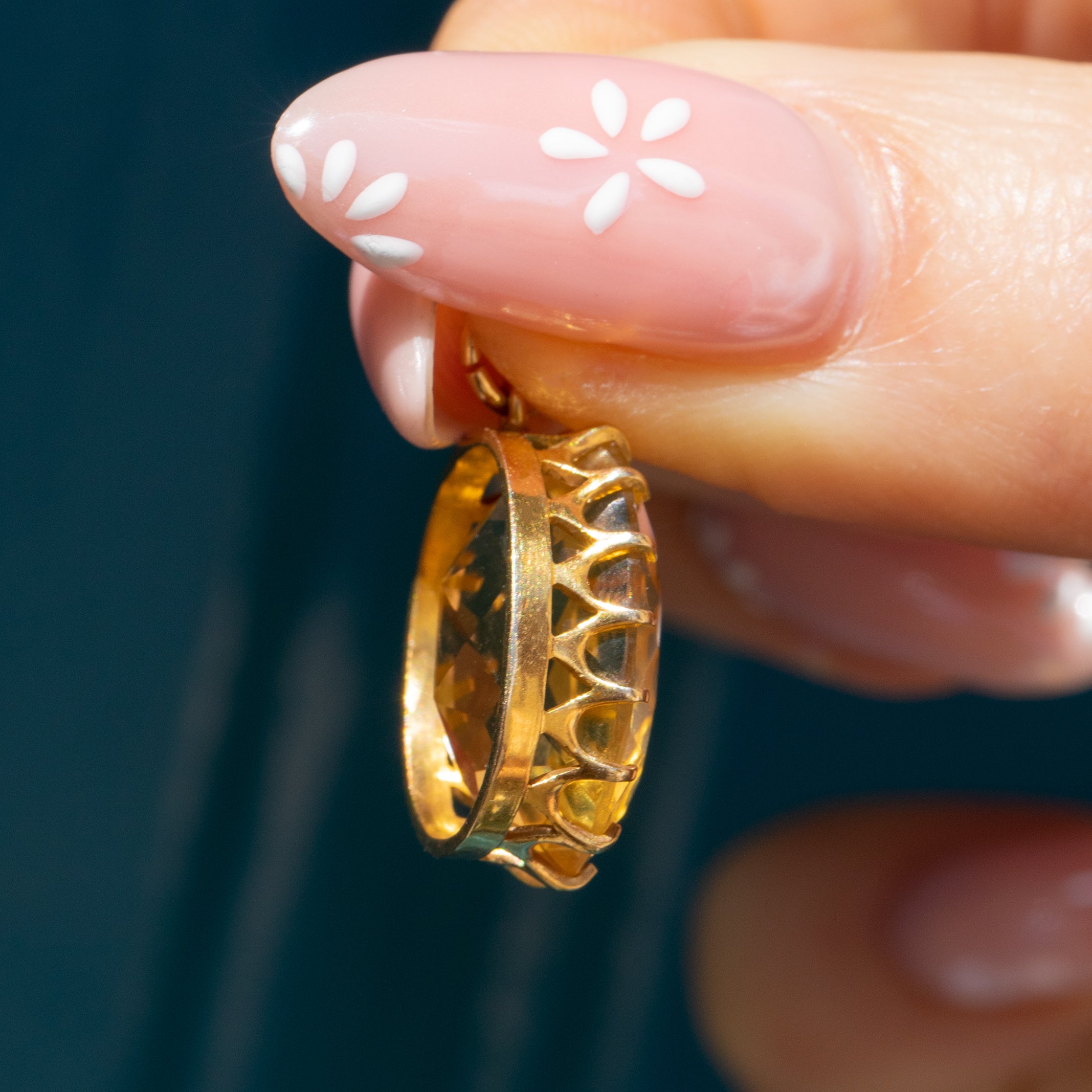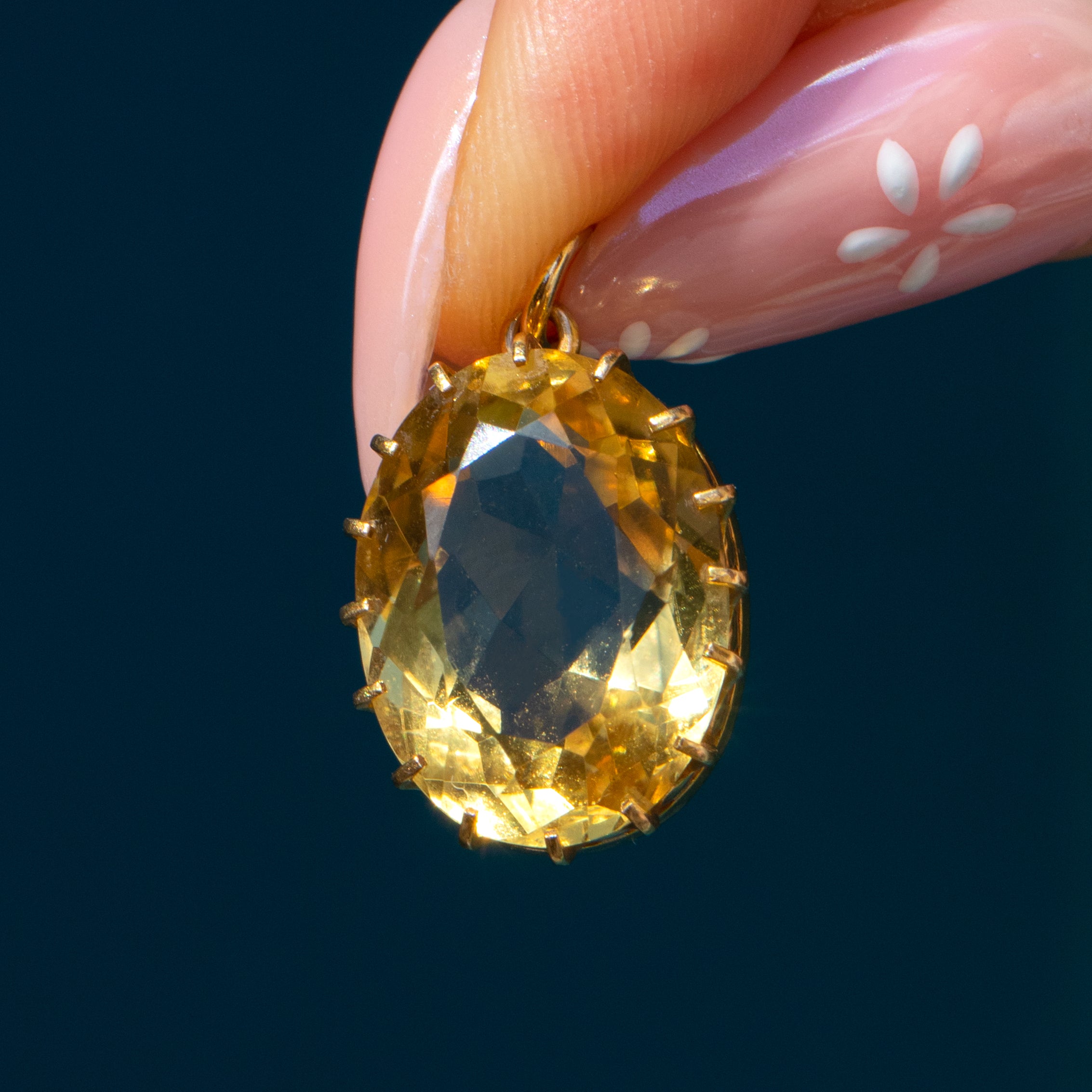 With sunshine yellow hues glimmering across her crisp cut facets, this antique 15ct Gold Citrine pendant will make a joyous addition to your collection! A 15ct Gold crown setting proudly displays the 7.48ct Citrine, with a luxurious satin finish that compliments the syrupy gemstone perfectly.