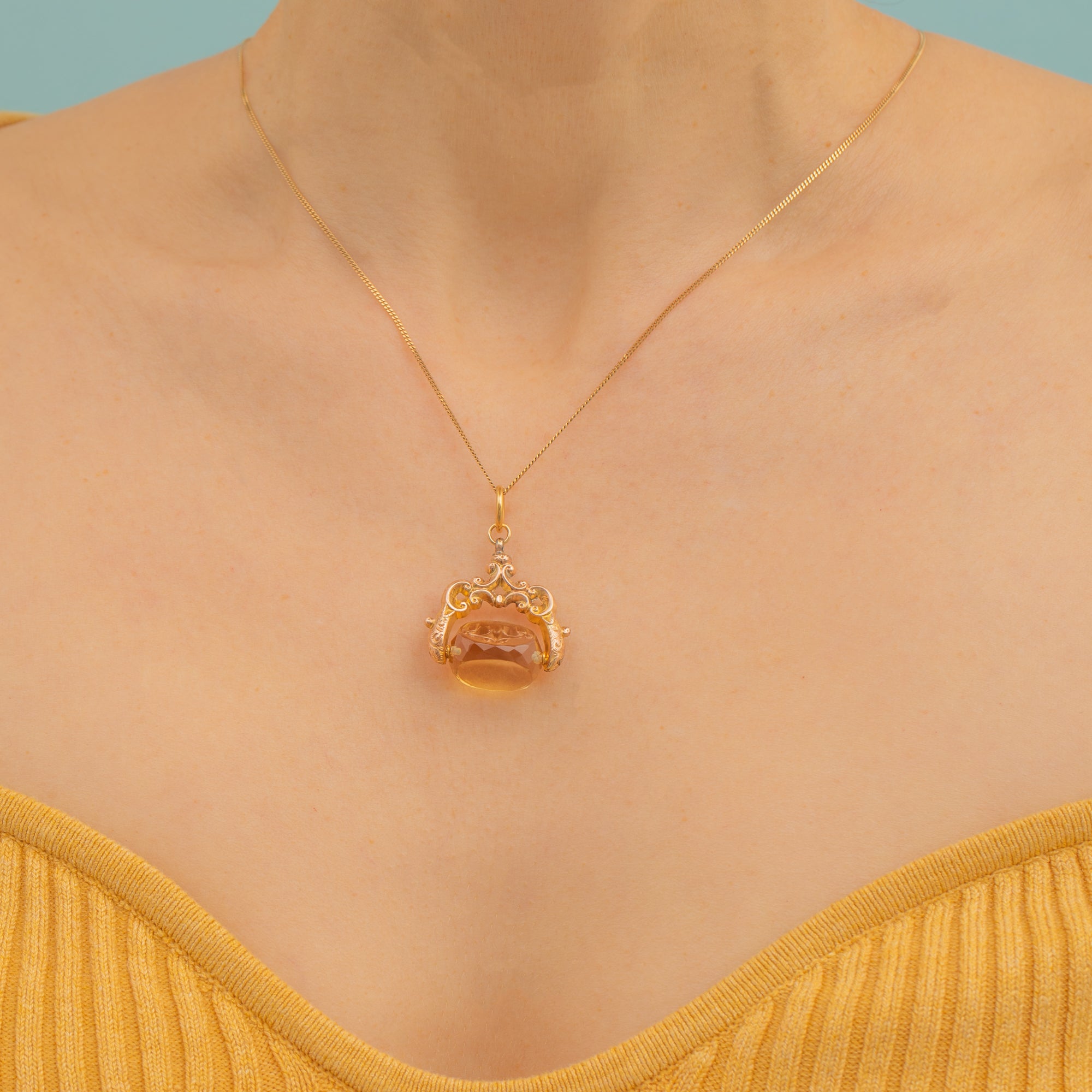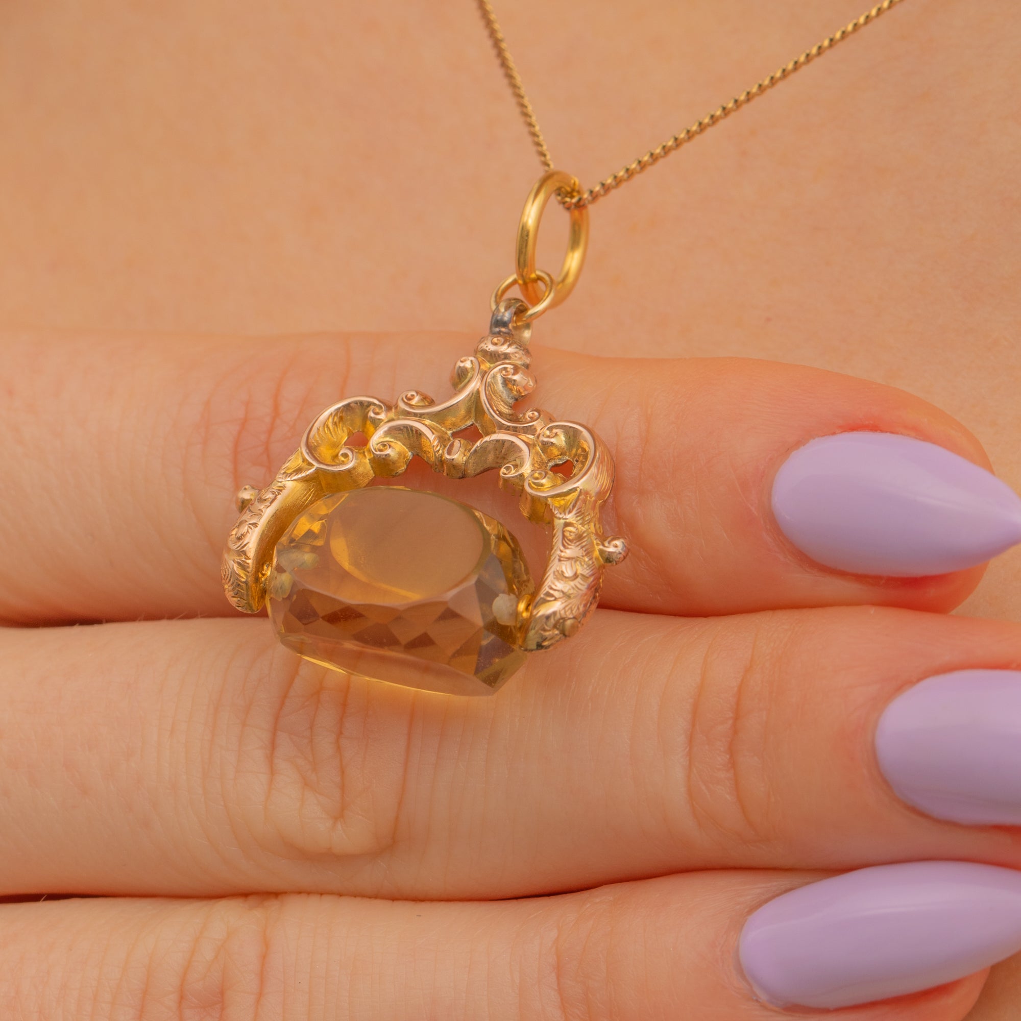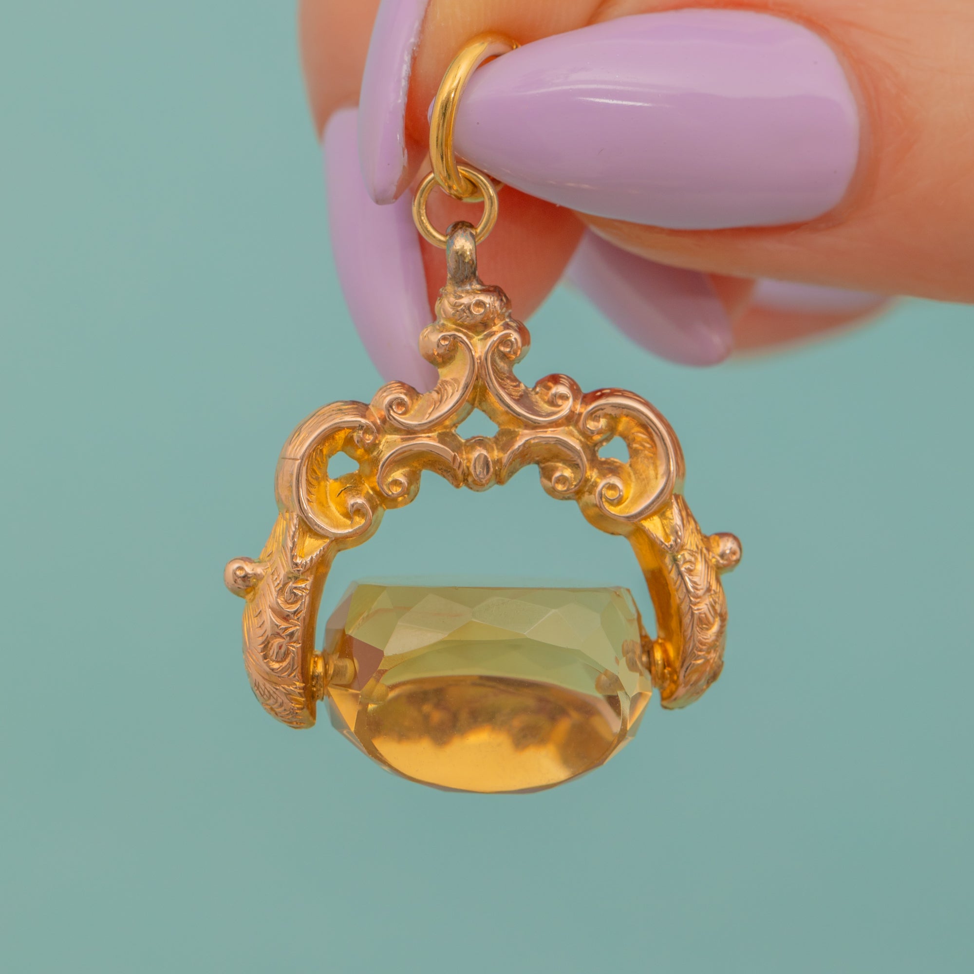 EXCELLENT. This antique 15ct Gold Citrine spinner fob pendant is in wonderful condition throughout. Her 15ct Gold is impressively bright and the ornate openwork bale is free from dings or scuffs - amazing considering she is over 100 years old! Plus, the Citrine is luminous, free from chips or abrasions, and still spins freely.