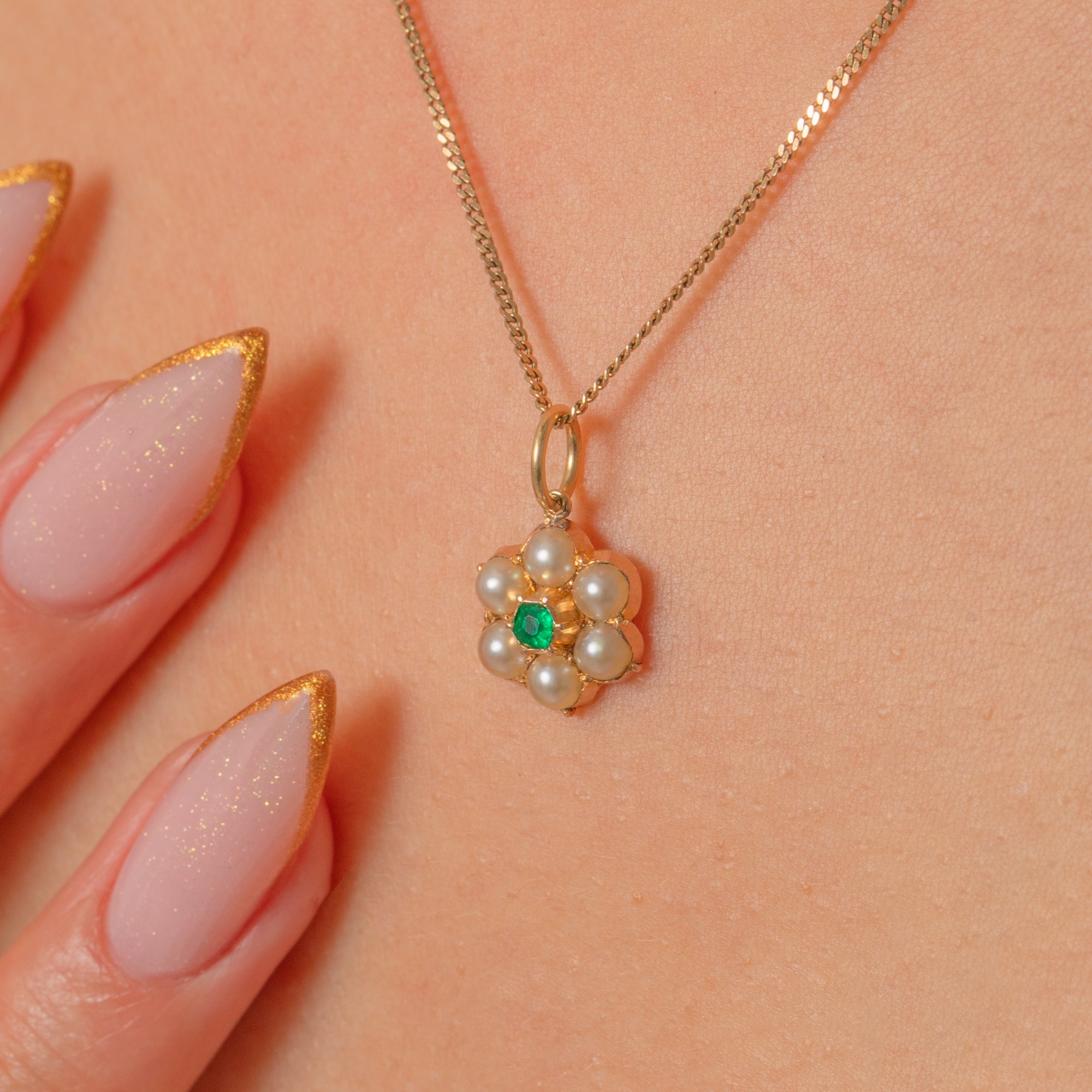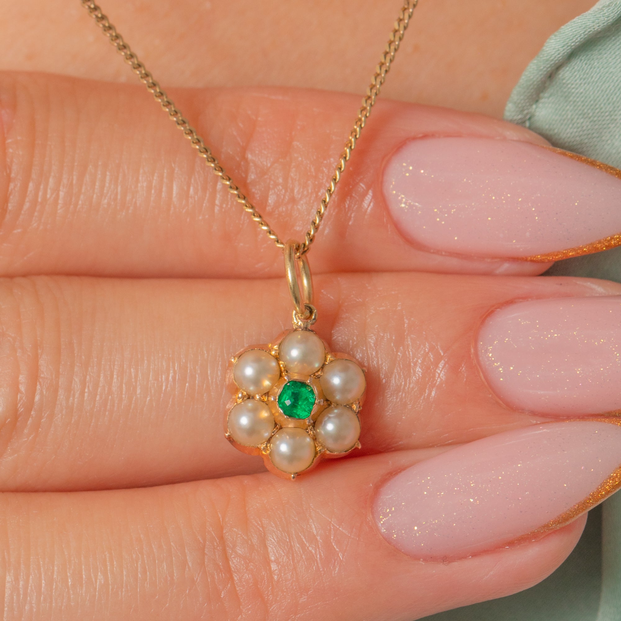 This charming Victorian flower cluster pendant is crafted in warm 15ct Gold and set with a vivid green Emerald surrounded by a halo of lustrous Pearls. The design captures the soft femininity and naturalistic elegance of the era — each gem perfectly balanced within a dainty floral motif.