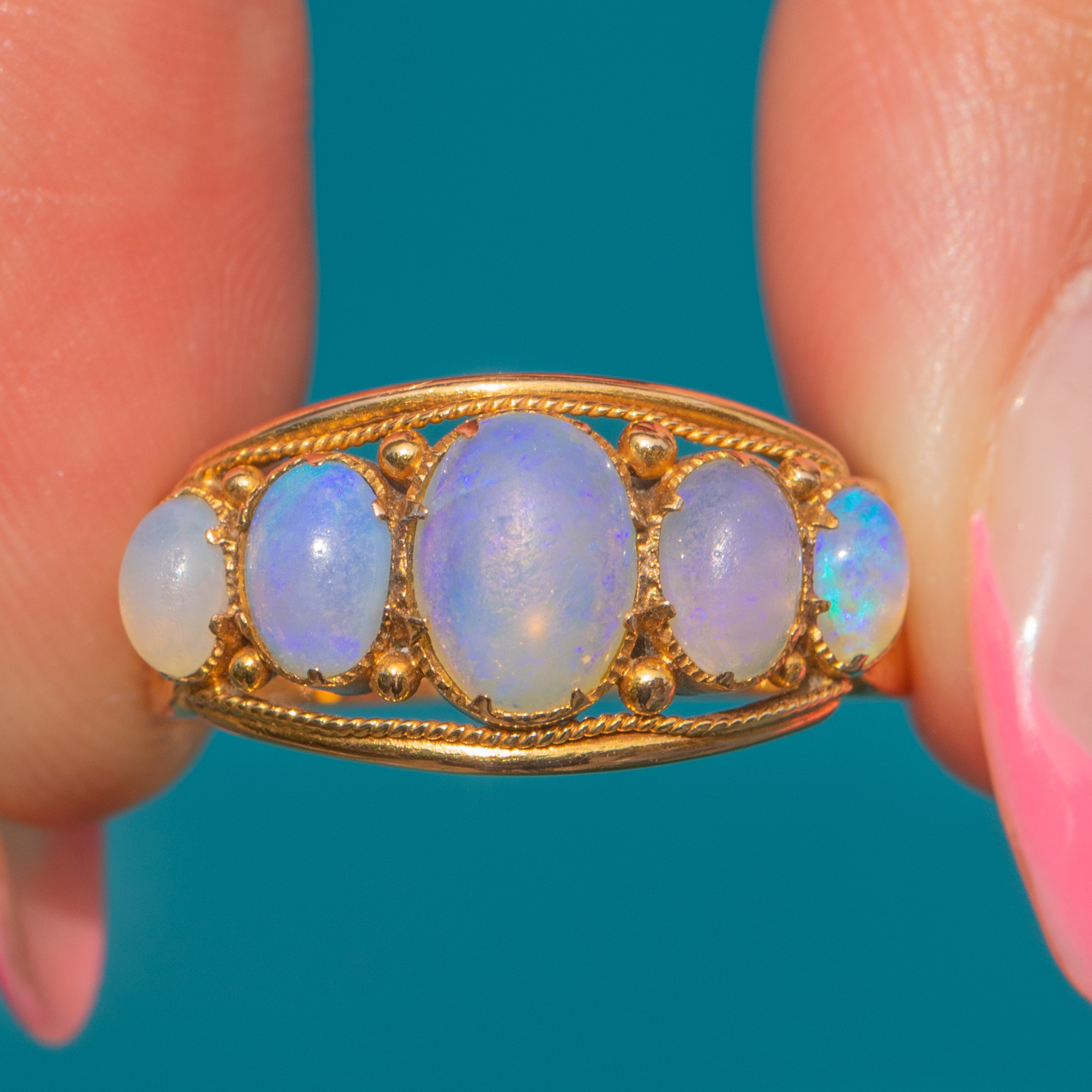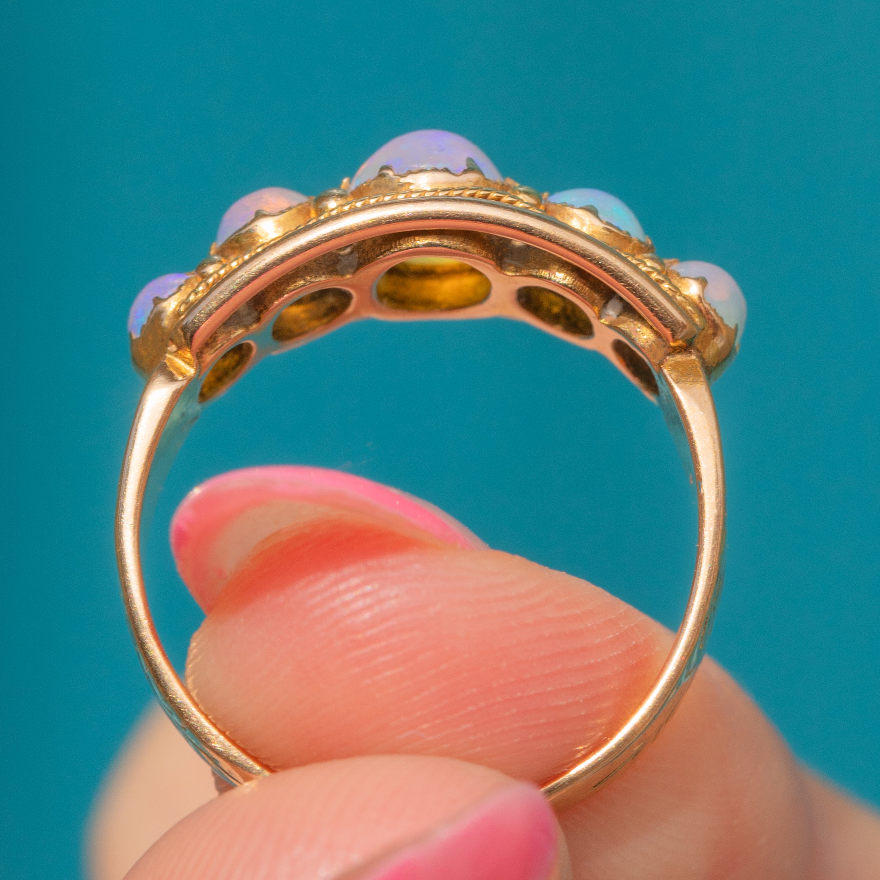 The 15ct Gold is buttery and possesses an alluring glow, with settings that provide a perfect throne for the five jelly-like Opals. Showcasing flashes of neon green and red, like planets floating through the galaxy, the Opals thrive beneath the light and will enchant anyone who lays eyes on this spectacular Victorian ring!