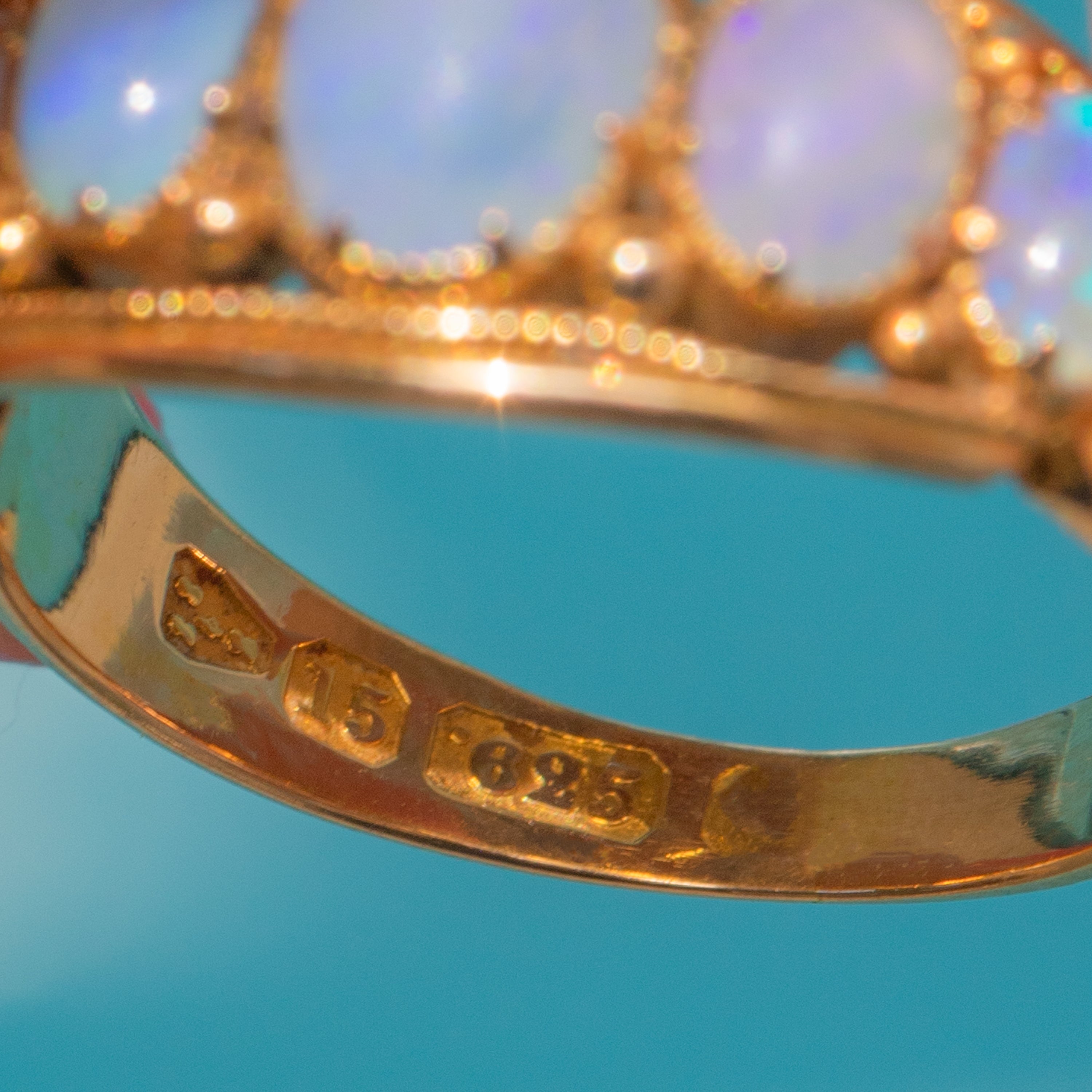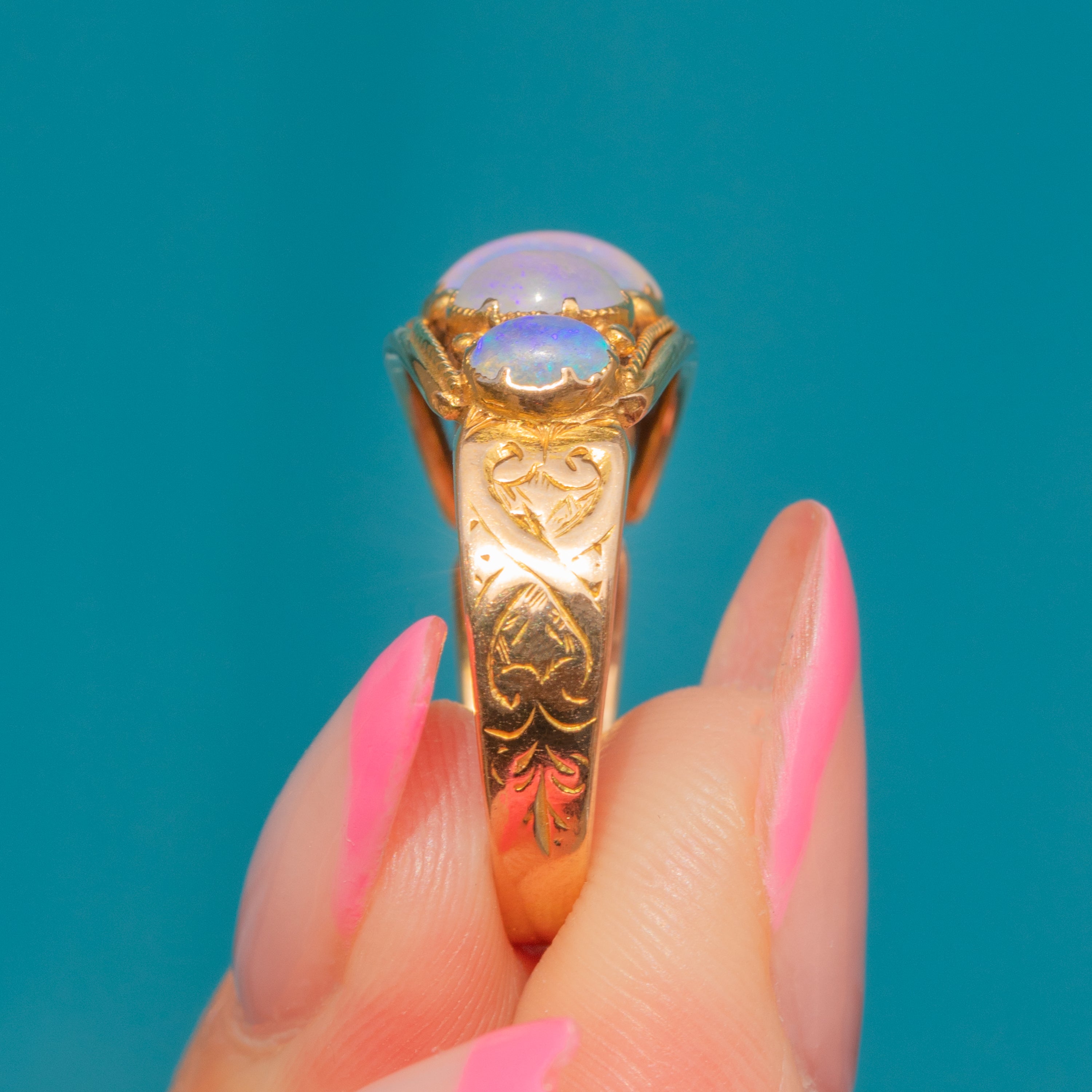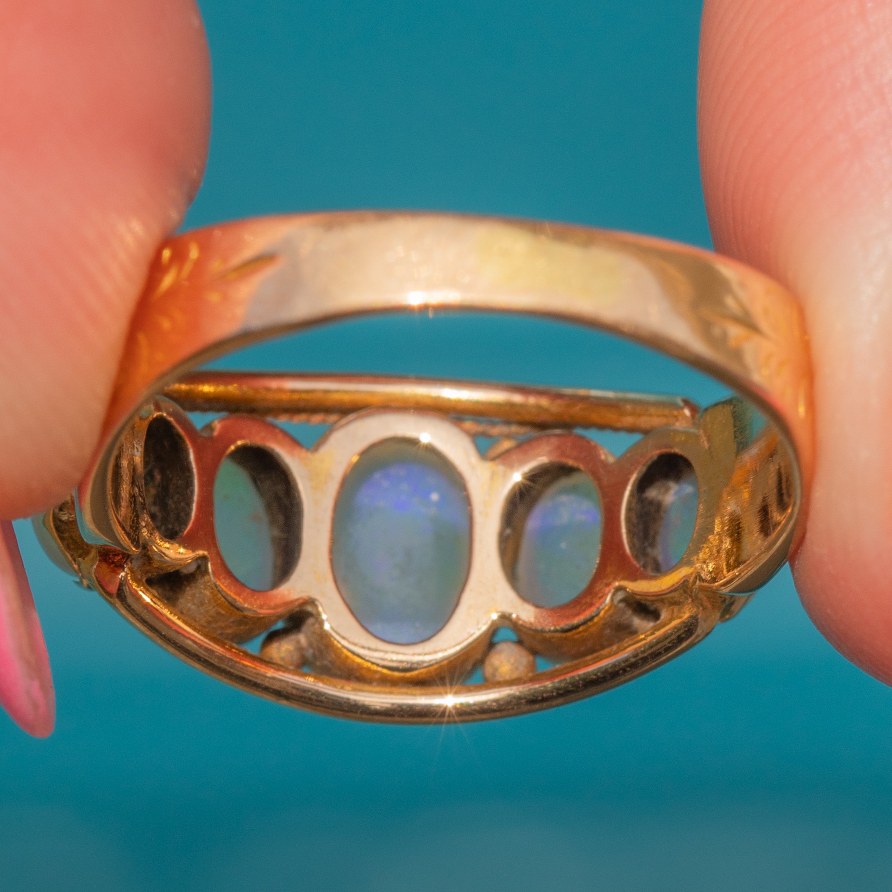 VERY GOOD: This antique 15ct Gold engraved Opal five stone ring is in wonderful condition. The Gold has a wonderful saturation and engravings are intricate, with only very minor signs of wear throughout. Her Opals are bright and captivating, they do have a few dings scuffs to their surface - but they still have a captivating play-of-colour. With secure settings and a robust band, this Victorian Opal ring is ready to be worn and enjoyed!