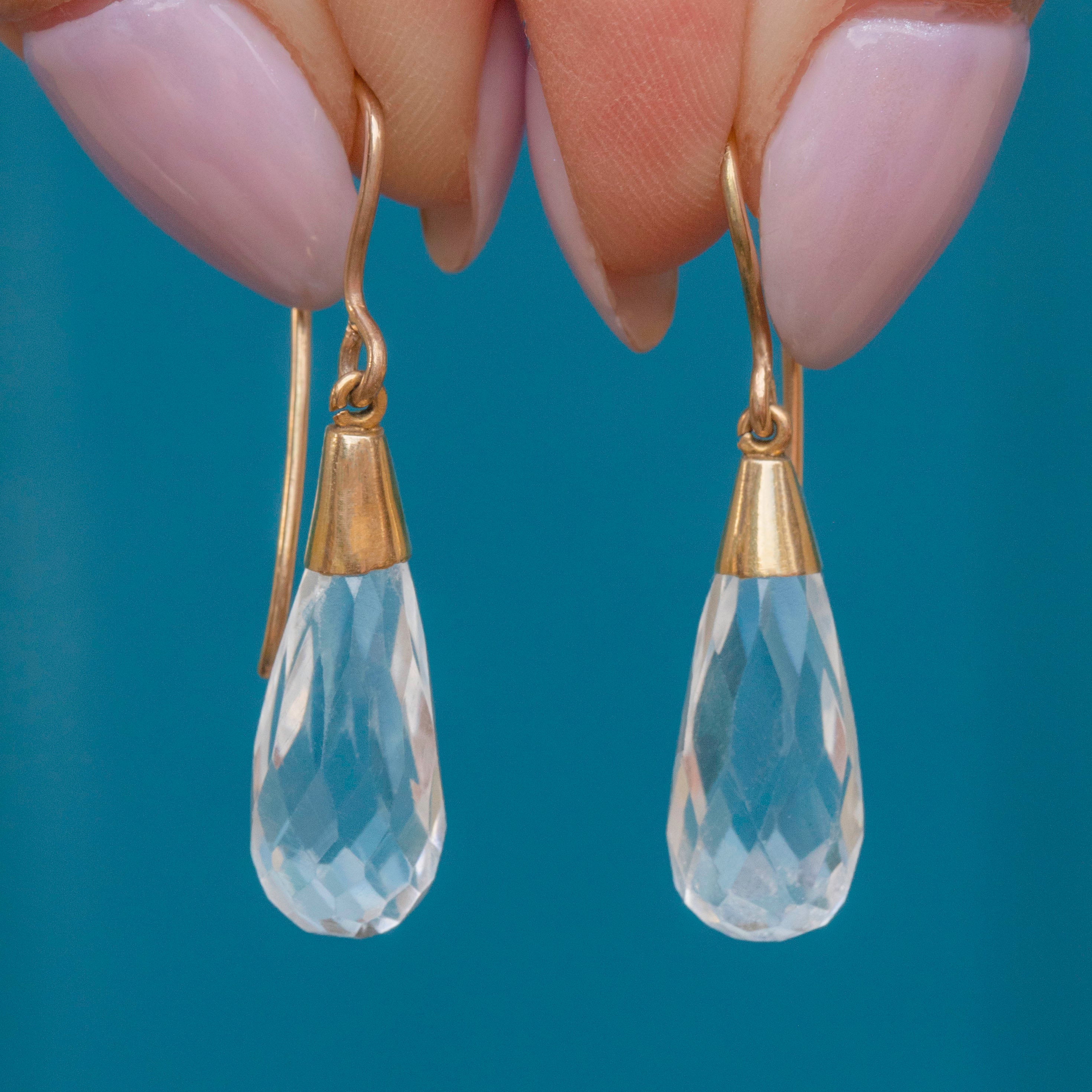 Watch as the light dances off these antique 15ct Gold faceted Rock Crystal earrings! The briolette cut of their Rock Crystals are carved to perfection, creating a sophisticated earring drop that can accompany any outfit with ease.