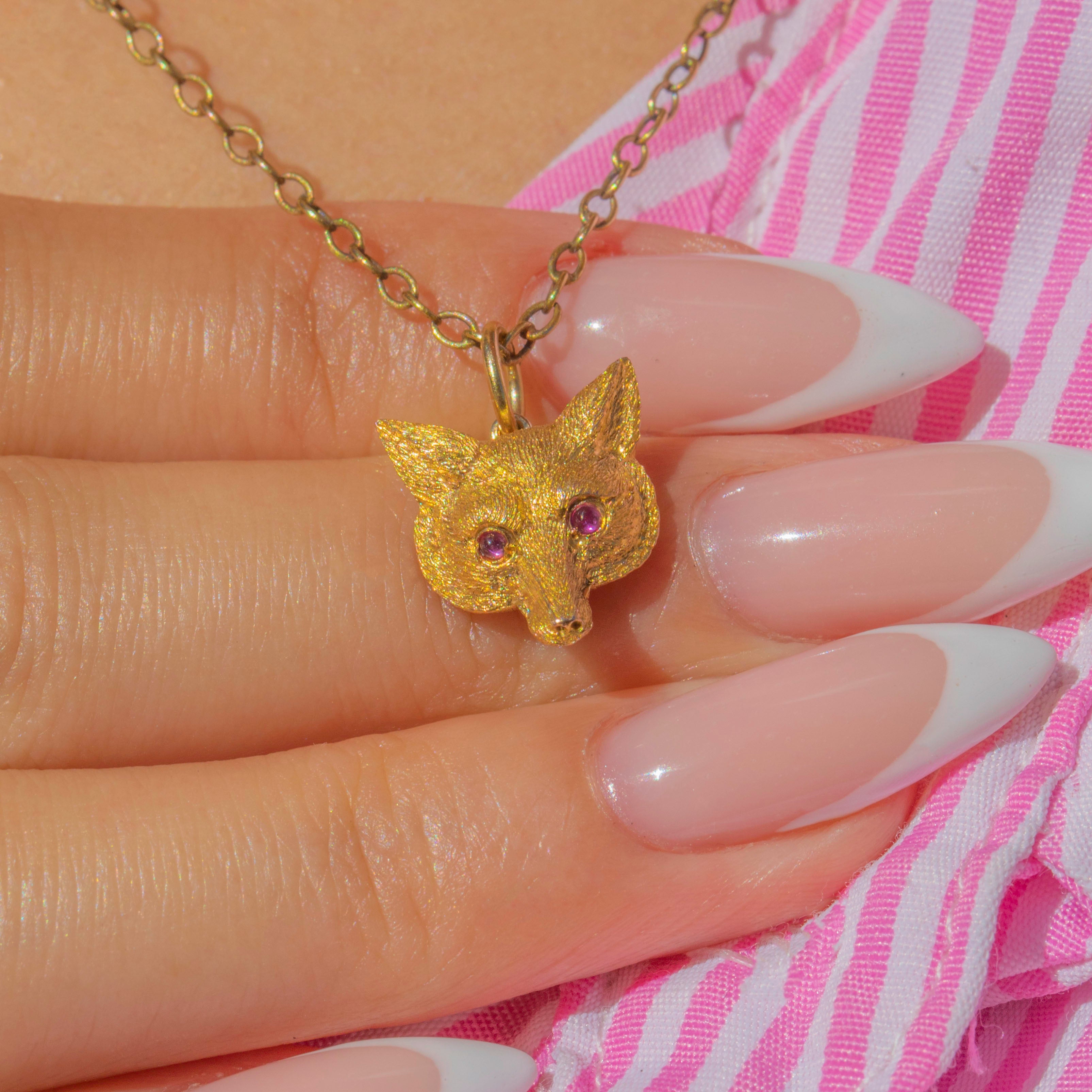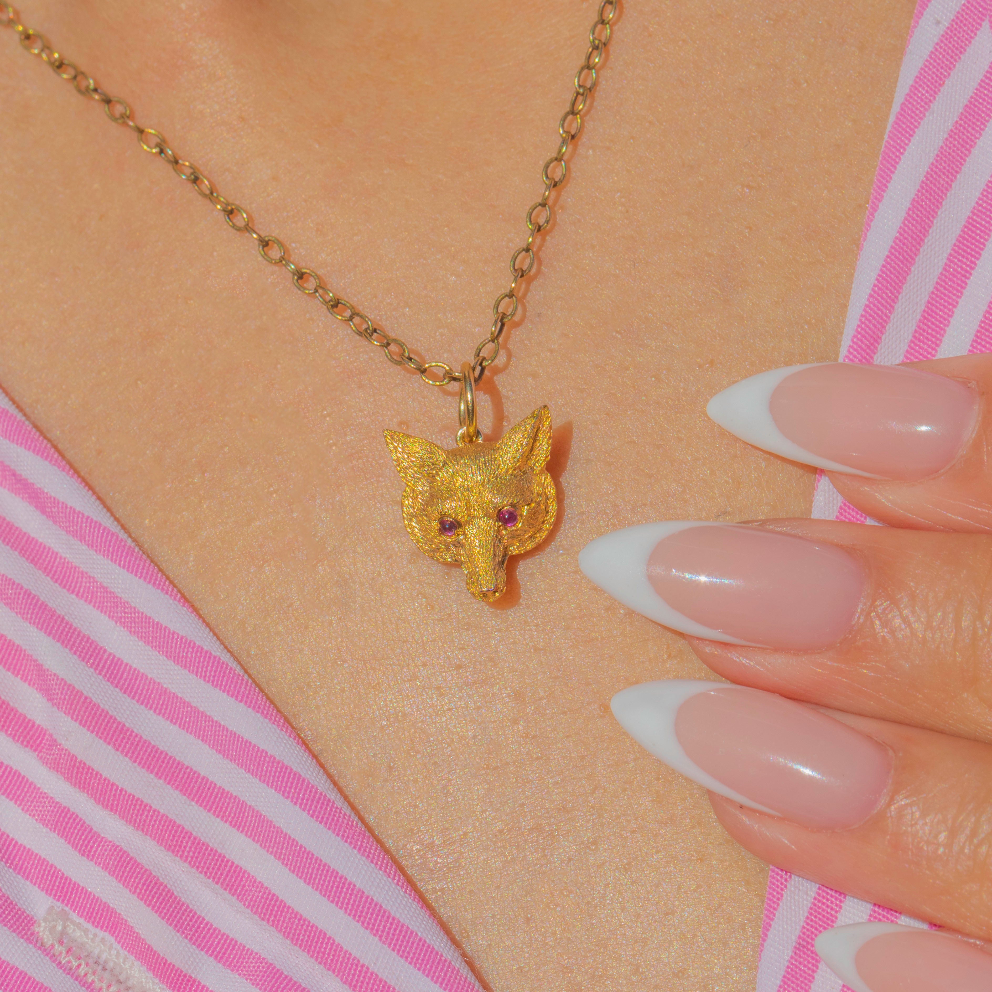 This Antique Victorian charm is crafted in 15ct Gold and modelled as a finely detailed fox head. The fox’s sharp features are brought to life with incredible texture, while a pair of glowing Ruby eyes add a vivid pop of colour and character. Symbolising cleverness and adaptability, fox motifs were a popular subject in Victorian jewellery, often worn as talismans of wit and resourcefulness.