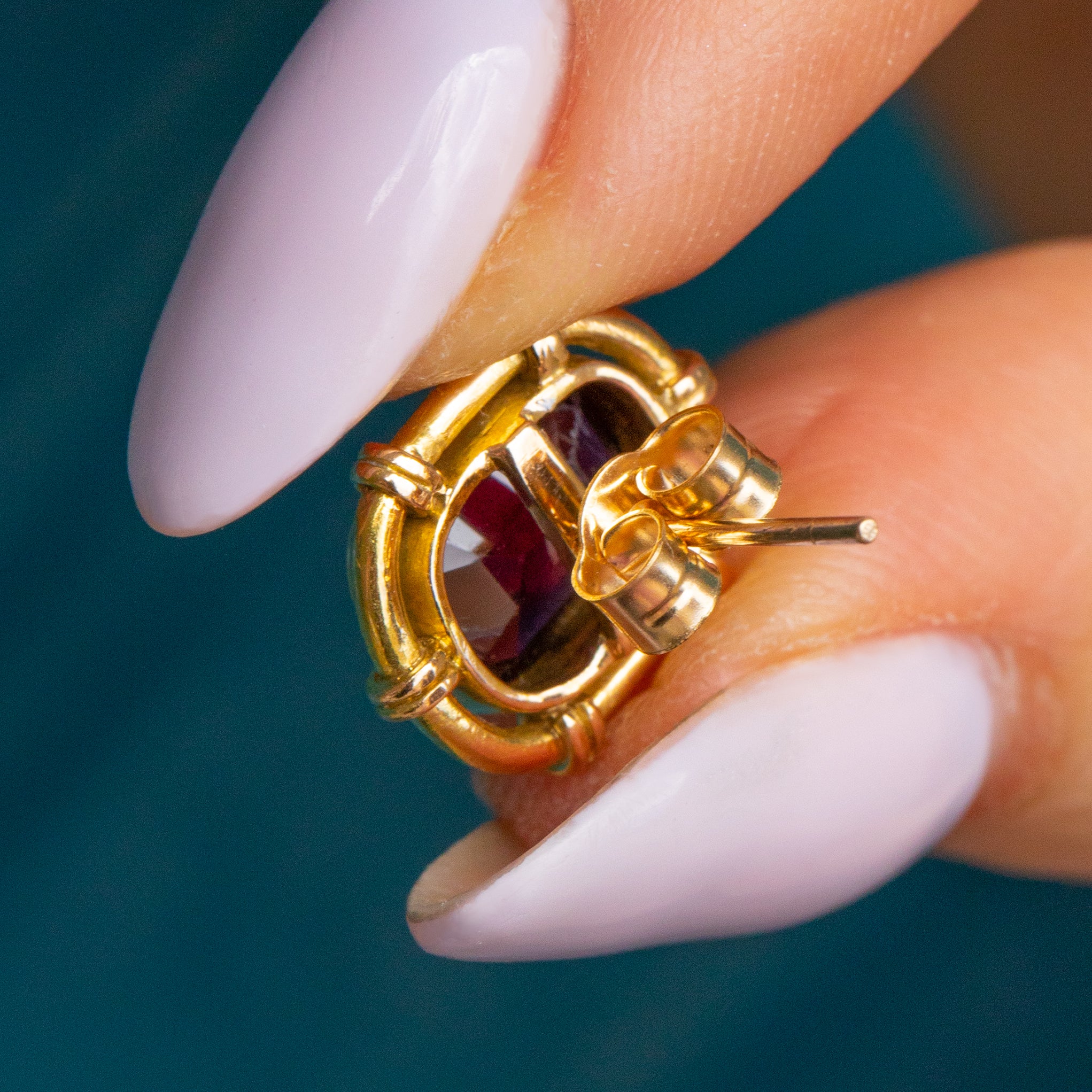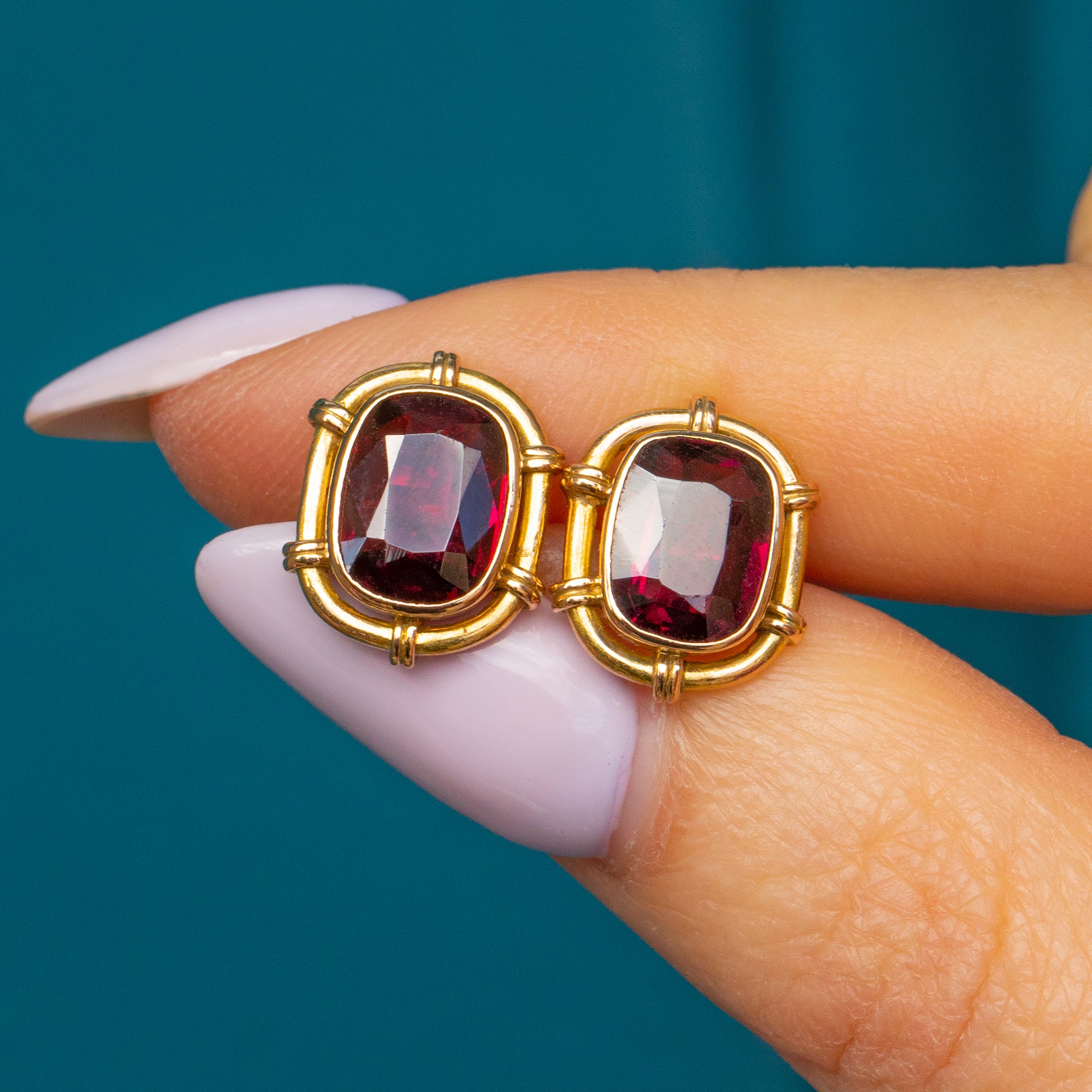 Garnets are 8.5mm long x 6.5mm wide x 3.5mm deep, weighing approx. 7.74ct combined.