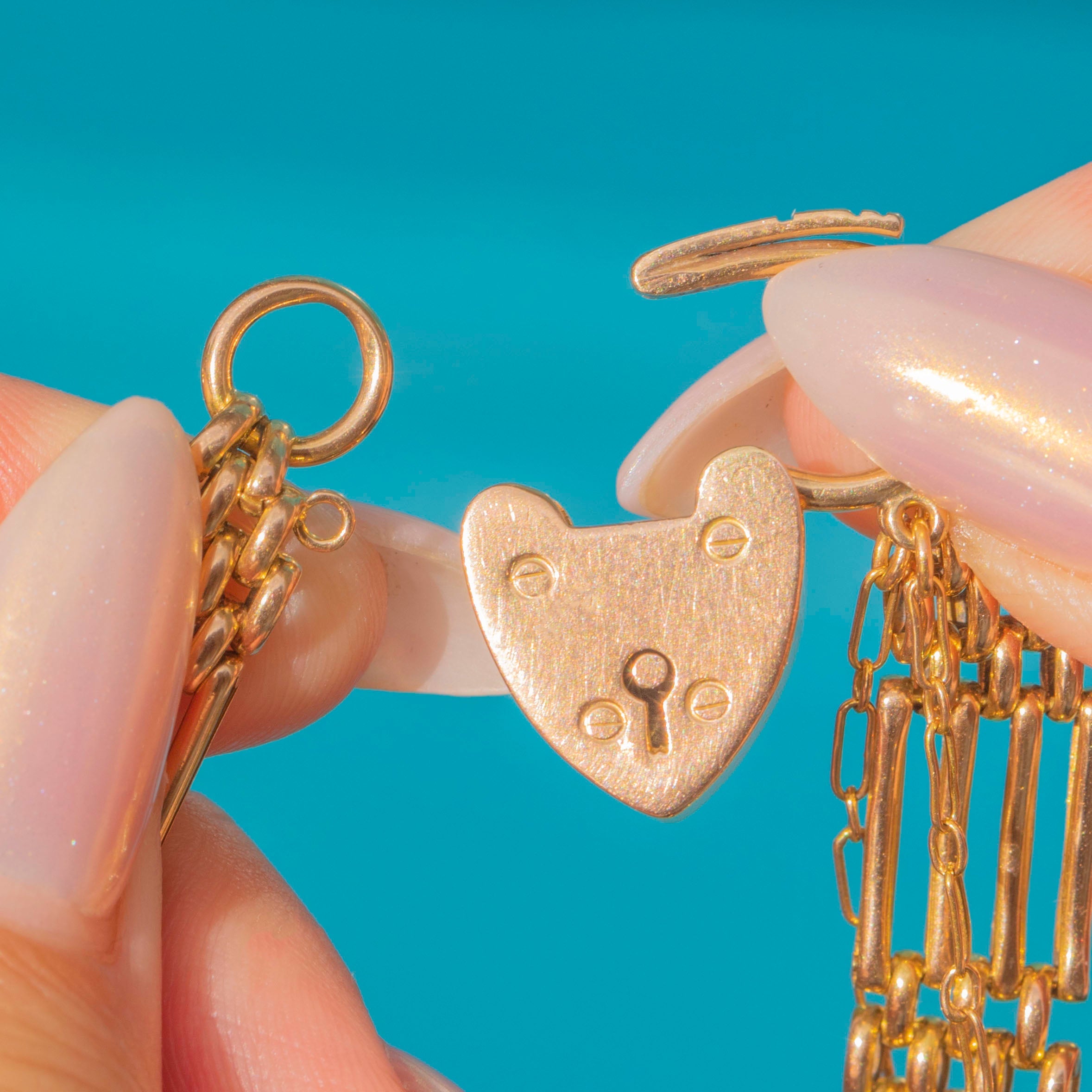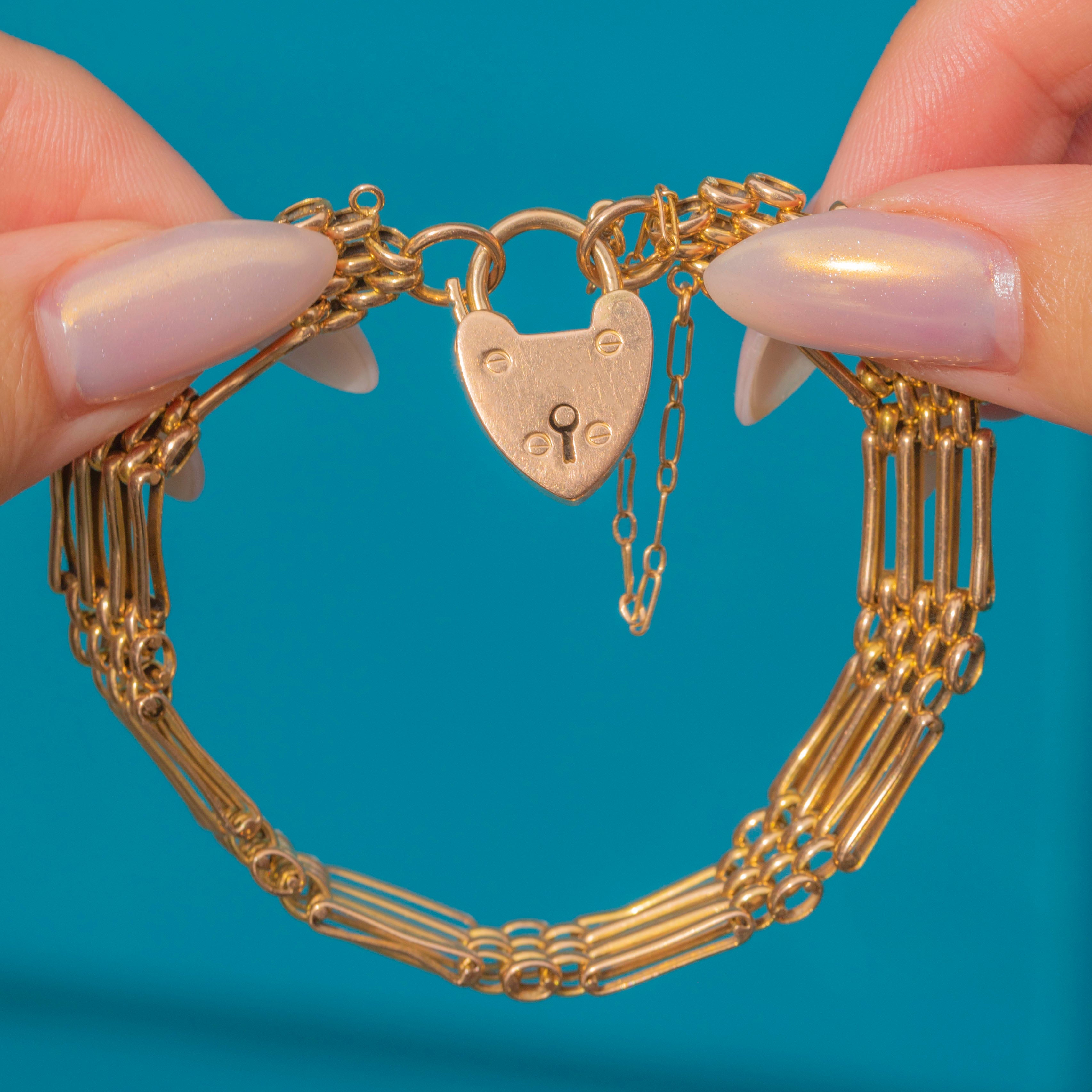 アンティーク15ctゴールド ゲートブレスレット、ハートパドロック、13.6g