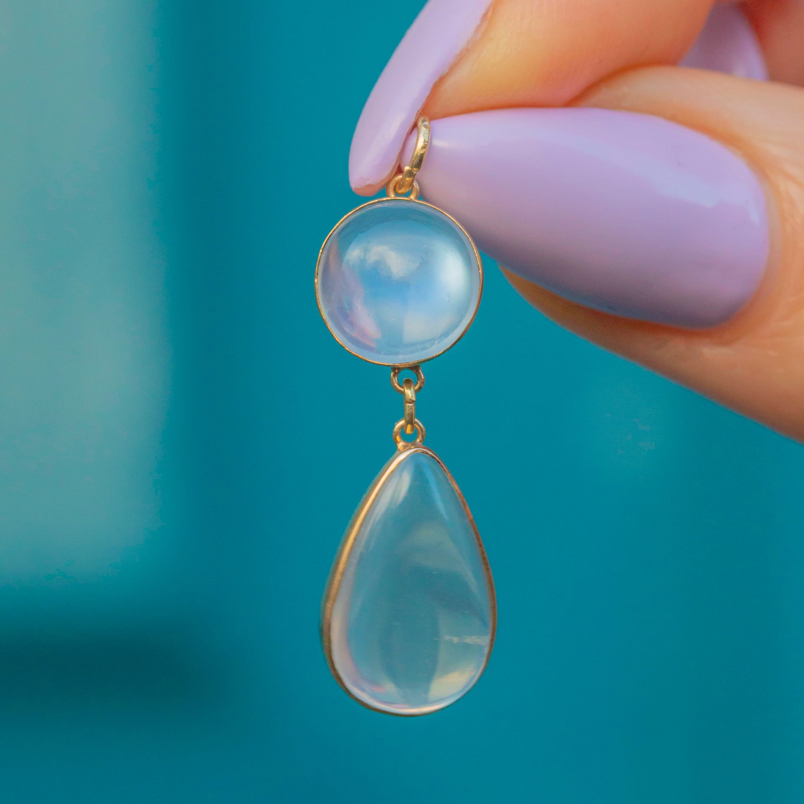 VERY GOOD-EXCELLENT. This Victorian 15ct Gold Moonstone drop pendant is in superb addition. Each Moonstone has a lovely glow, with only minor surface wear, which is difficult to spot without a jeweller's loupe. The rare 15ct Gold is buttery and holds the Moonstones securely in place. With a secure jump ring, you can wear her with confidence!