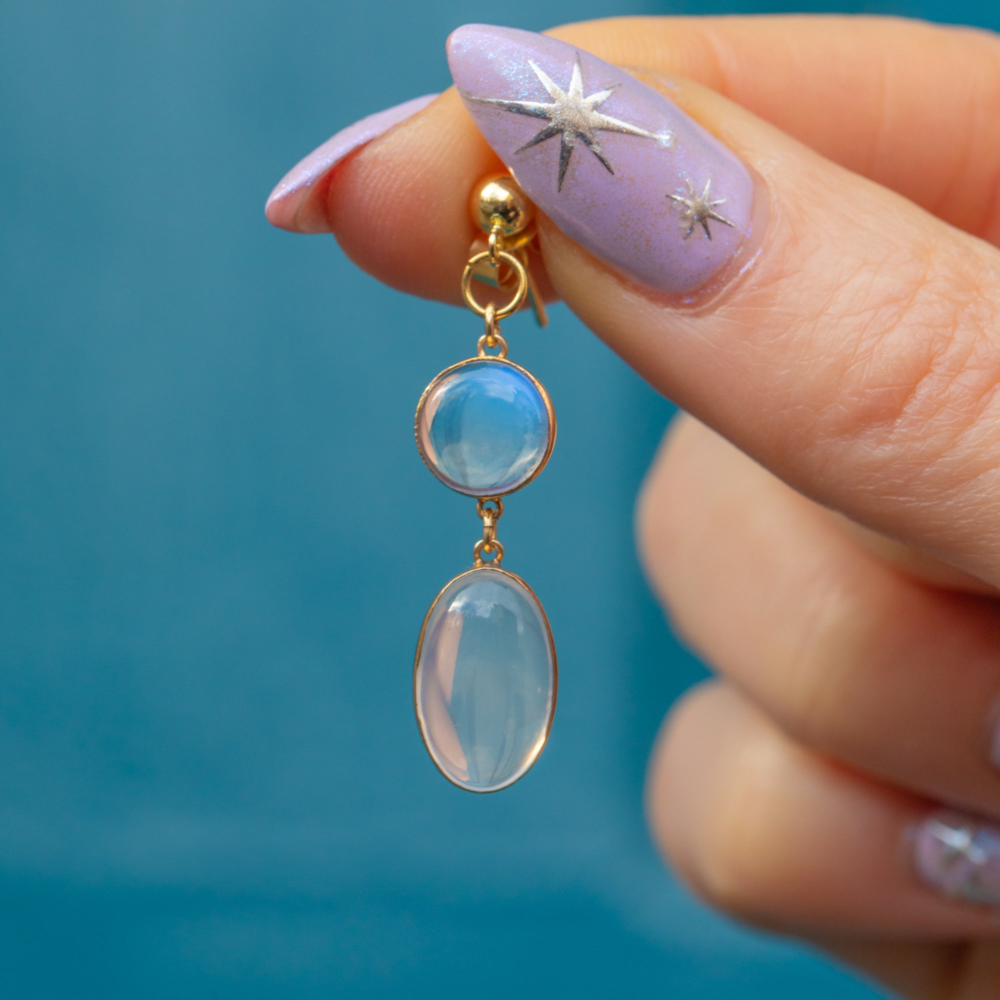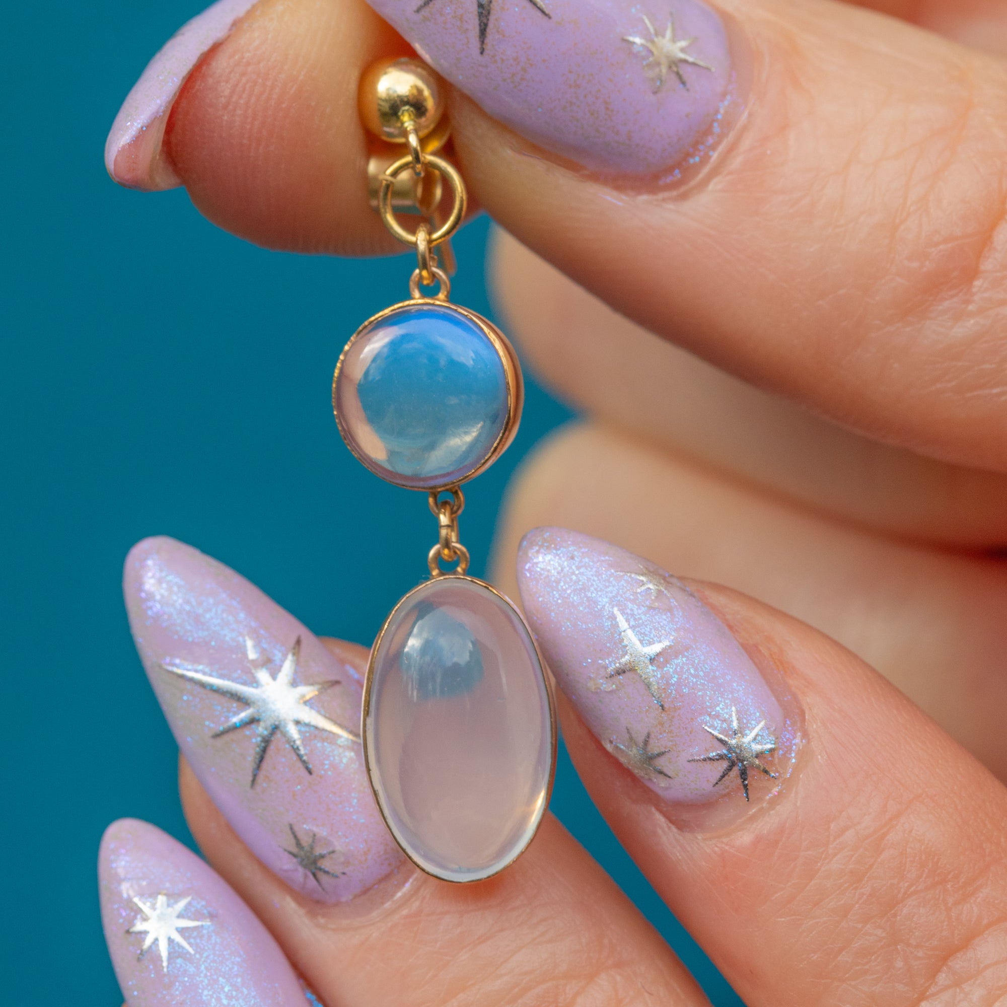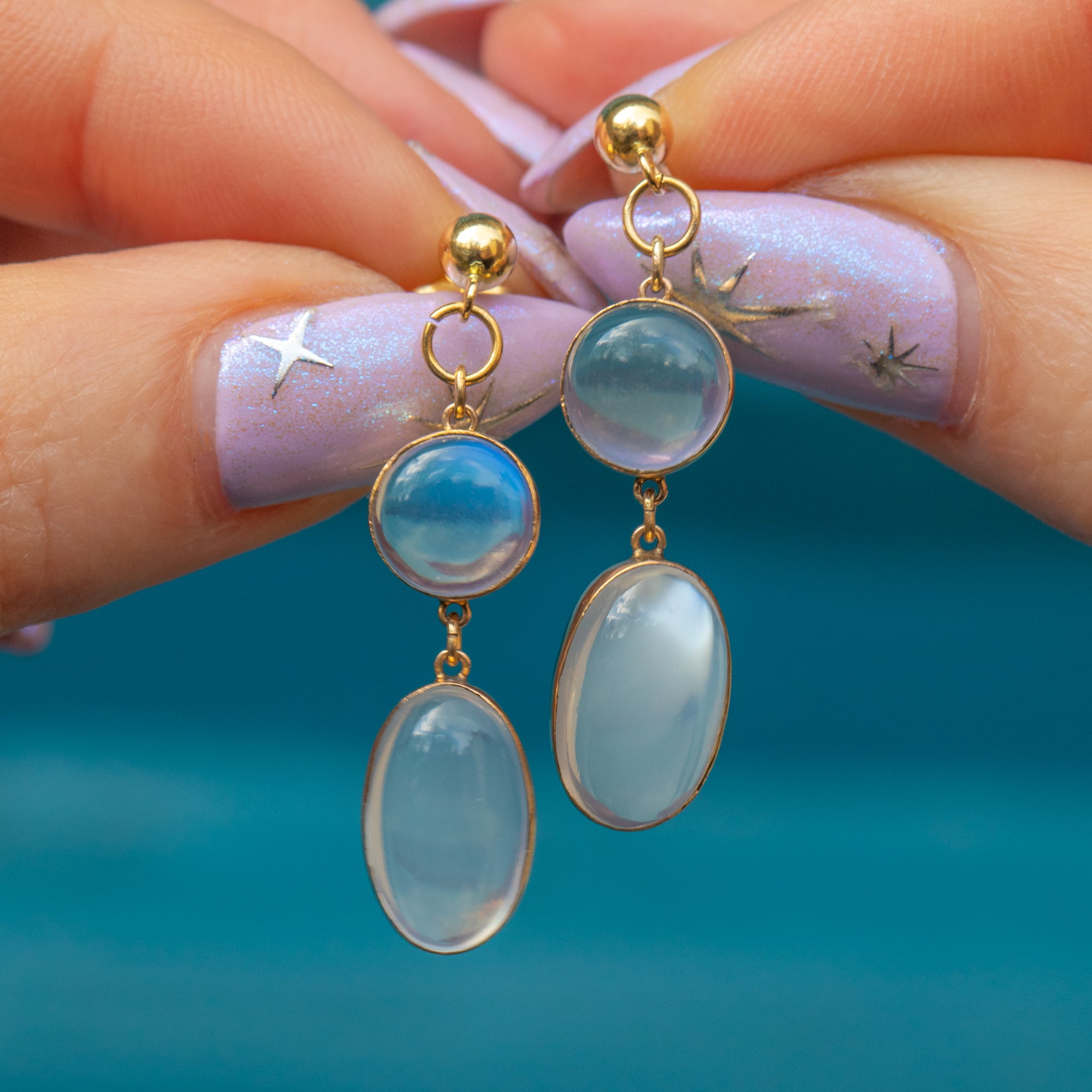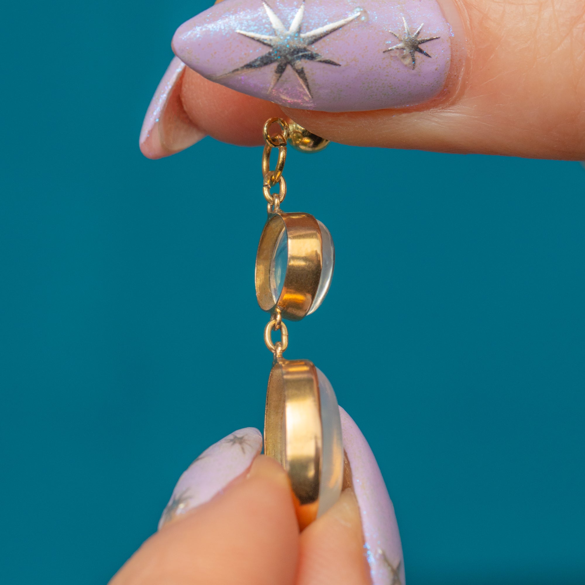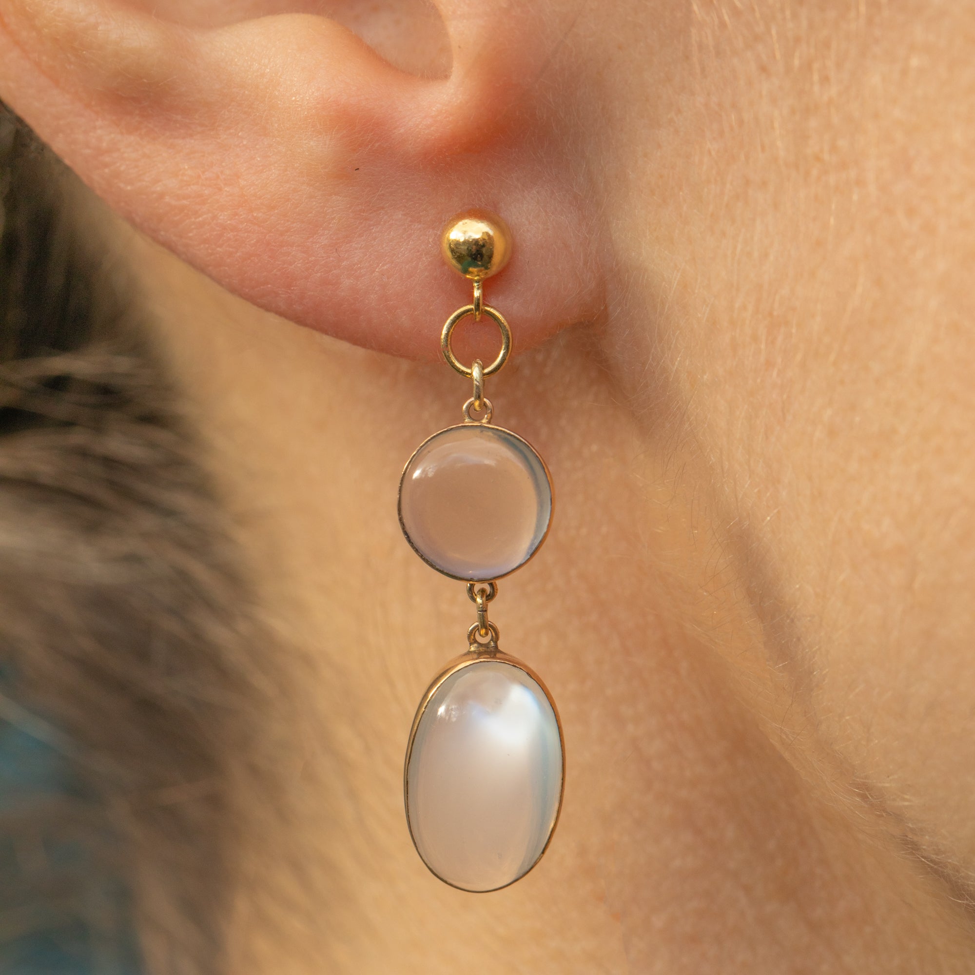 Each drop earring features two plump Moonstones with a stunning adularescence as they catch the light. They sit securely within buttery 15ct Gold bezel settings, with the warmth of the Gold effortlessly complementing the cool tones of the Moonstones.