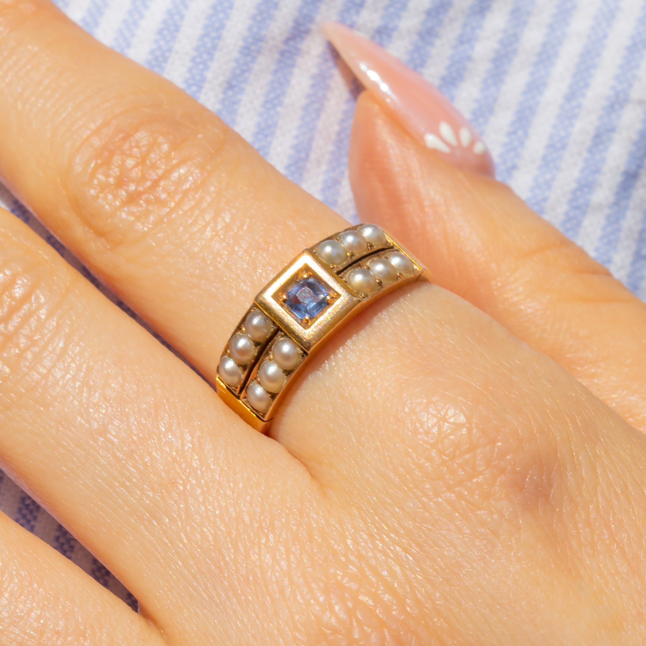Bursting with Victorian beauty, this antique 15ct Gold natural Sapphire Pearl ring is a must-have for your collection! The 15ct Gold ring band is studded with a double row of shimmering, smooth Pearls, centred by a 0.20ct cornflower blue Sapphire with a chunky Gold frame.