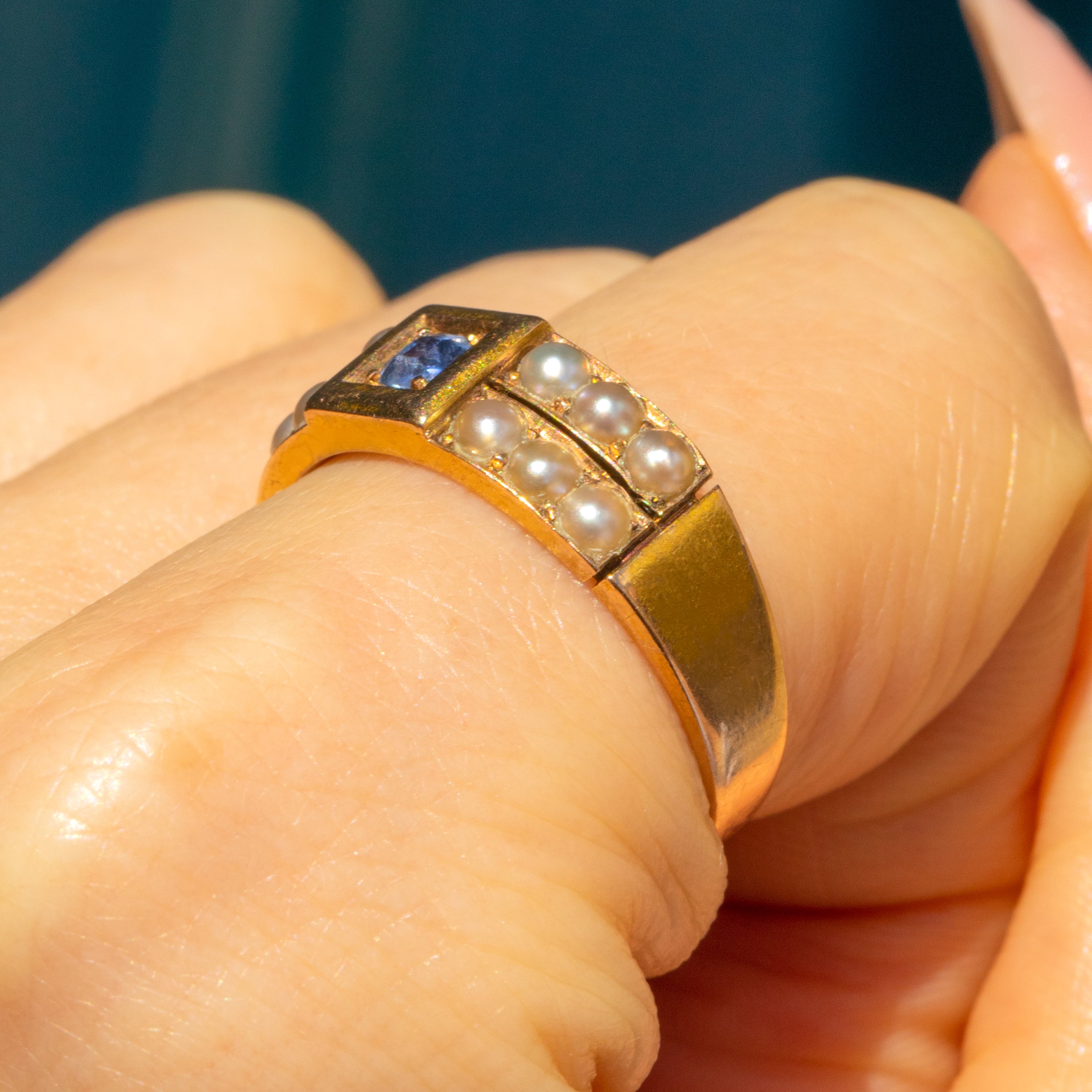 VERY GOOD. This antique 15ct Gold natural Sapphire Pearl ring is in very good condition! The Sapphires and Pearls are set securely within their settings and their soft glisten compliment each other perfectly. There is some wear to the one of the facets on the Sapphires, but this isn't noticeable to the naked eye. The ring band is well formed and glides onto your hand a dream. There is a slight variation to the Gold tone from where she has been previously resized but this is smooth and sits to the back of the band so can't be seen while worn!