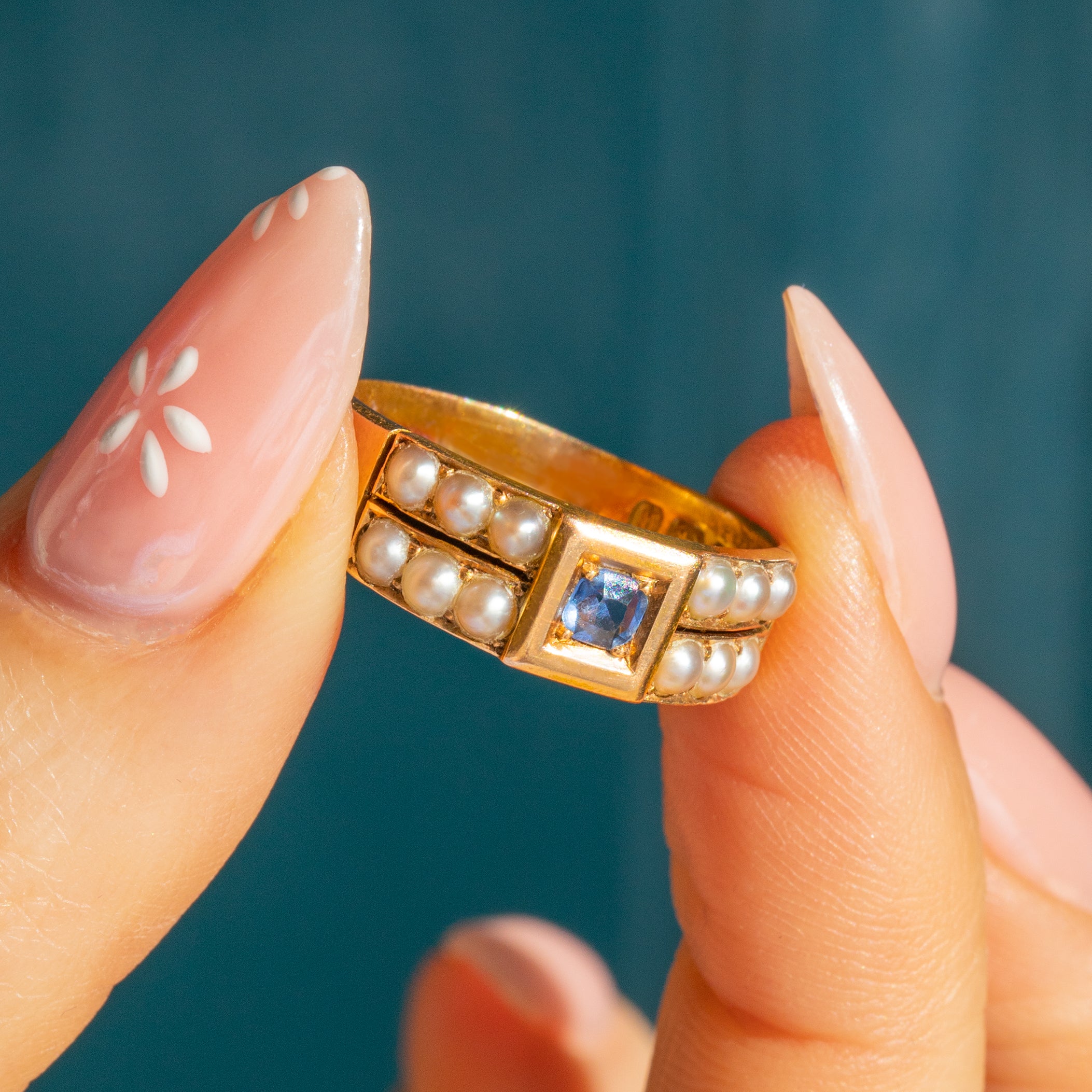 MATERIALS: Tests as 15ct Gold throughout, Sapphire (0.20ct), Pearls.