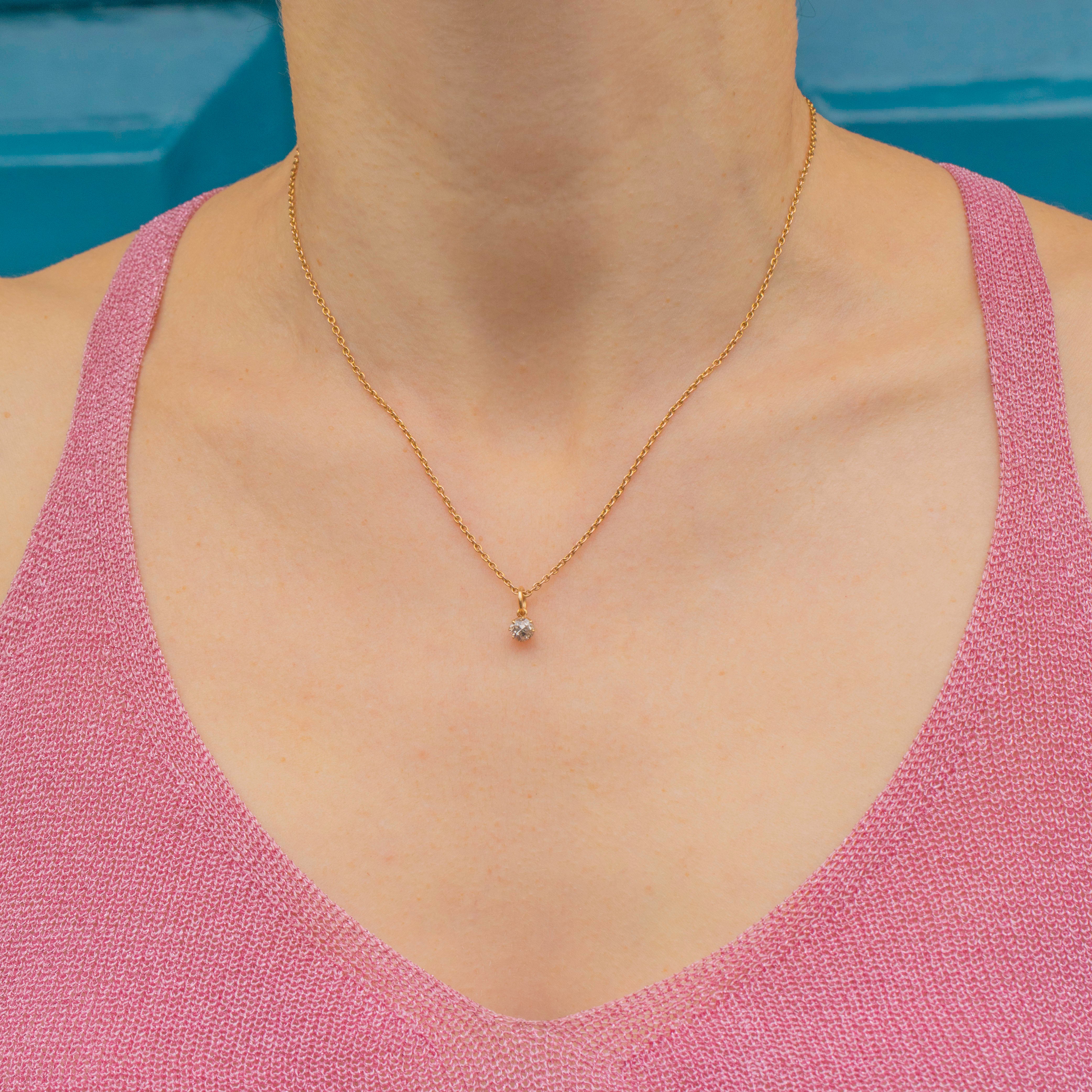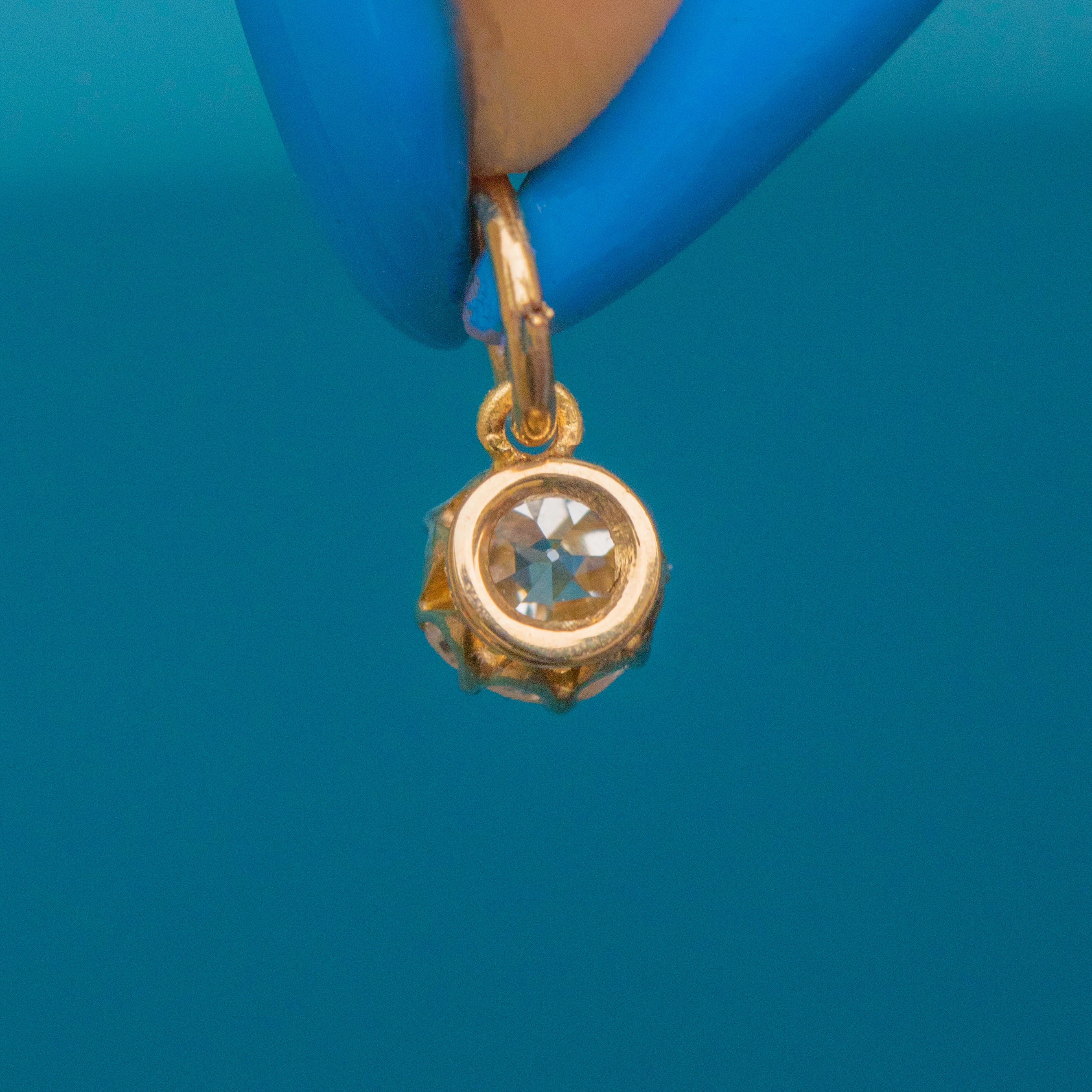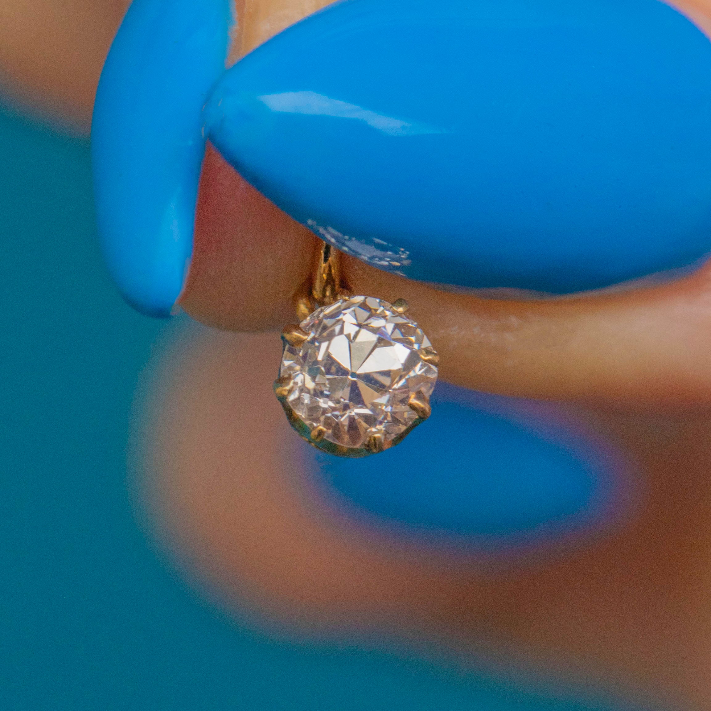 EXCELLENT. This gorgeous antique 15ct Gold Old-European Diamond charm is in excellent condition! This stunning Diamond is secure within her 15ct Gold setting, and is comepletely free from fleabites or abrasions! The Gold is bright and the jump ring will allow you to attach her to a skinny Gold chain and wear with the utmost confidence.