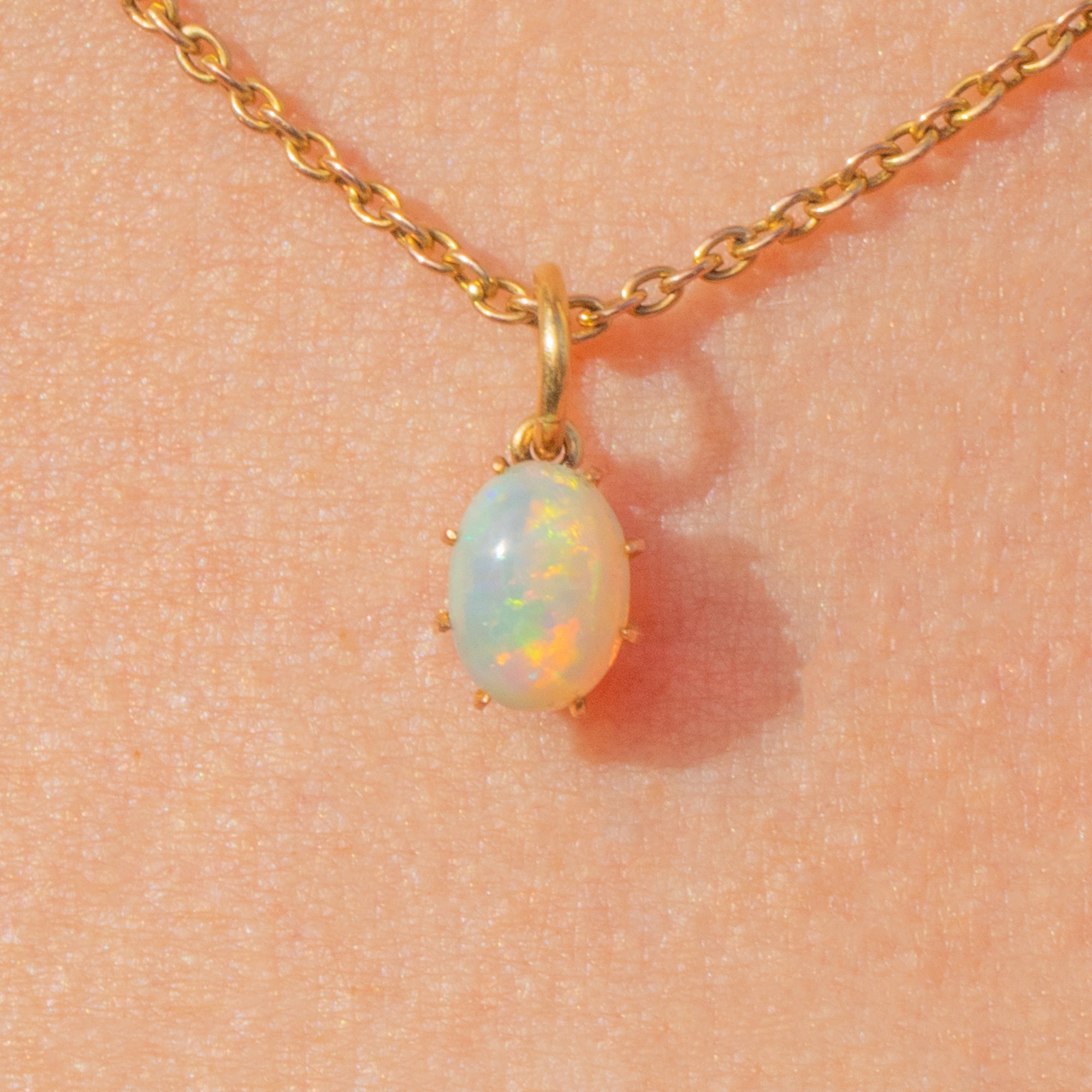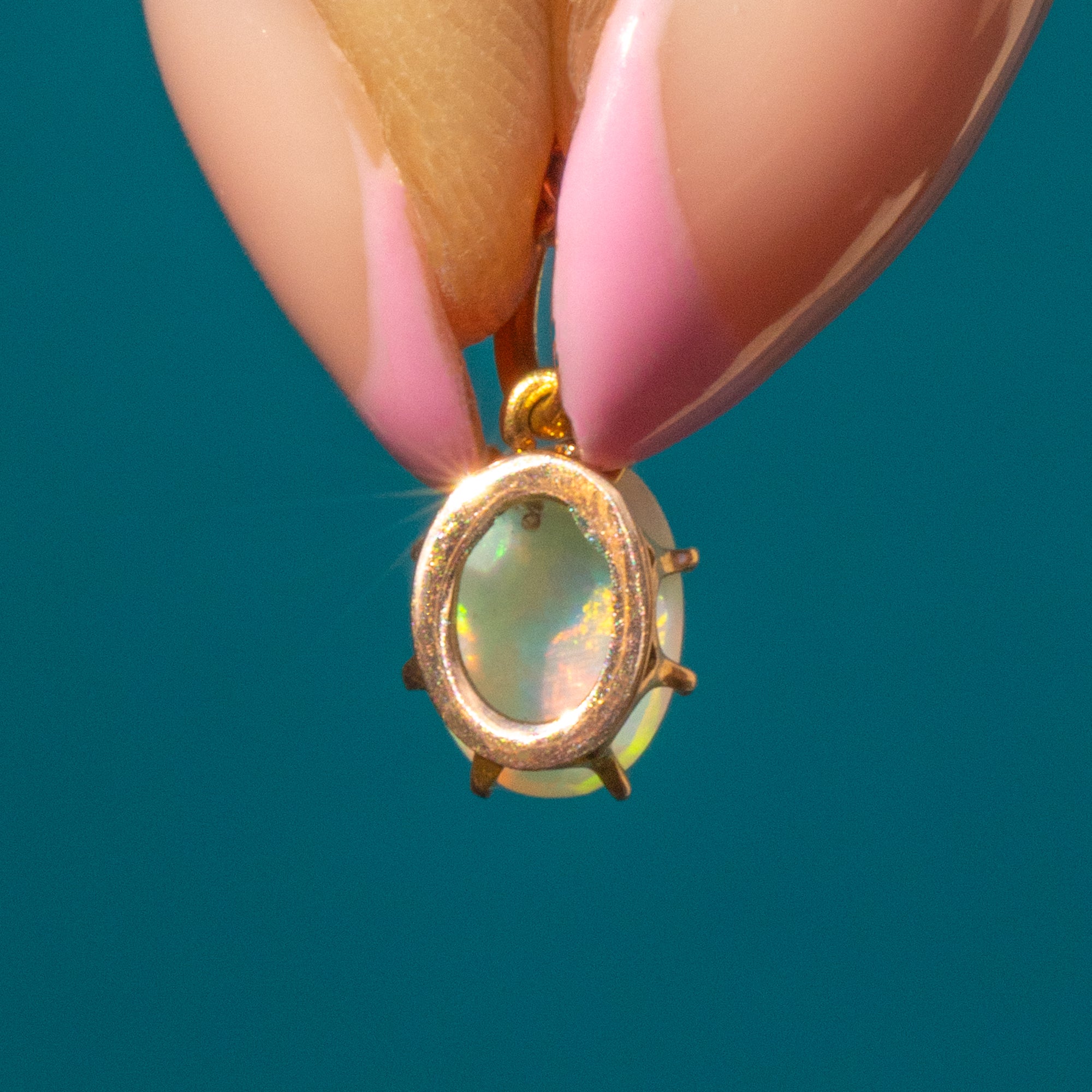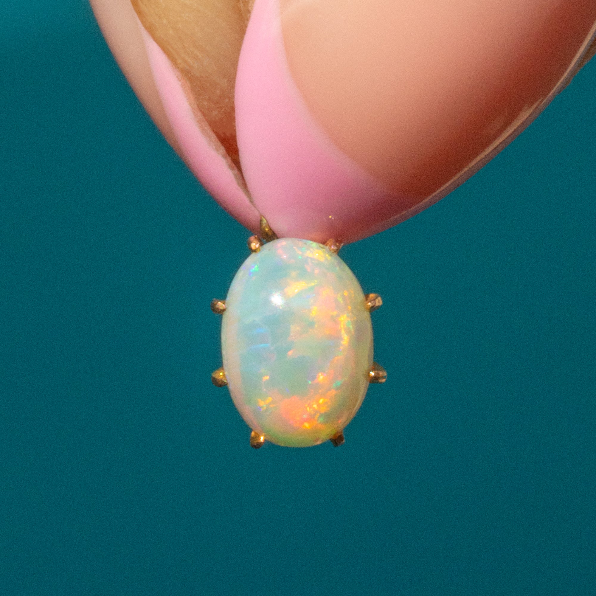 VERY GOOD-EXCELLENT. This antique 15ct Gold Opal charm is a delight. The Opal is smoothly domed and secure in its bezel setting, with only one tiny nick on the left of the piece, but this is only visible up close. The Gold is brightly saturated and the claws are all present. Complete with a generously sized jump ring, you can suspend this dainty treasure form a chain with ease!