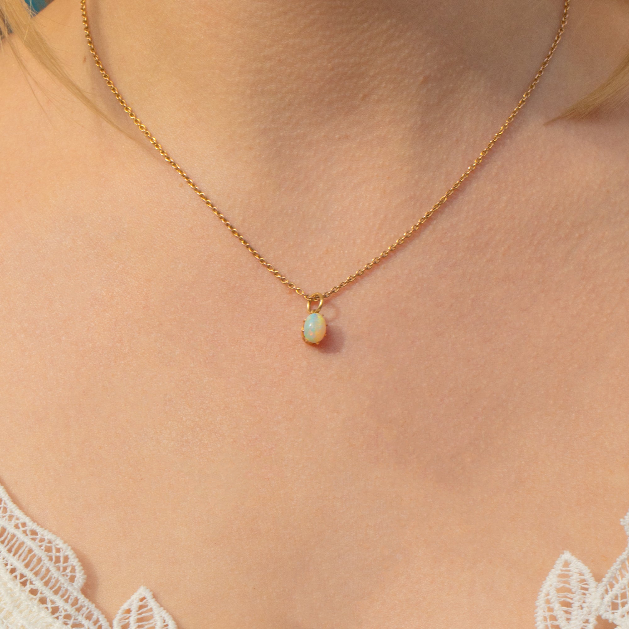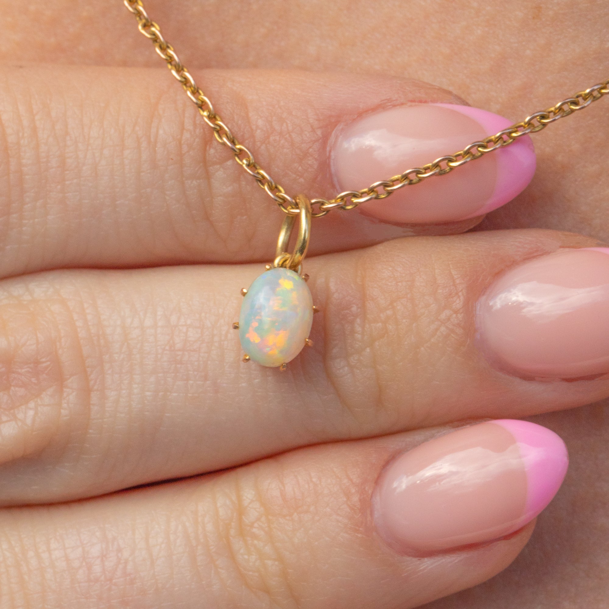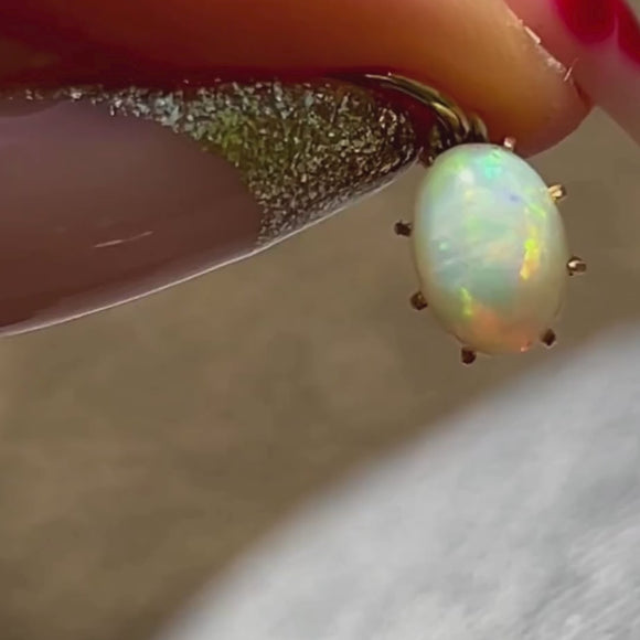 VERY GOOD-EXCELLENT. This antique 15ct Gold Opal charm is a delight. The Opal is smoothly domed and secure in its bezel setting, with only one tiny nick on the left of the piece, but this is only visible up close. The Gold is brightly saturated and the claws are all present. Complete with a generously sized jump ring, you can suspend this dainty treasure form a chain with ease!