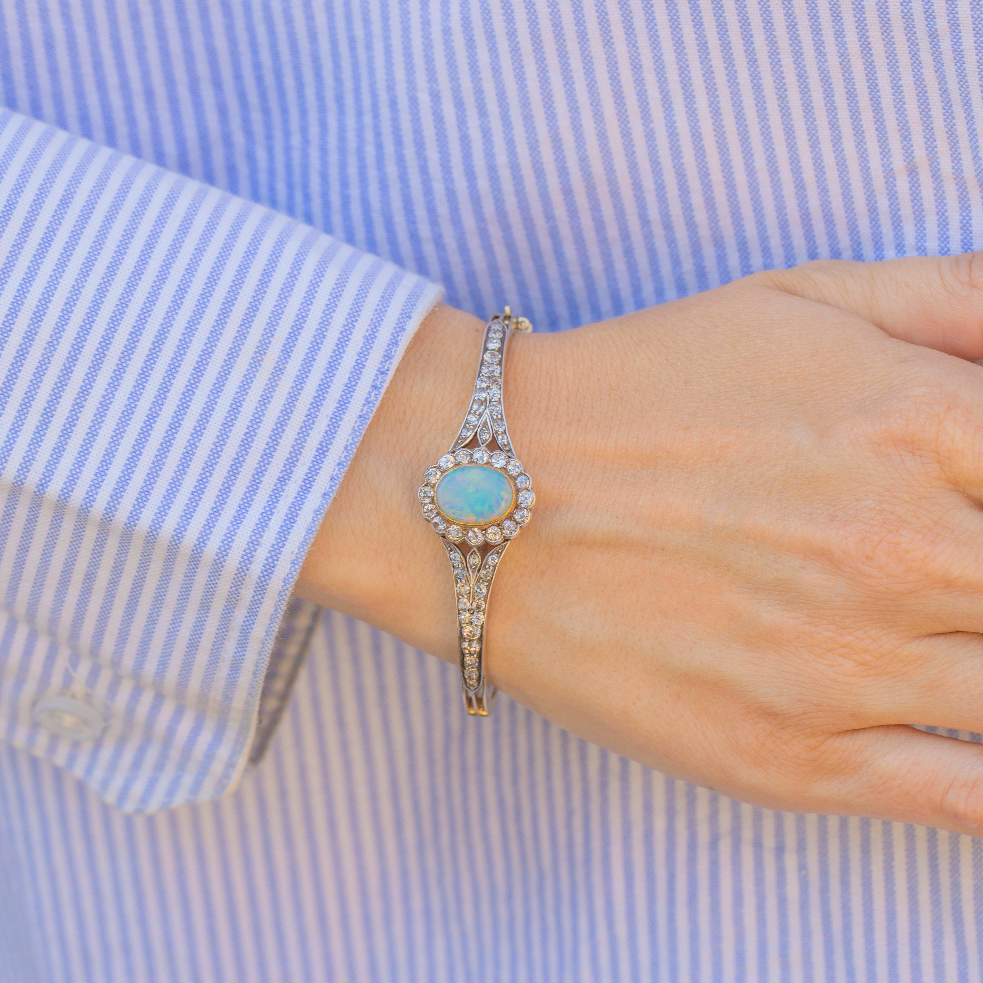EXCELLENT. This antique 15ct Gold Opal Diamond bangle is in excellent condition! The Opal and Diamonds are secure within their settings, with no damage to note. The Sterling Silver has a lovely patina in the grooves, enhancing the mesmerising glisten of the Diamonds. The 15ct Gold bangle is formed to perfection, with clean solder marks and a tongue clasp that allows you to wear with confidence. You are bound to be the belle of the ball with this Gold Diamond bracelet adorning your wrist!