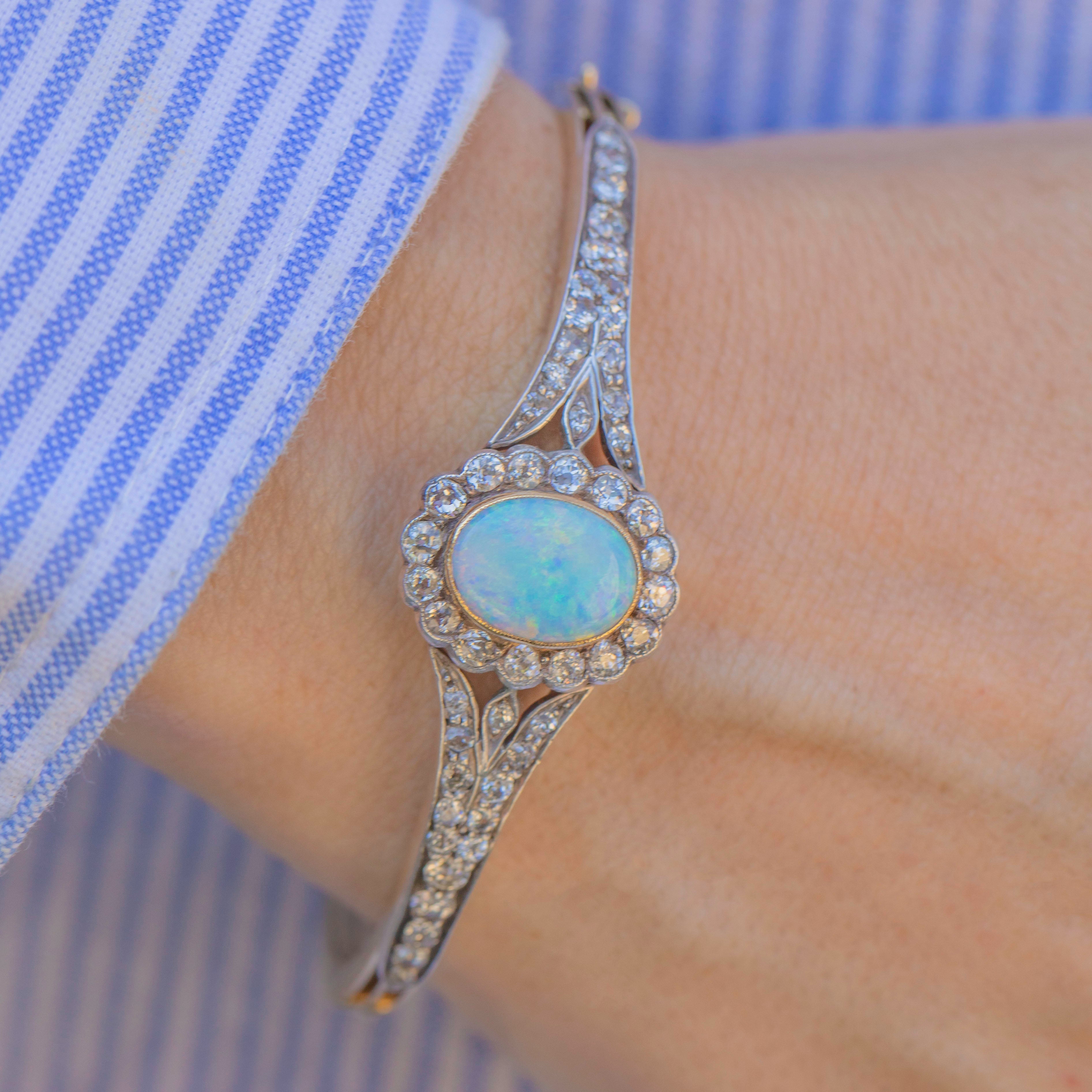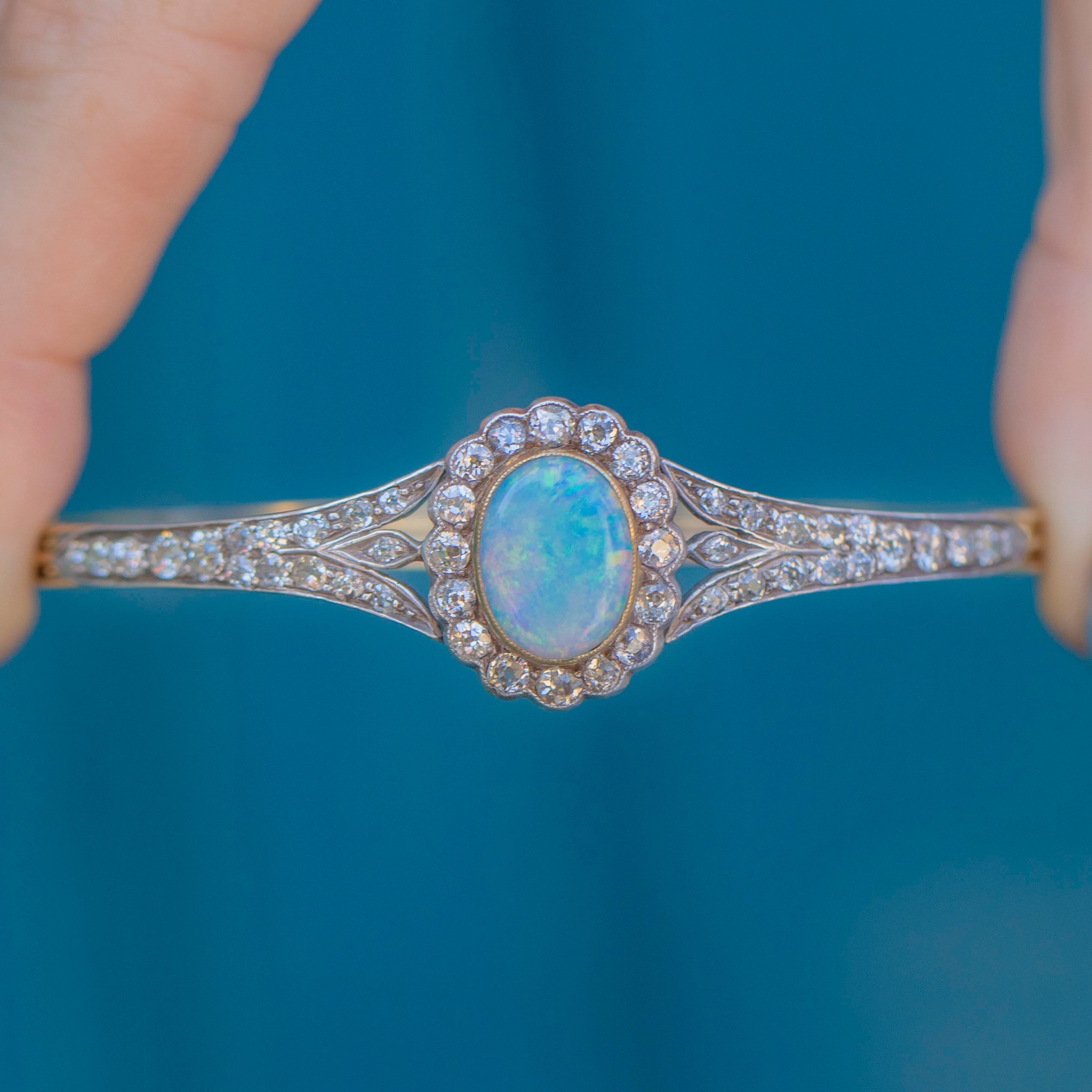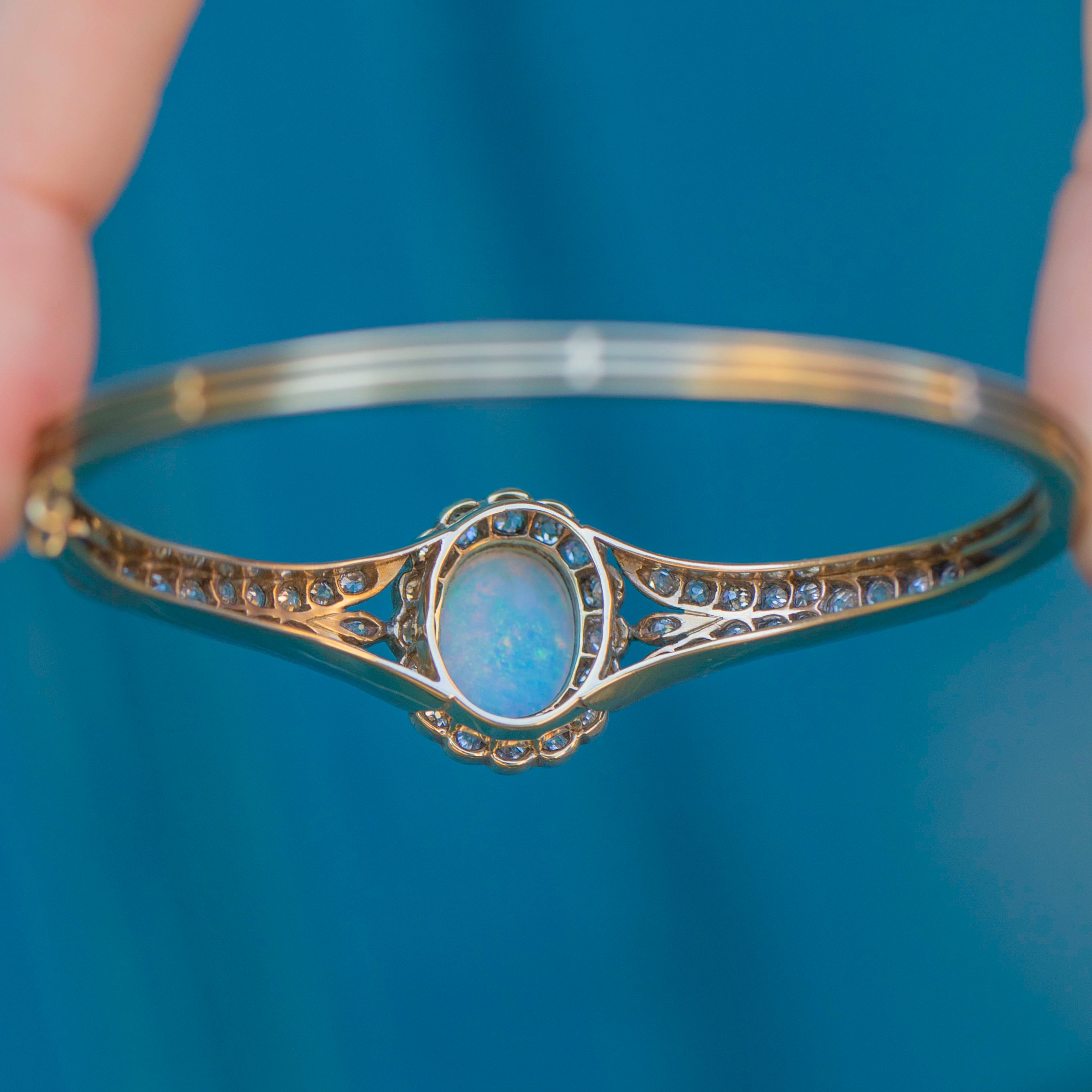 Antique 15ct Gold Opal Diamond Bangle, 1.90ct Diamonds