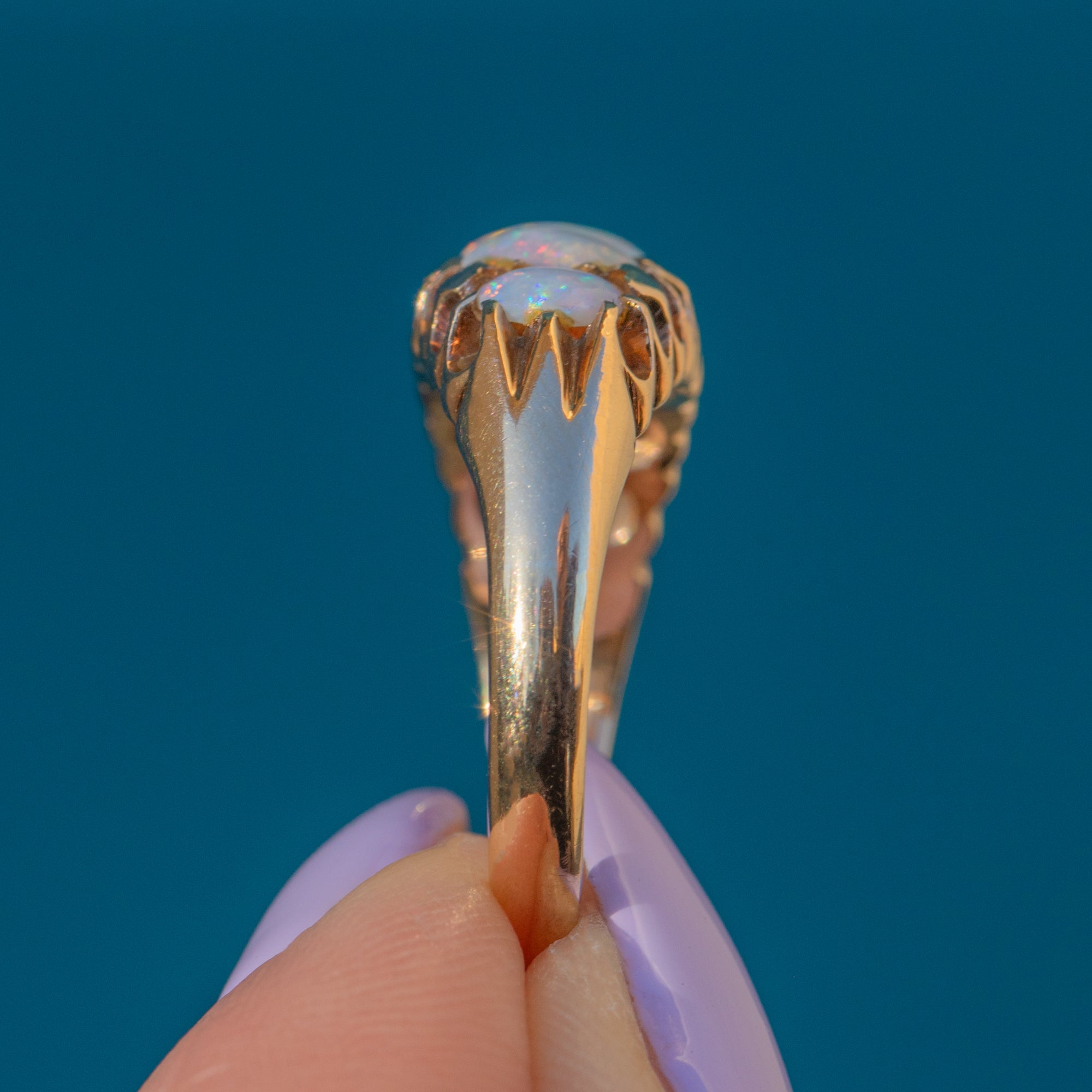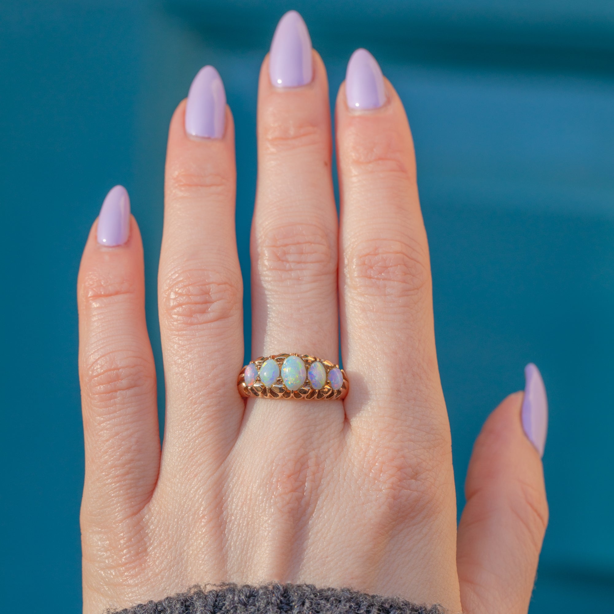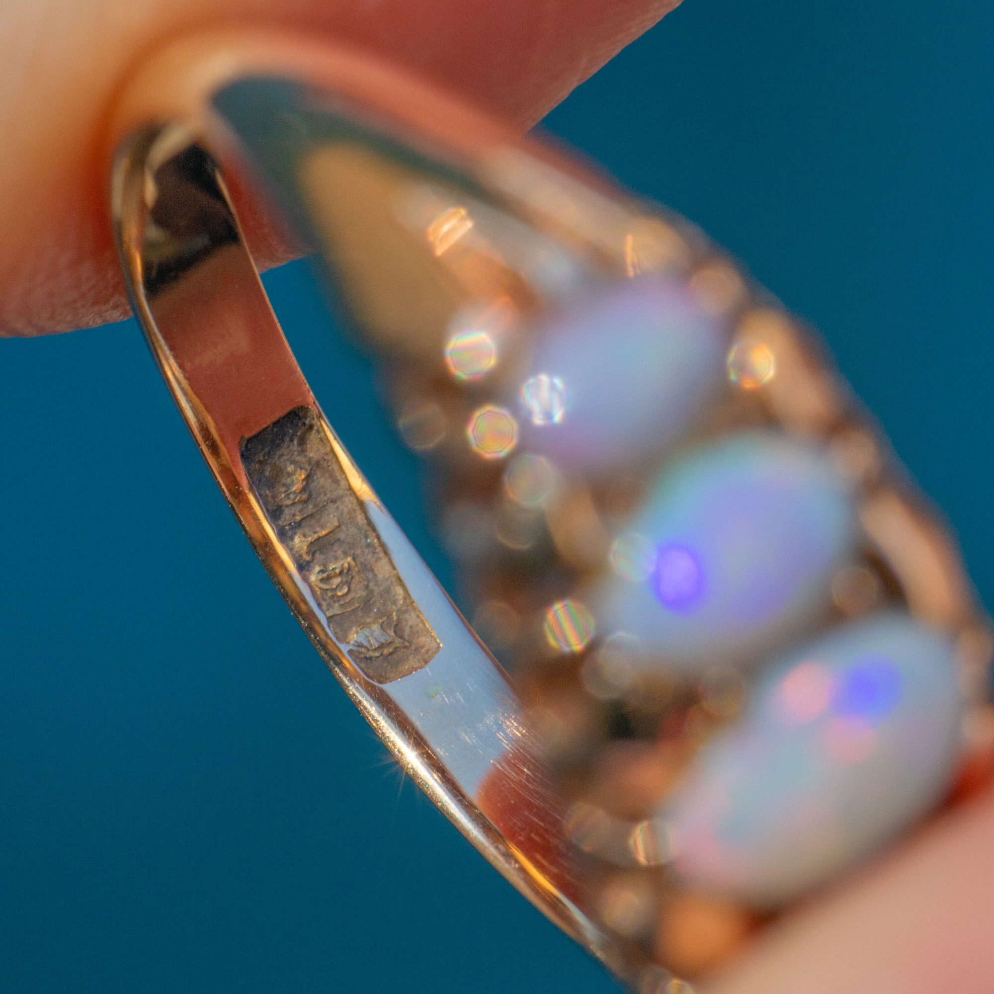 VERY GOOD-EXCELLENT. This antique 15ct Gold Opal five stone ring is in fantastic condition. The Opals are smooth and securley set, free from chips or scuffs. The Gold has an even saturation, and even though the hallmarks have worn over time, the rare Chester Assay stamp is still visible. With plenty of wear potential, don't hesitate to make this enchanting Victorian Opal ring your newest aquisition!