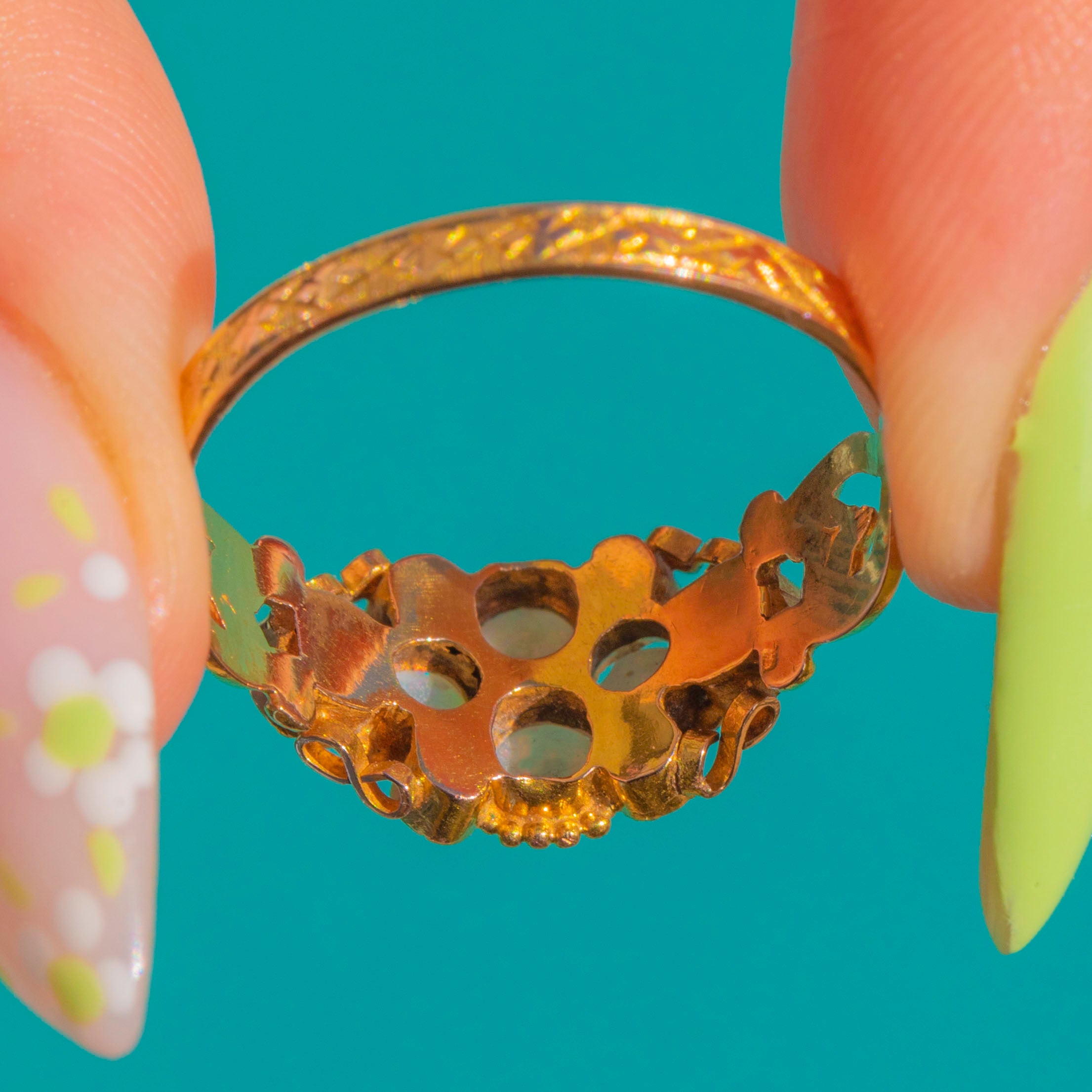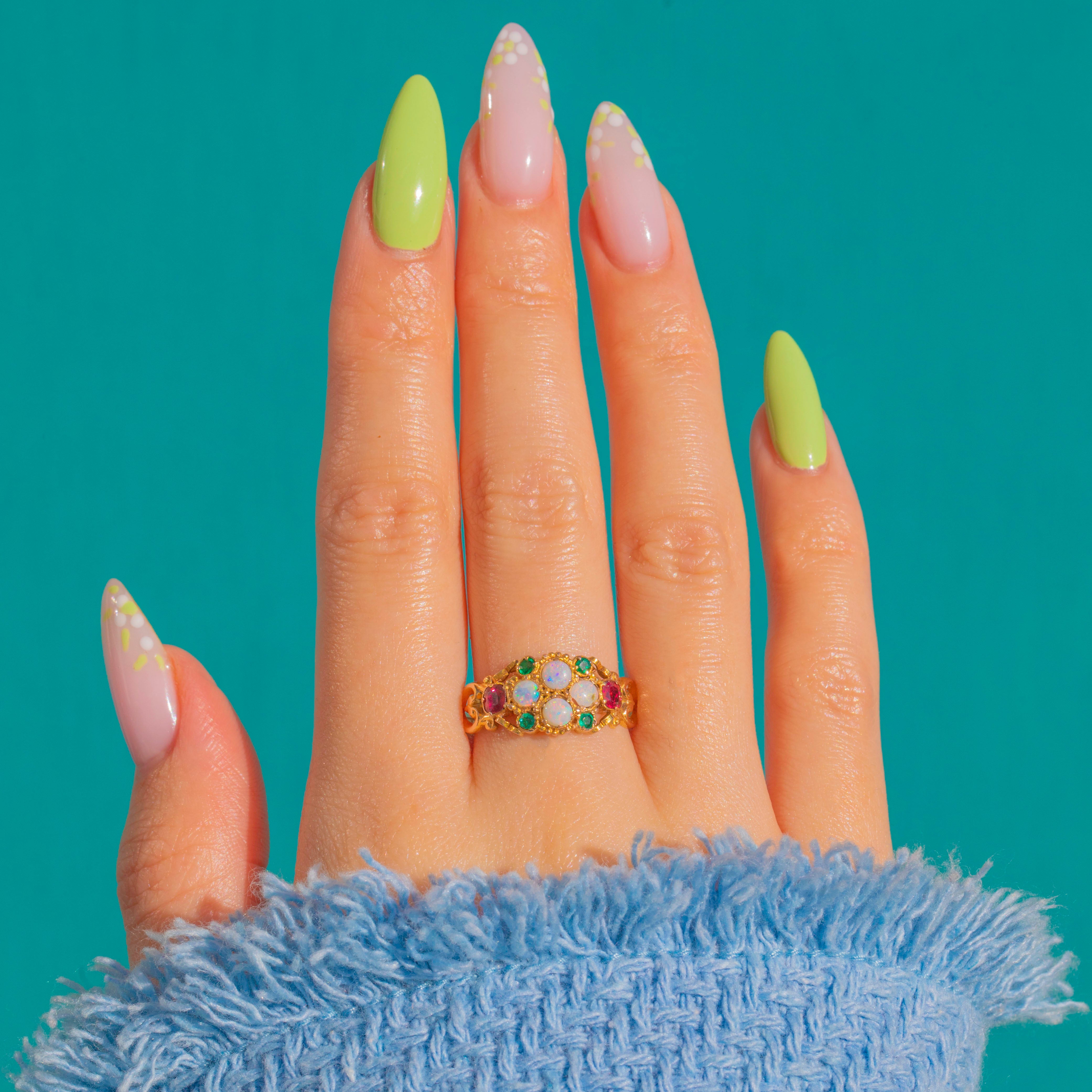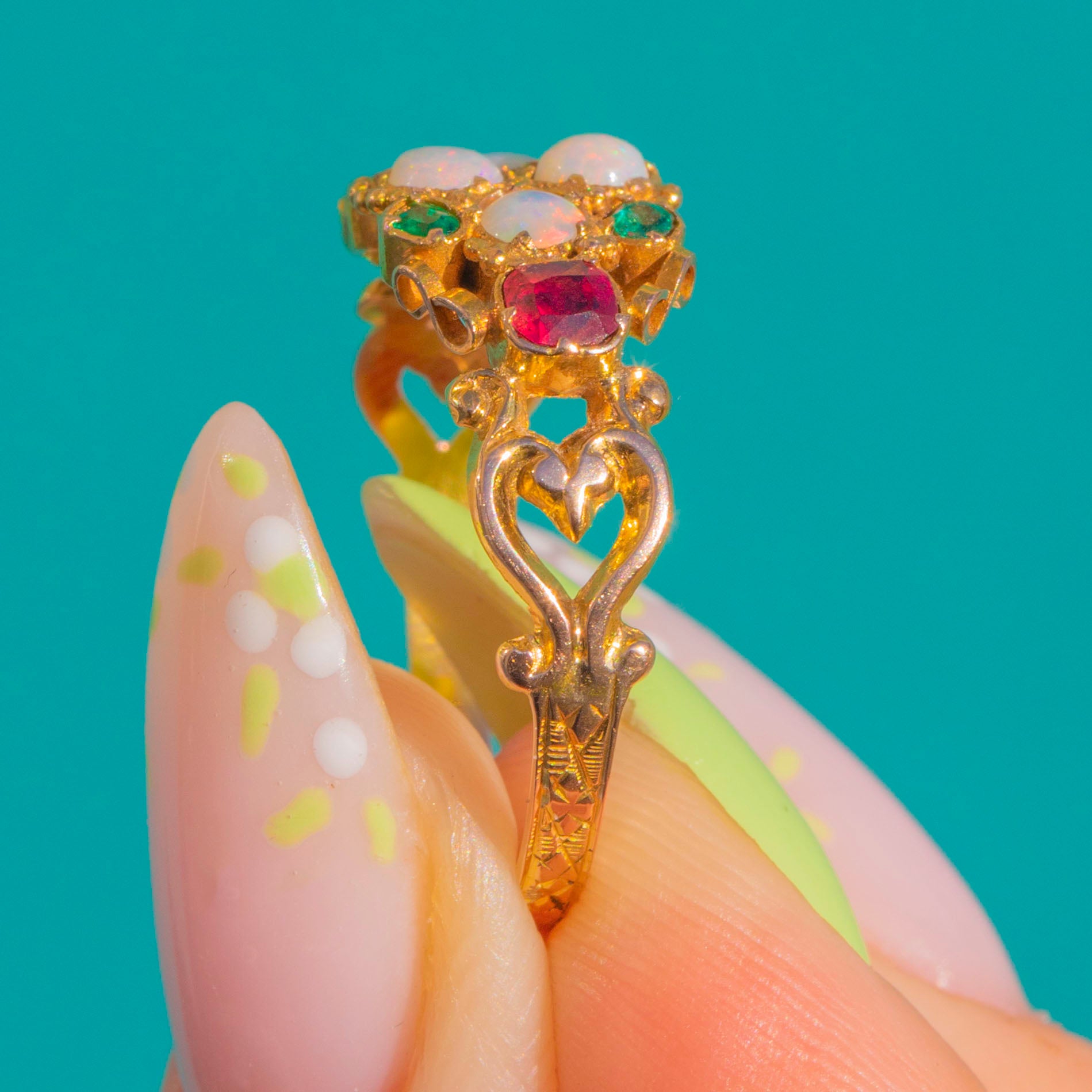 豊かな15ctゴールドに贅沢に仕立てられた、華やかなVictorianクラスターリング。柔らかな遊色効果を持つ4石のオパールが、ブルー、グリーン、ピンクの繊細な輝きを放ちます。鮮やかなエメラルドと、艶やかなルビー2石がアクセントとなり、19世紀らしいロマンティックな色彩美を演出しています。