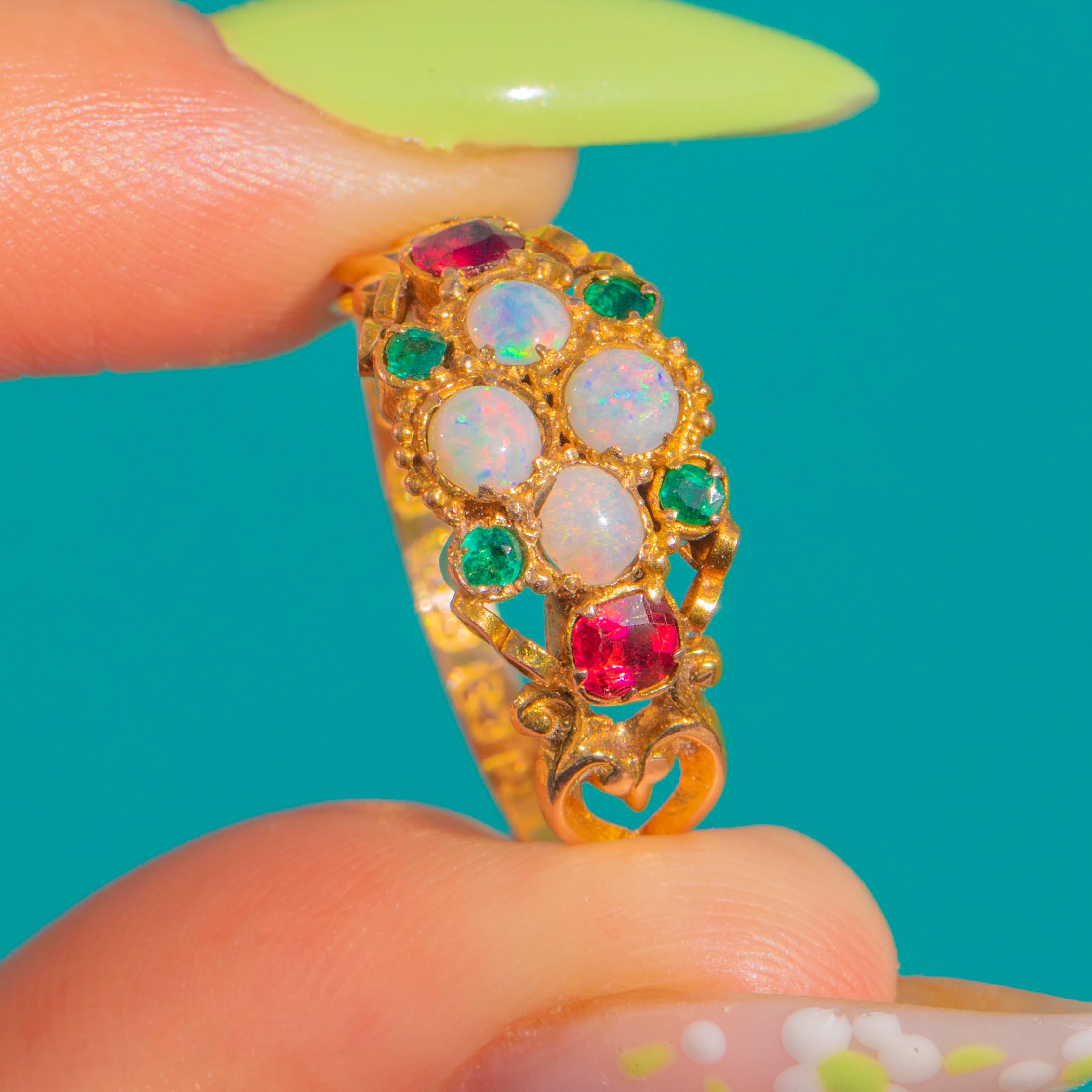 アンティーク 15ct ゴールド オパール ルビー エメラルド リング、エングレーブバンド、約1862年
