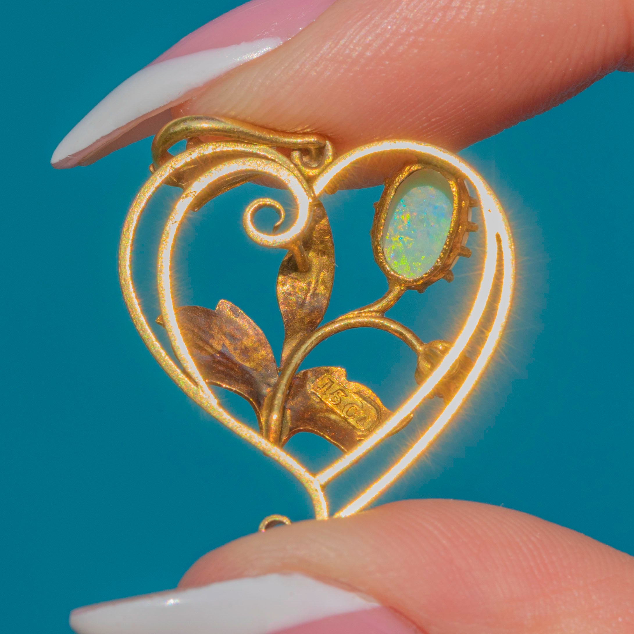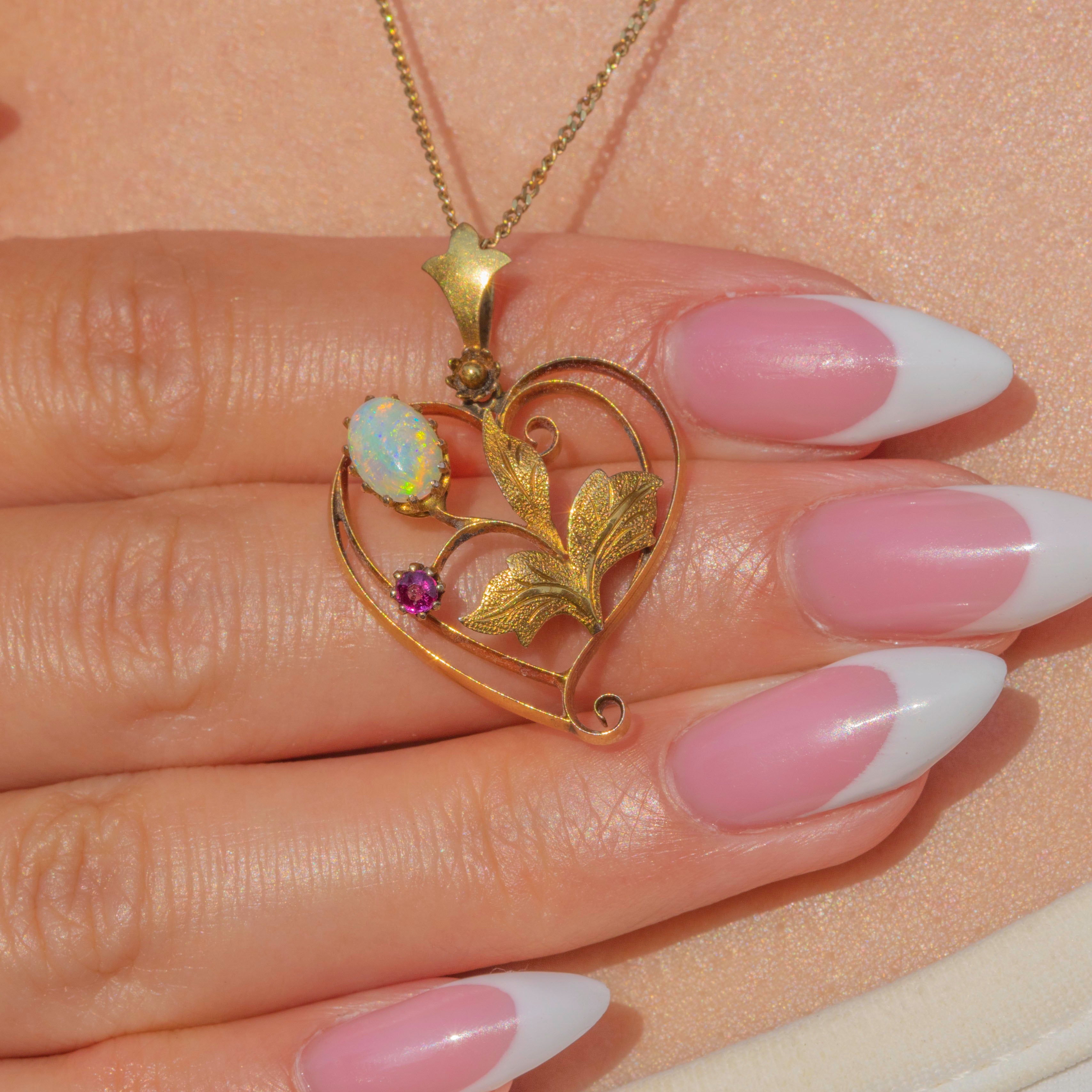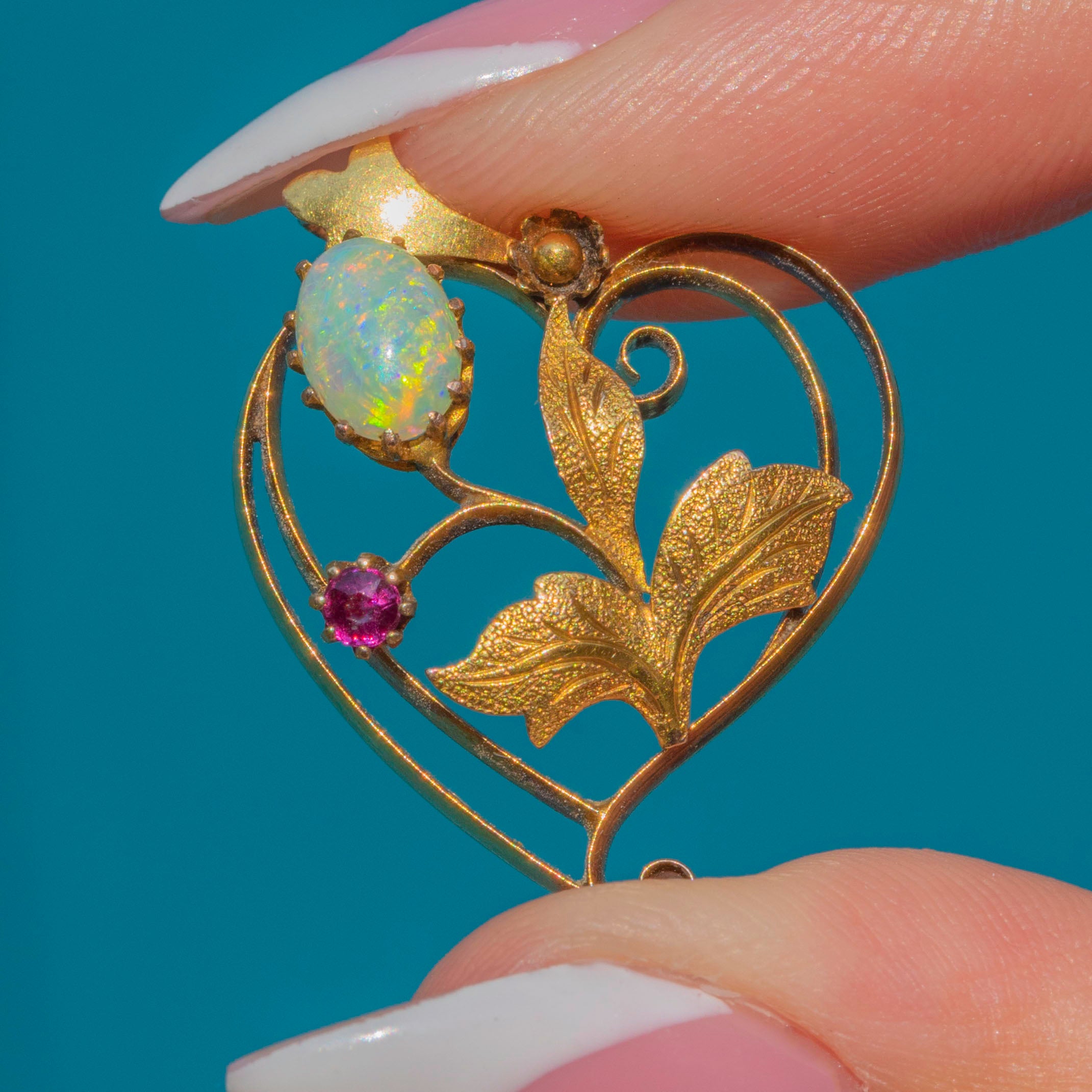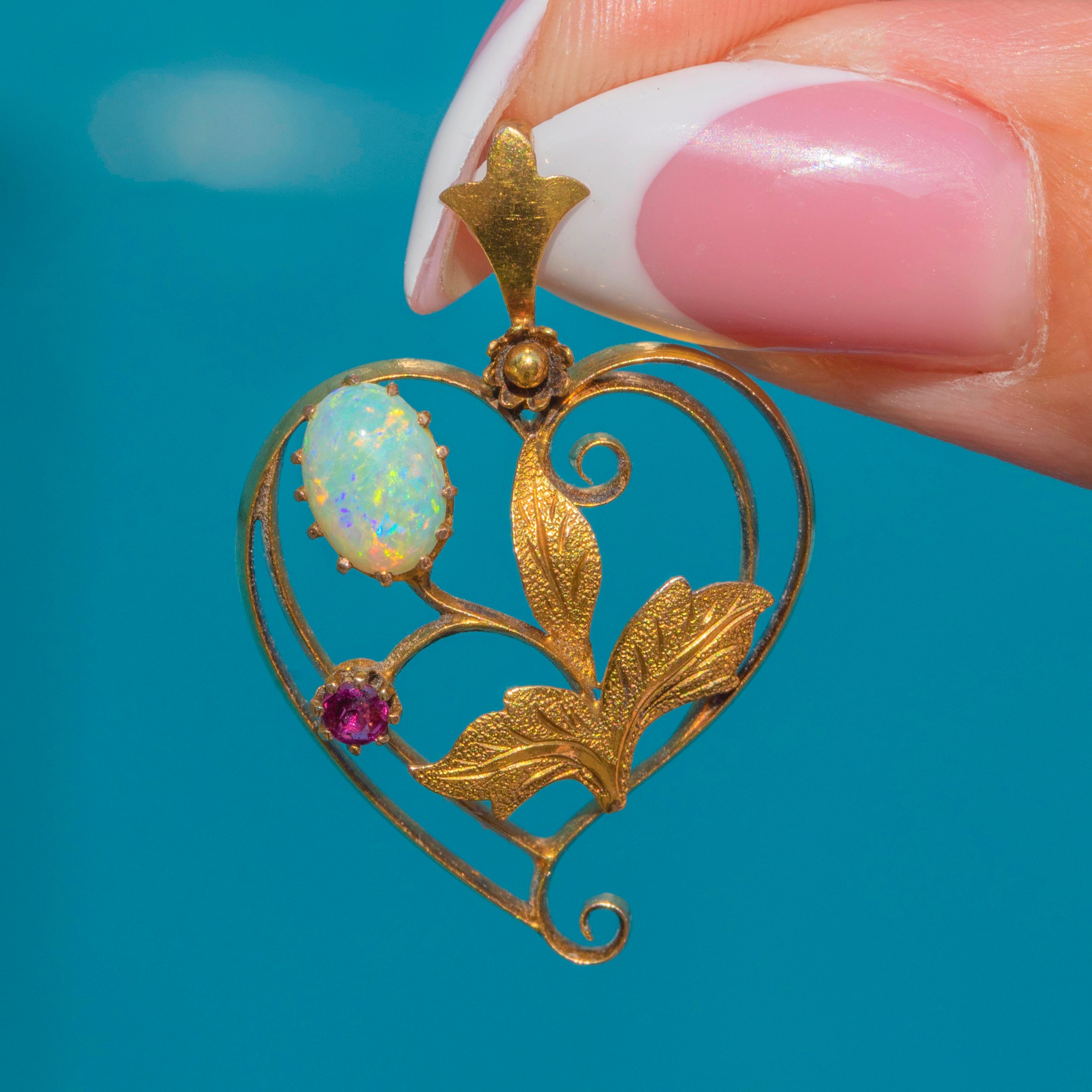 The pendant features an iridescent Opal and contrasting magenta Ruby, each gemstone complemented beautifully by the warmth of the Gold. Providing excellent coverage across your décolletage, this antique heart pendant is so charming!
