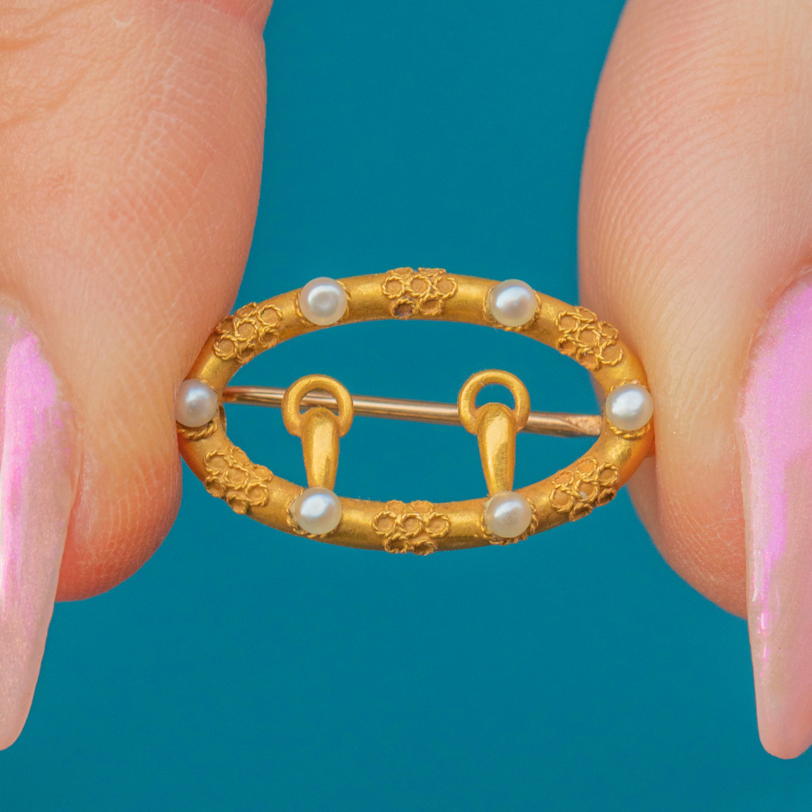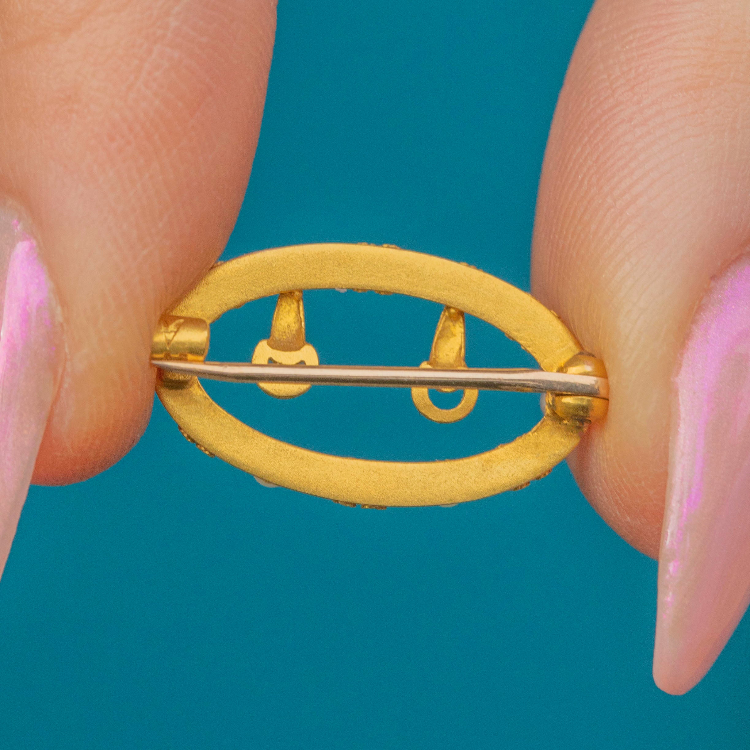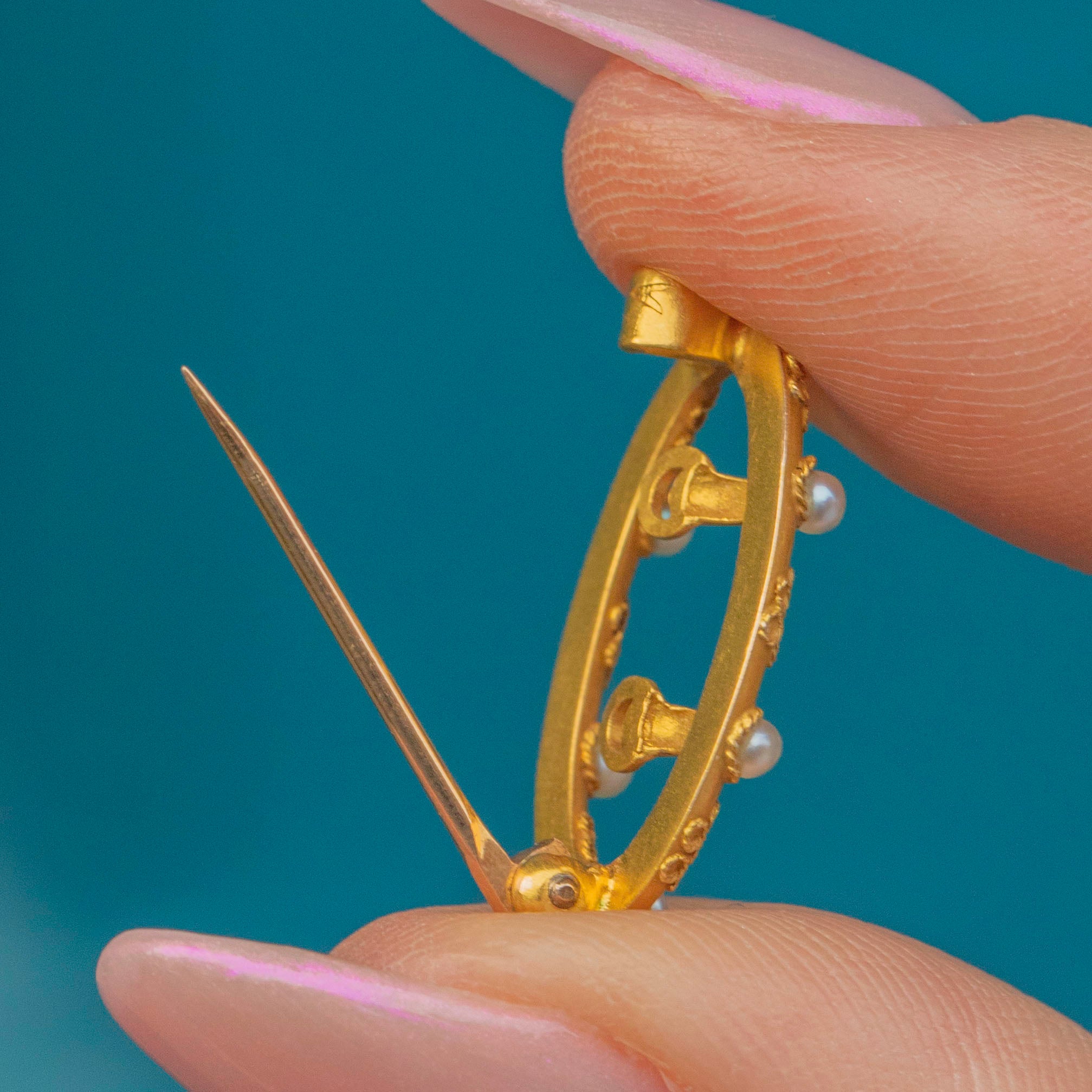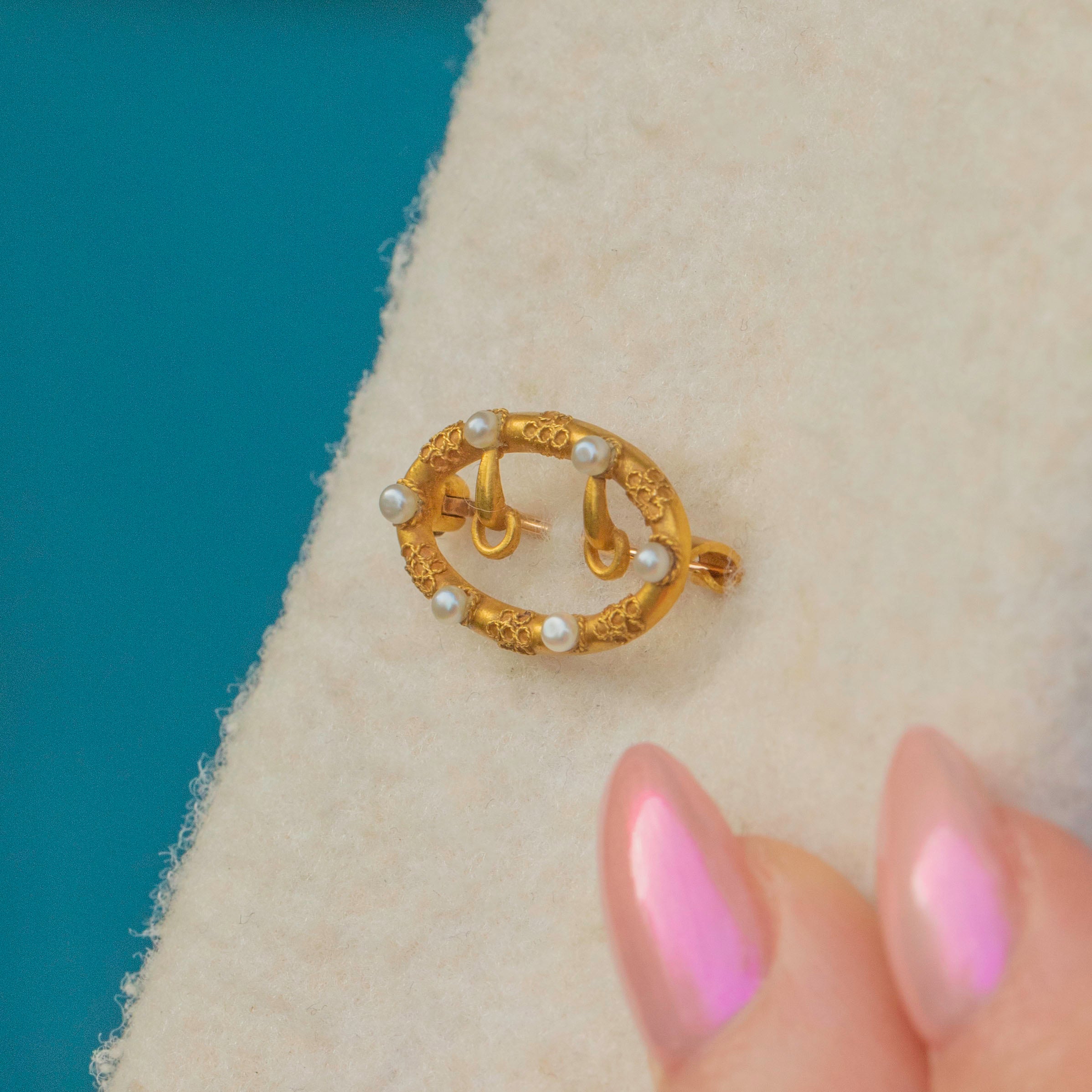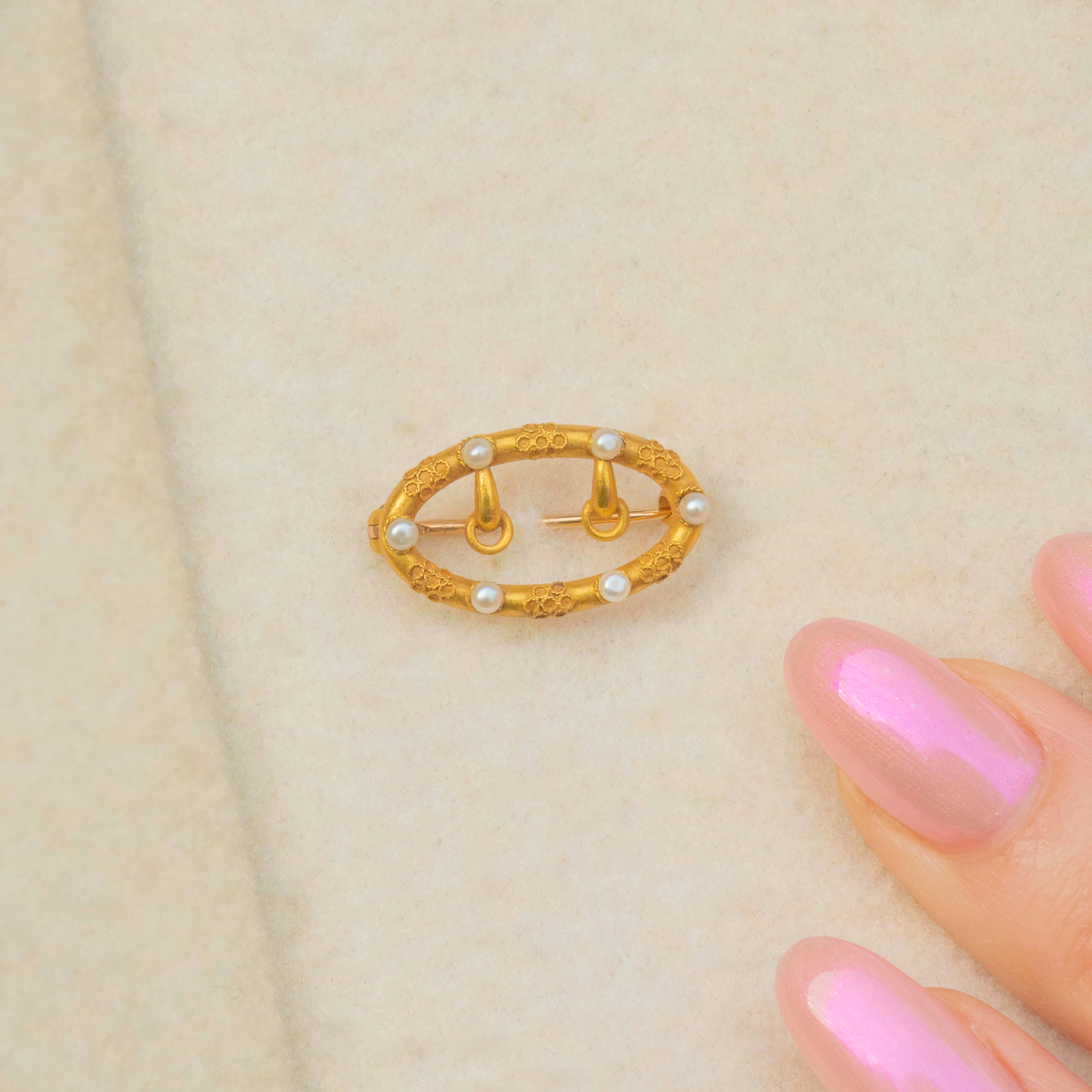 Embodying the elegance of the Victorian era, this antique 15ct Gold Pearl buckle brooch is a testament to timeless craftsmanship. Crafted from rich 15ct Gold, the brooch features a charming buckle motif, with her surface adorned by a halo of luminous creamy Pearls.