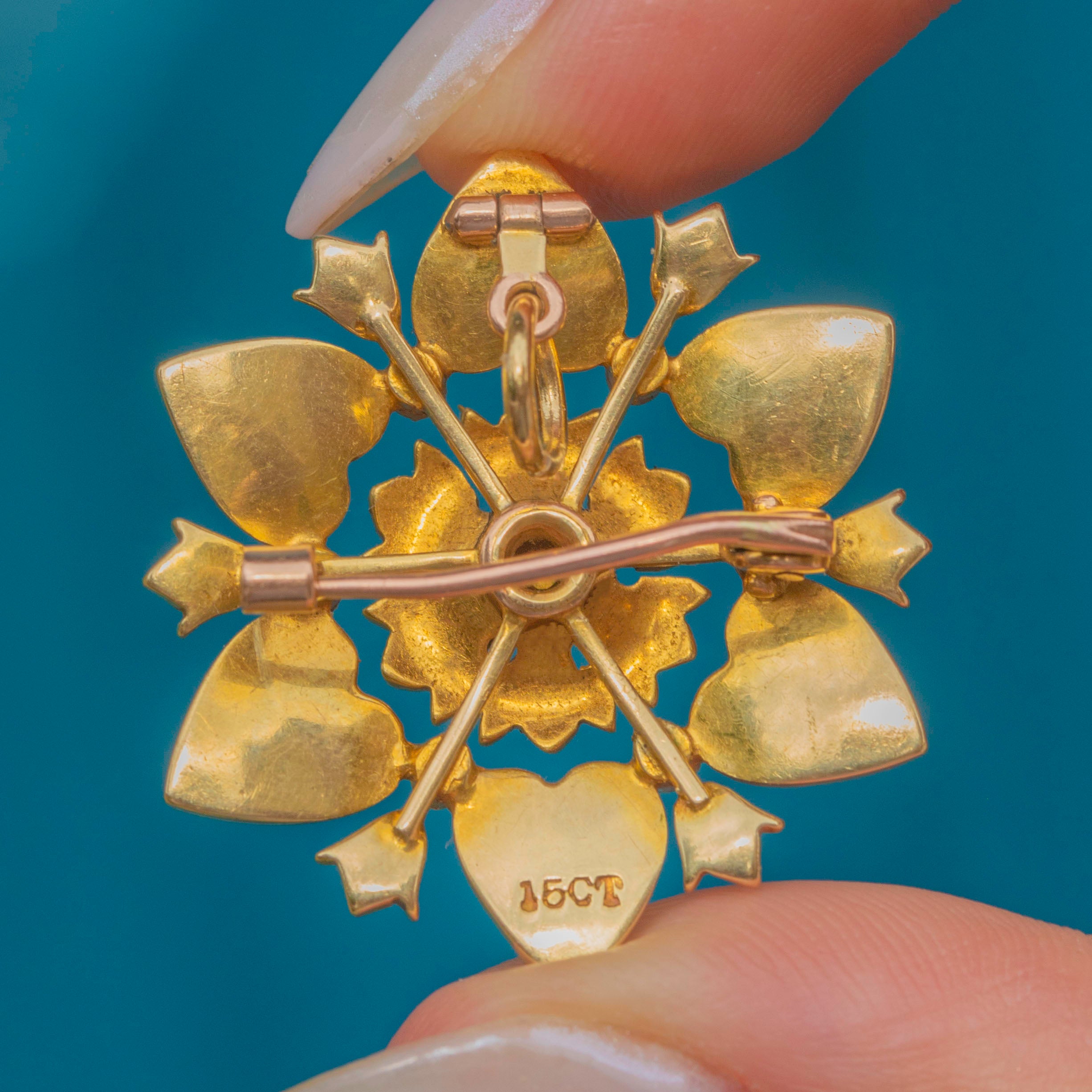 Each Pearl is displayed within floral and bold heart details, alternating to create a gorgeous cluster. Whether suspended from a chain and worn as a pendant or affixed to a lapel as a brooch, this piece of Victorian jewellery is sure to make an impact!