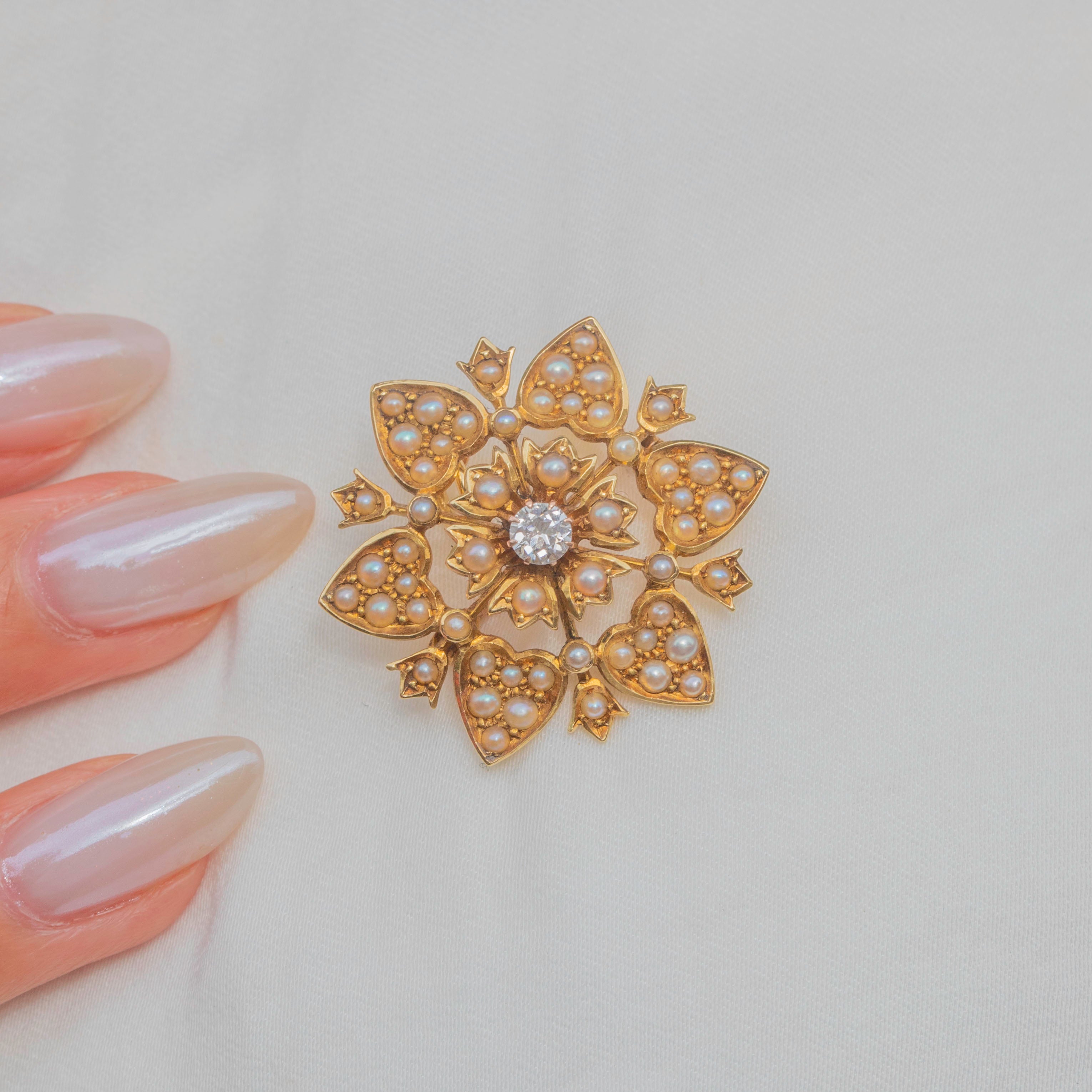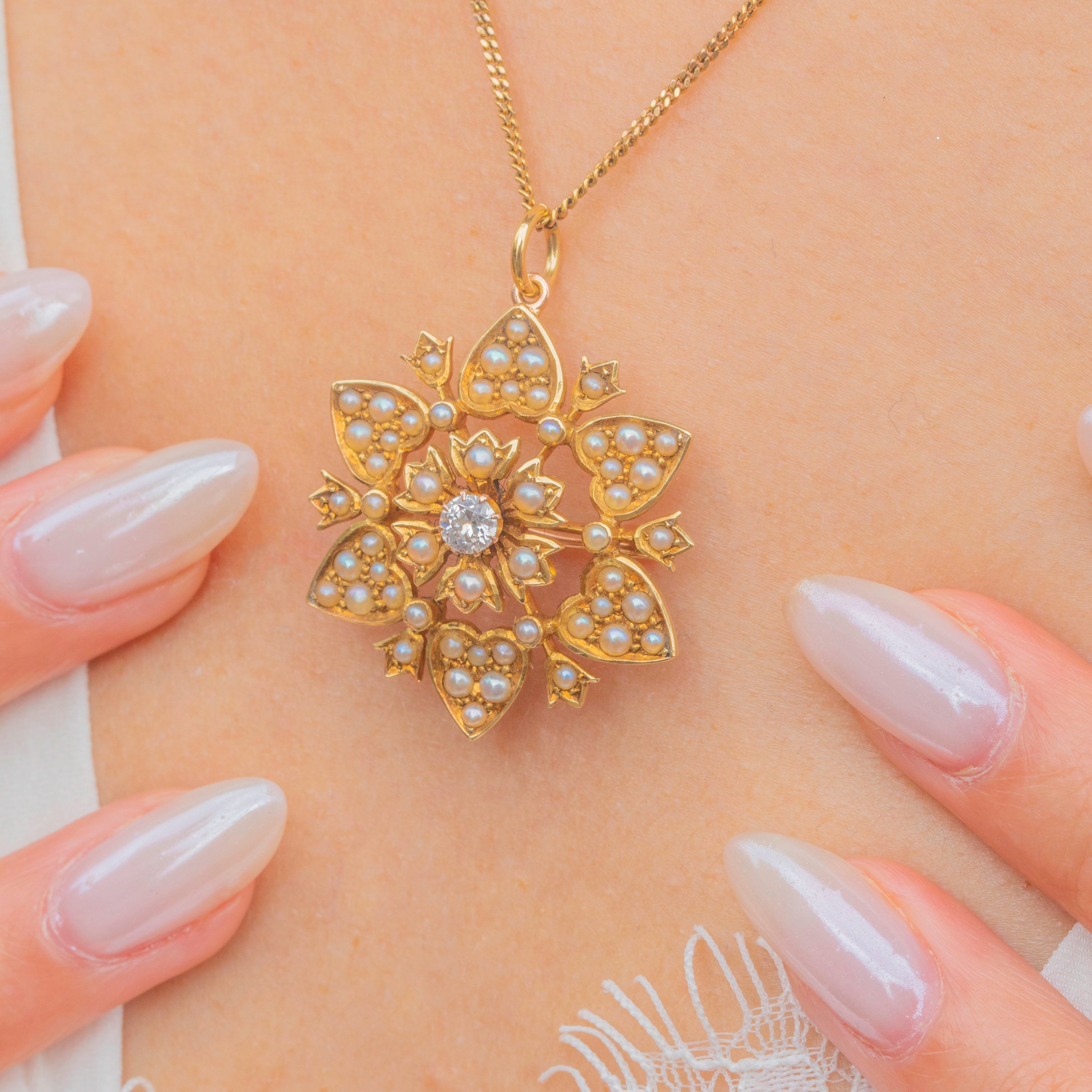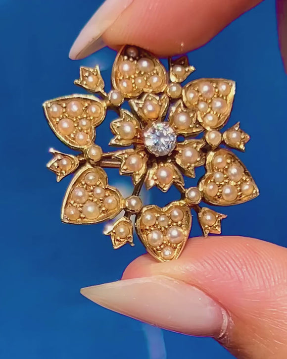 Formed from rare 15ct Gold and bursting with iridescent Seed Pearls centred by a scintillating 0.17ct Diamond, this antique pendant is an exemplar of Victorian craftsmanship!