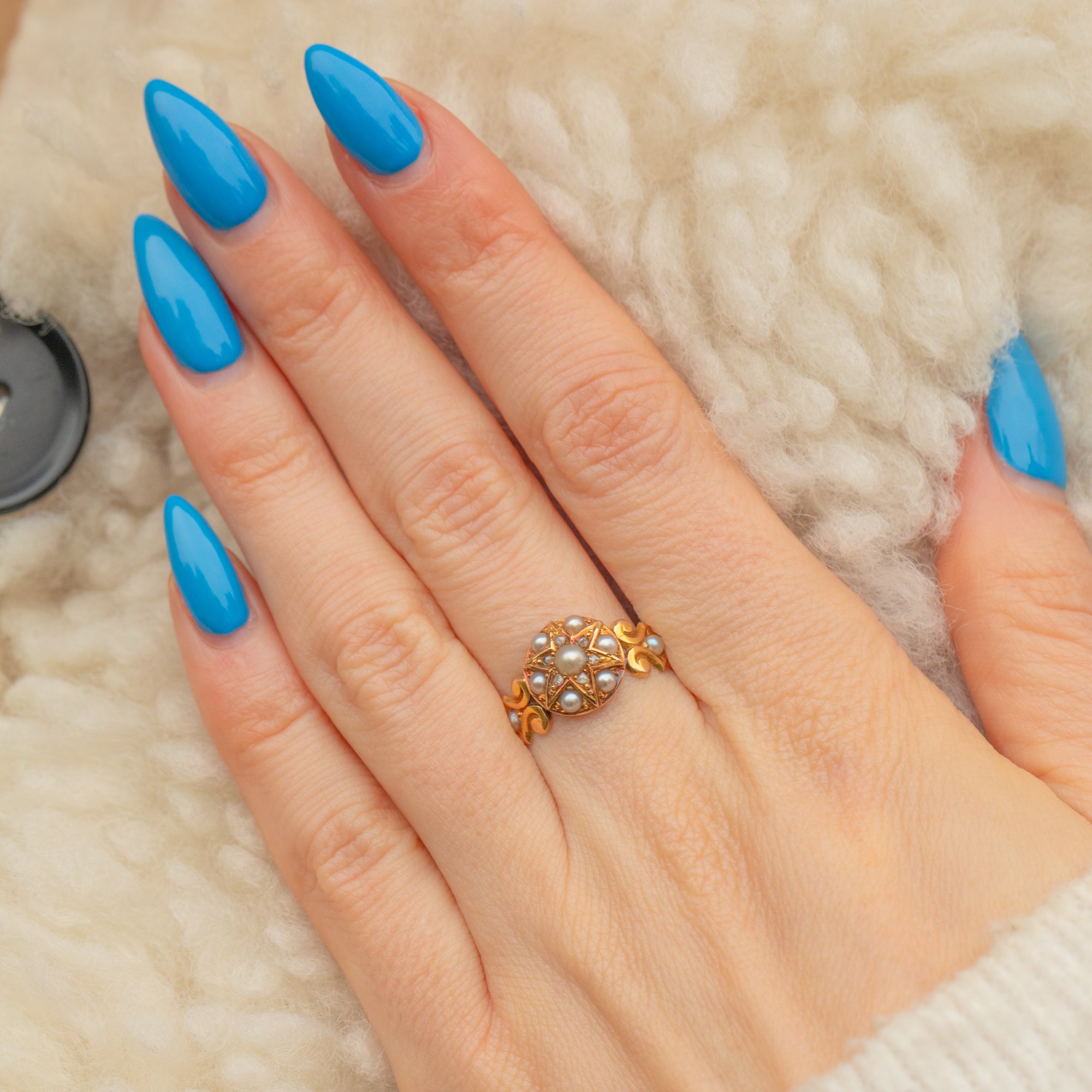 If you have a penchant for unique pieces of Victorian jewellery, this antique 15ct Gold Pearl Diamond star cluster ring is a must-have addition to your collection! Exquisitely crafted from rare 15ct Gold and studded with shimmering Pearls and subtly twinkling Diamonds, this Victorian ring is a feast for the eyes and will enchant you with its undeniable celestial charm!