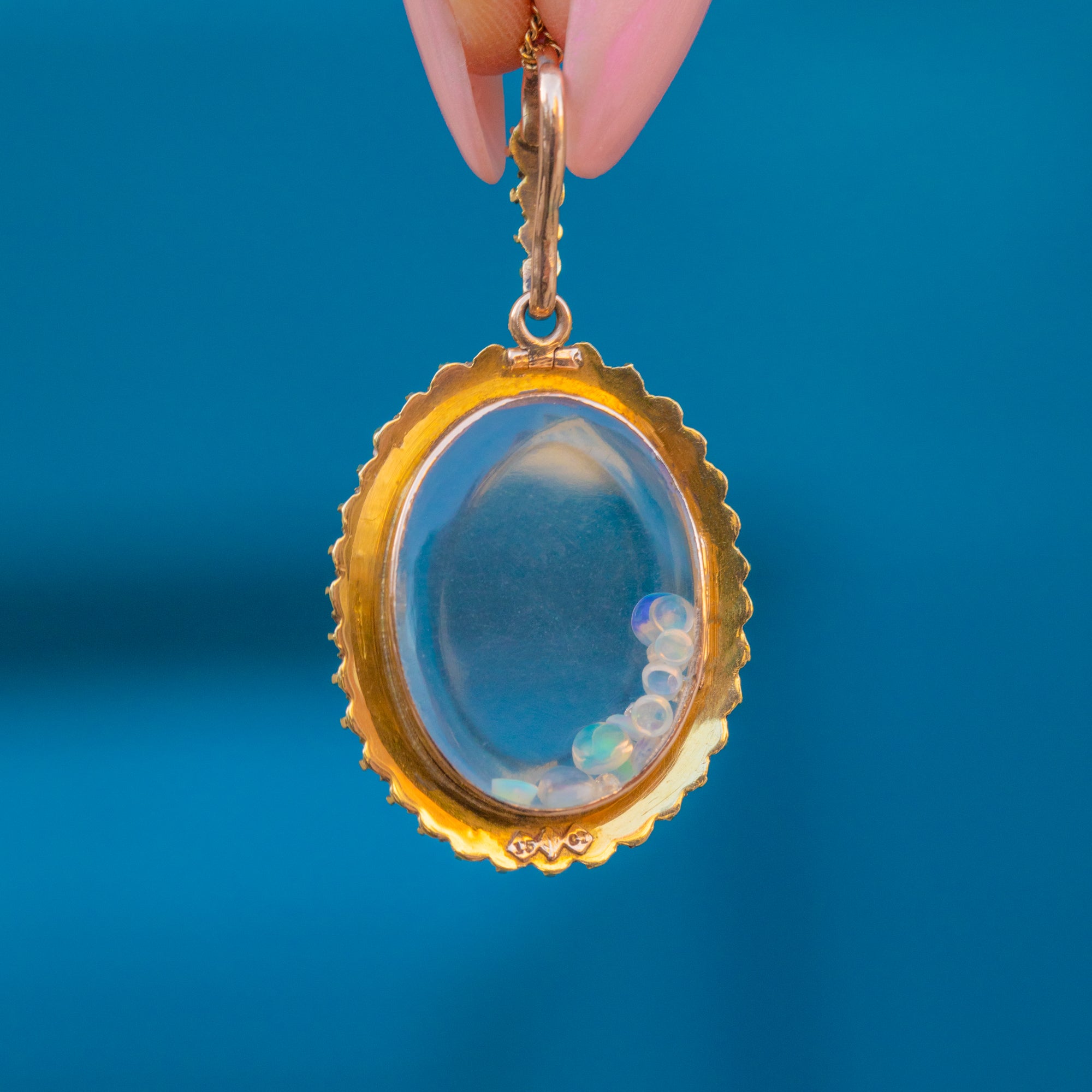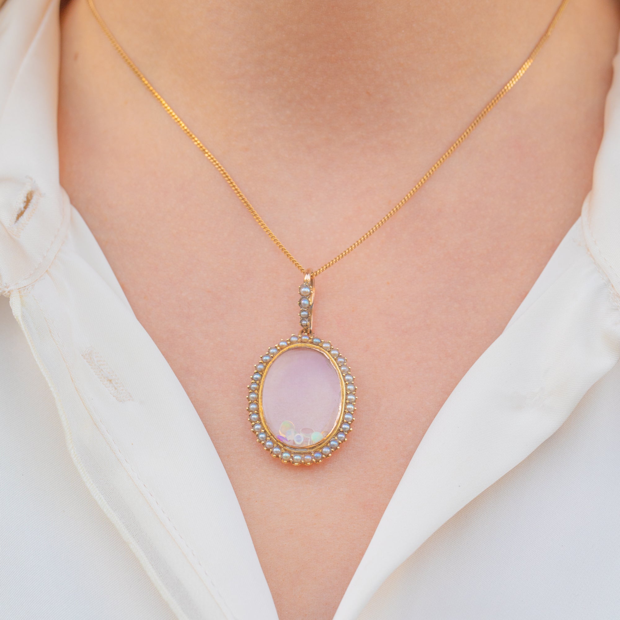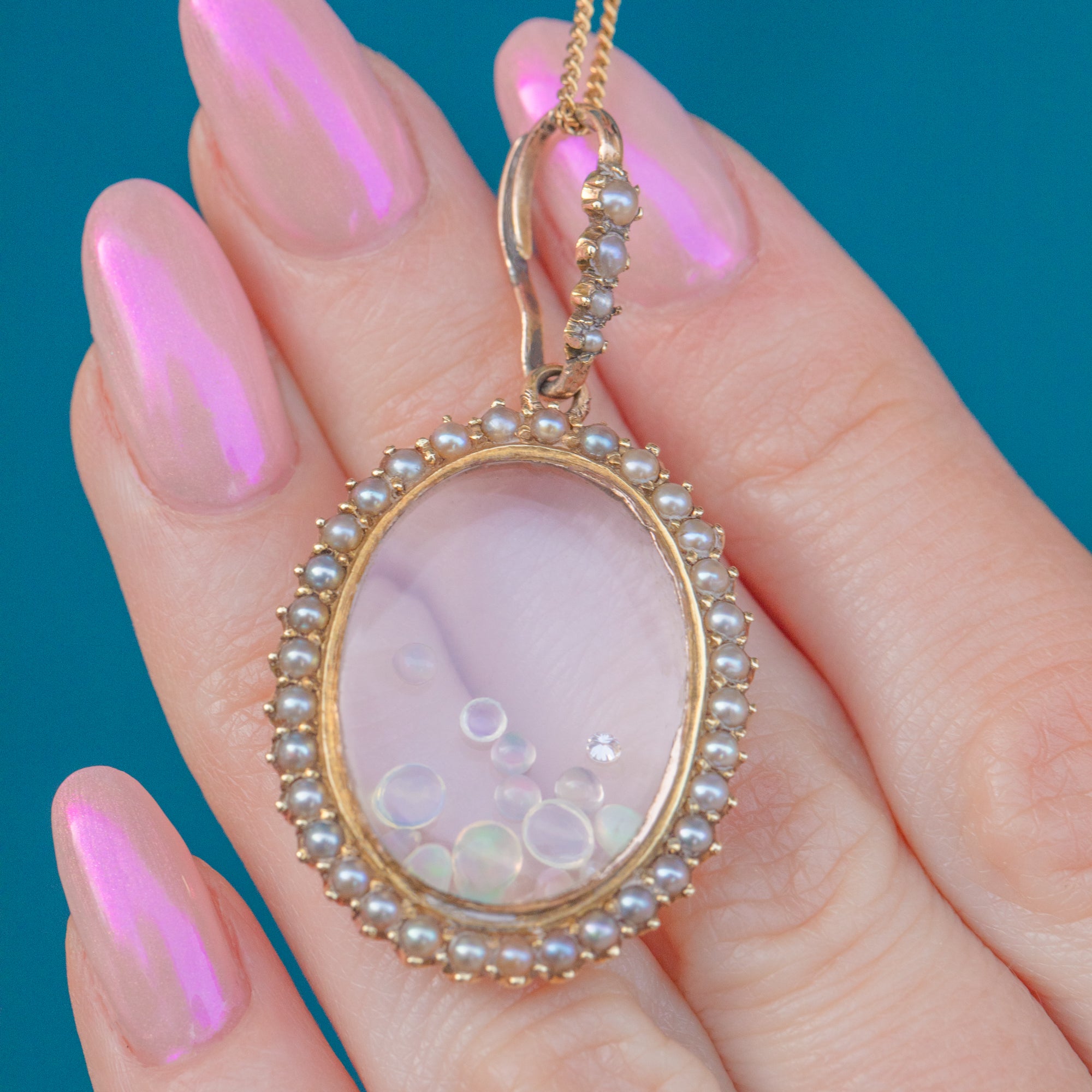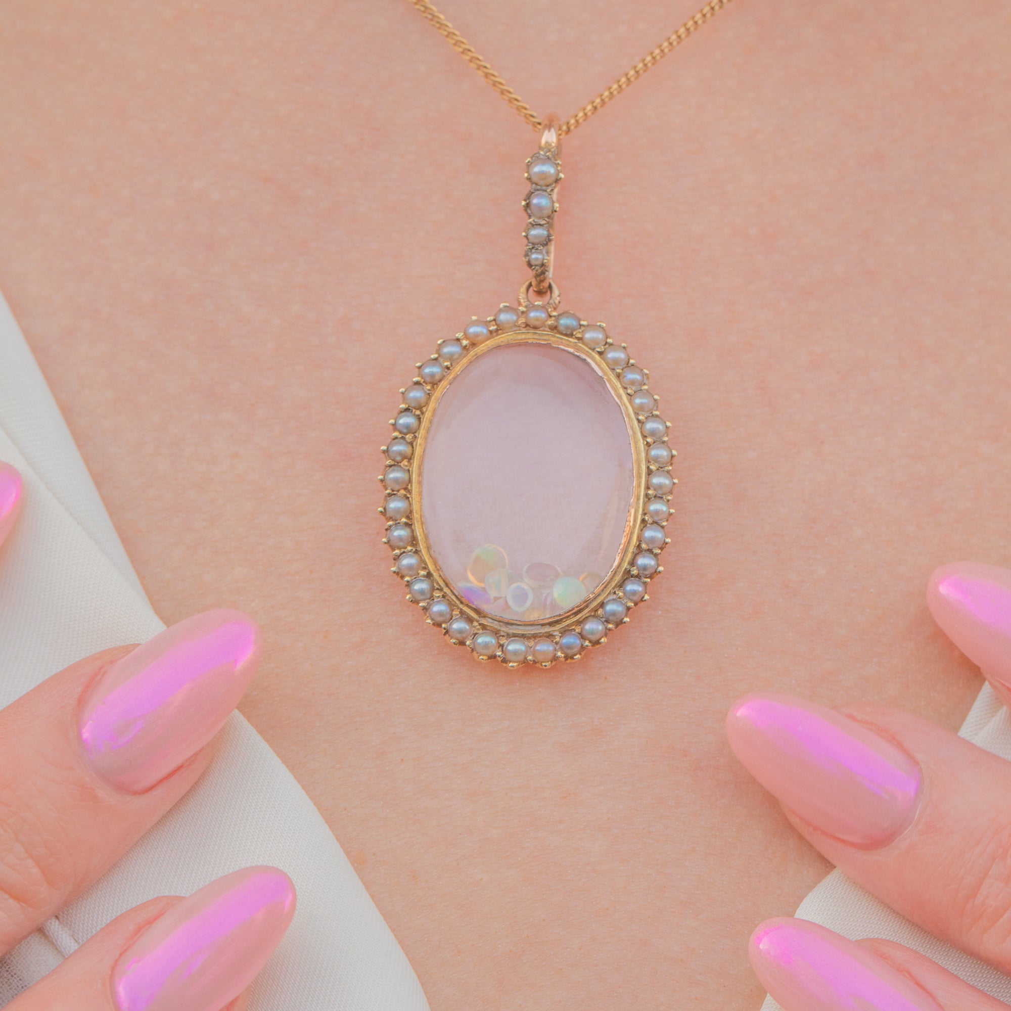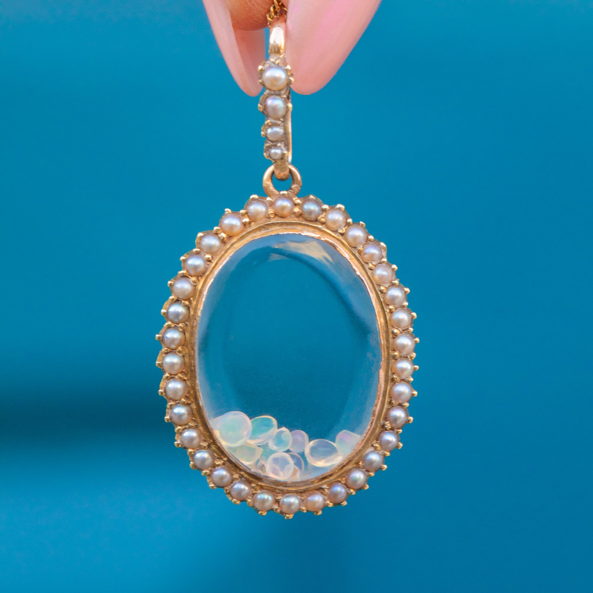 An impeccable antique 15ct Gold Pearl oval shaker locket, with a generous sprinkling of loose Opals & Diamonds for your jewellery collection! This impressive piece boasts a gorgeous halo of Pearls encasing a delectable display of gemstones on the inside, including Opals and fine quality F/G colour and VS clarity Diamonds!