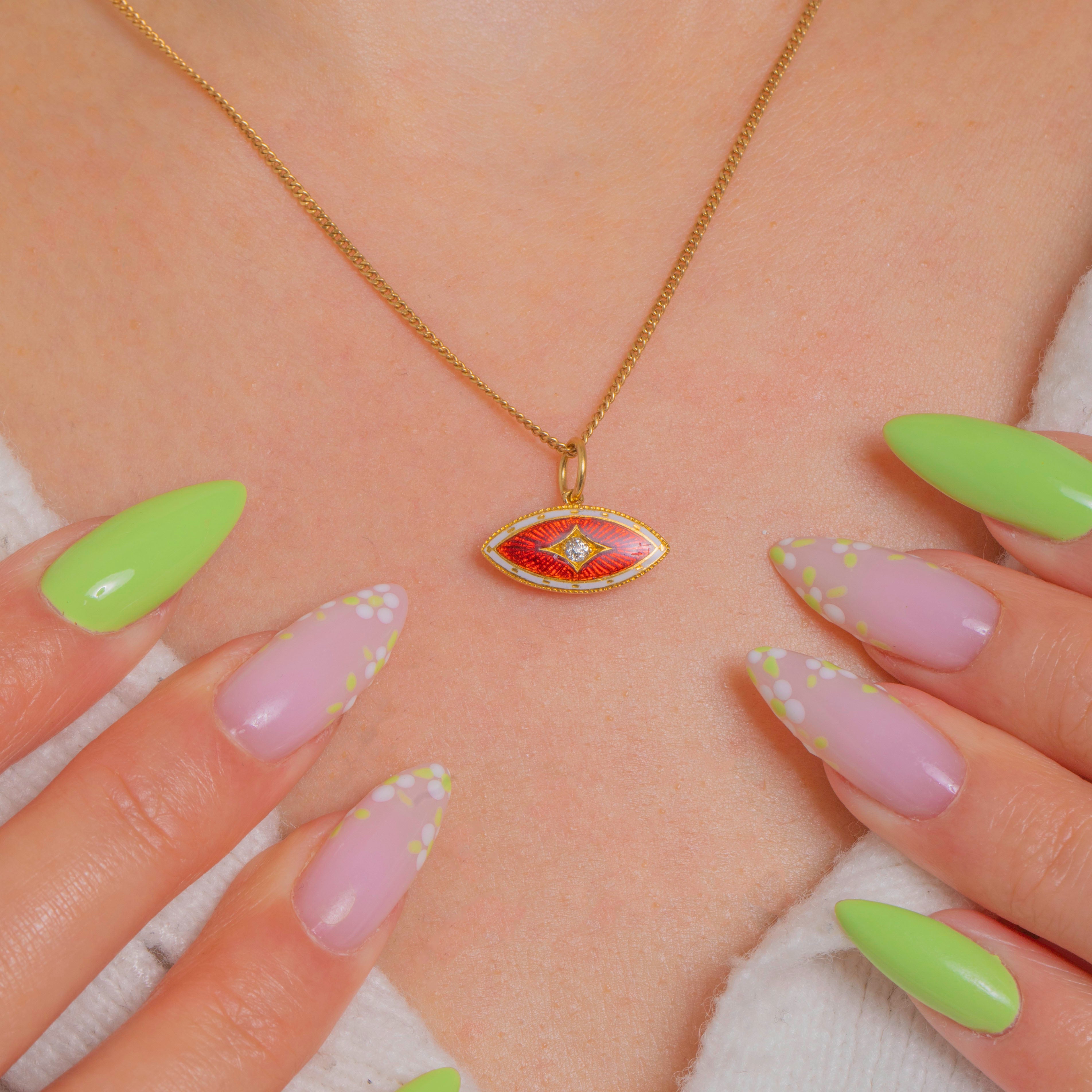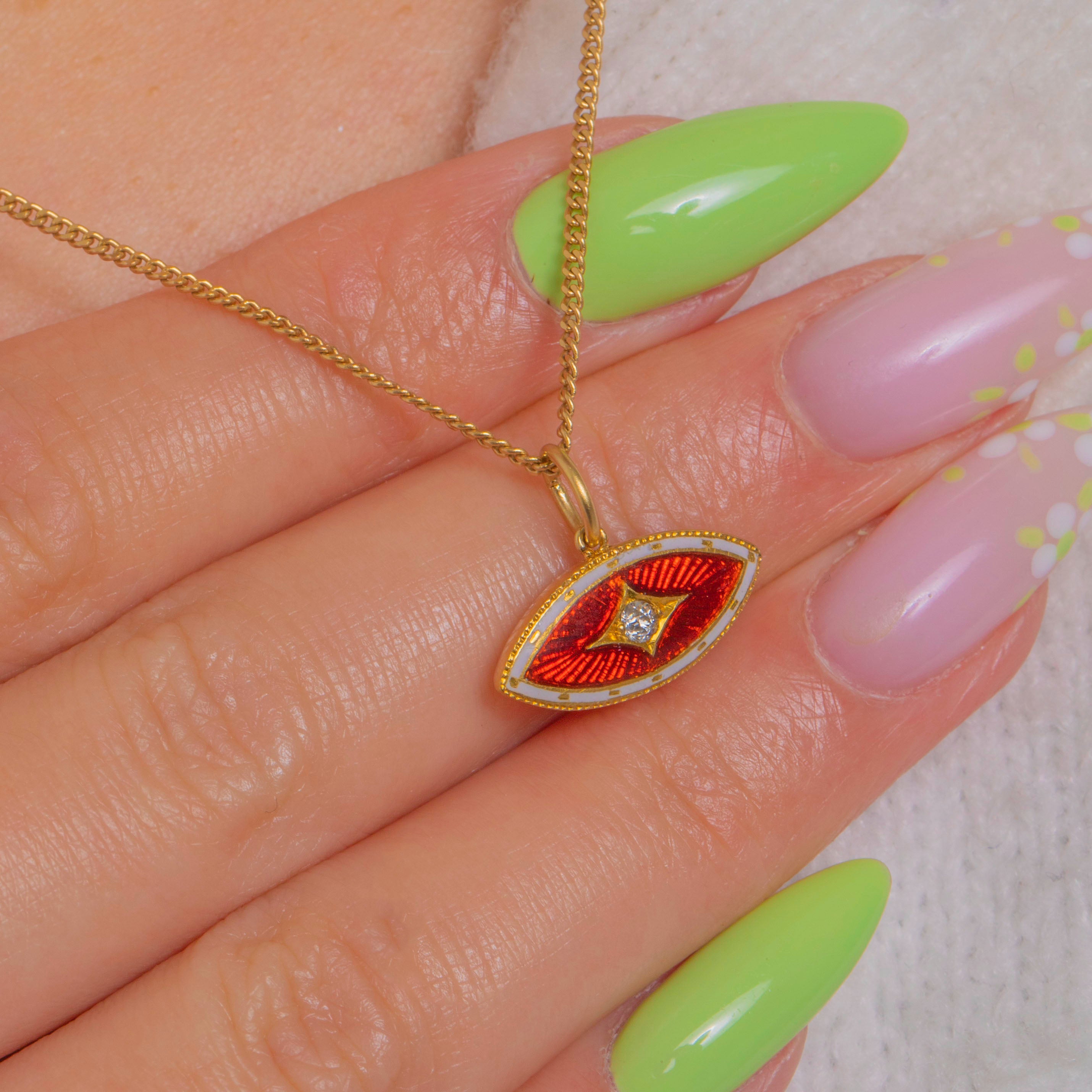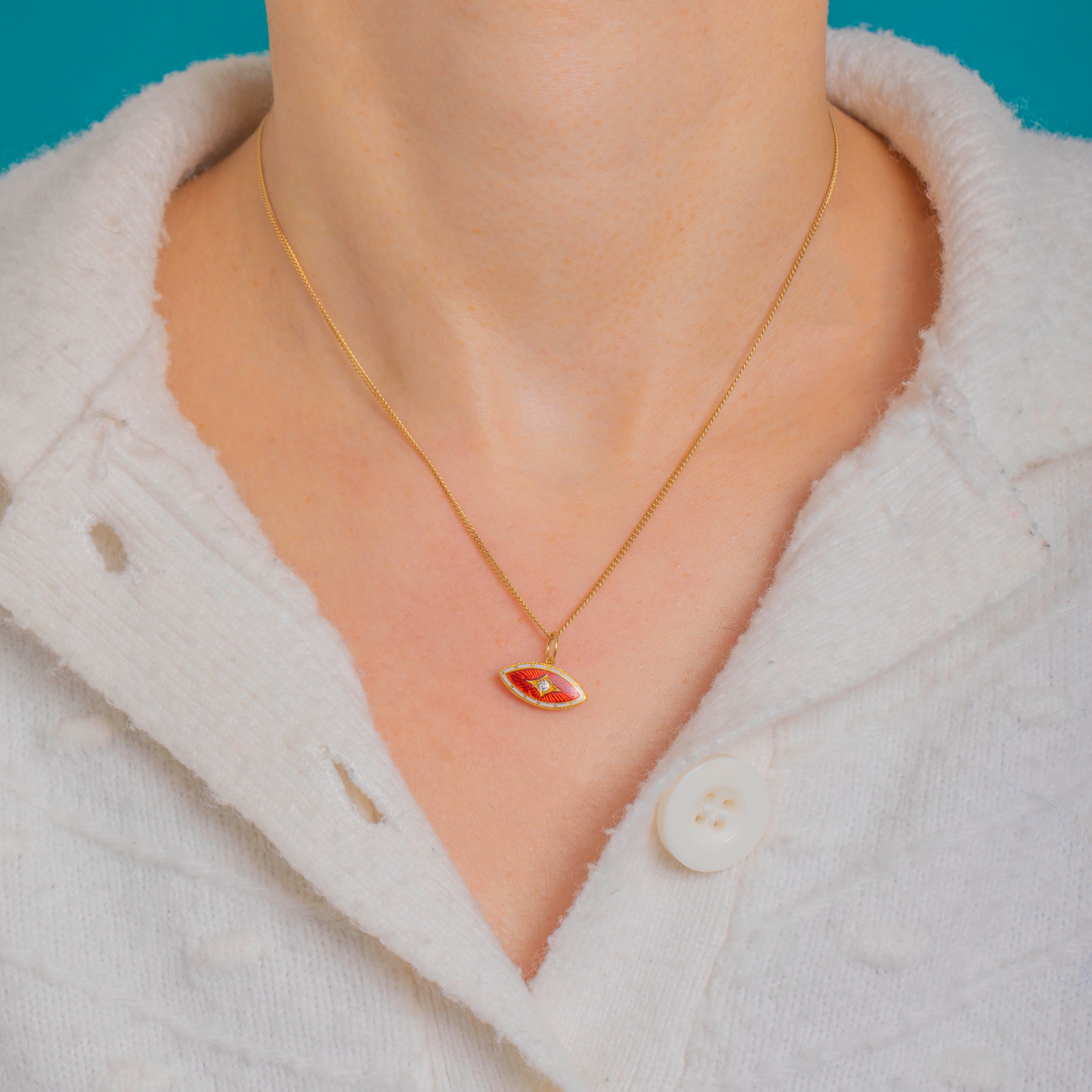鮮やかなギヨシェ・エナメルが美しいジュエルボックスの逸品。Edwardian期の15ctゴールド製チャームは、濃密な赤橙色の中心部を、繊細なホワイトエナメルの縁取りと小さなゴールドのアクセントが彩ります。マーキーズシルエットは精緻なミルグレインで仕上げられ、立体的なロザンジュセッティングが中央のダイヤモンドの輝きを際立たせています。