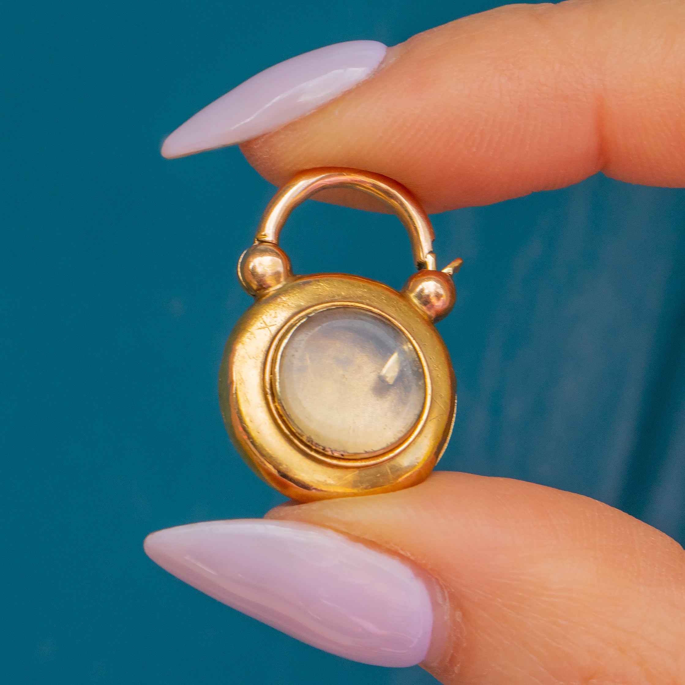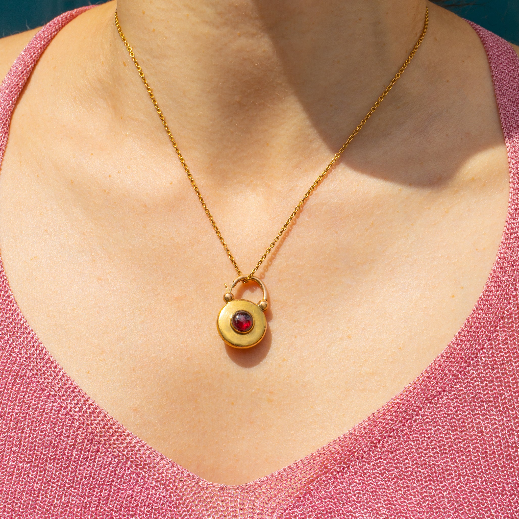VERY GOOD. This antique 15ct Gold round Garnet pendant is in very good condition. The Garnet is secure within its setting with a delicious cherry red hue. There is some age-related wear, including some minor marks on the Granet and the body of the locket, most notably on the sides, but this does not detract from her overall beauty. The Gold is buttery with superb reflective qualities and the padlock has kept its form well over the years. Although the glass pane cannot be removed, it adds undeniable charm to the piece and has only some light scratches noticeable under close inspection. The padlock hasp is stiff but once locked in you can wear her with the utmost confidence. This Victorian padlock pendant is waiting to adorn your neck!