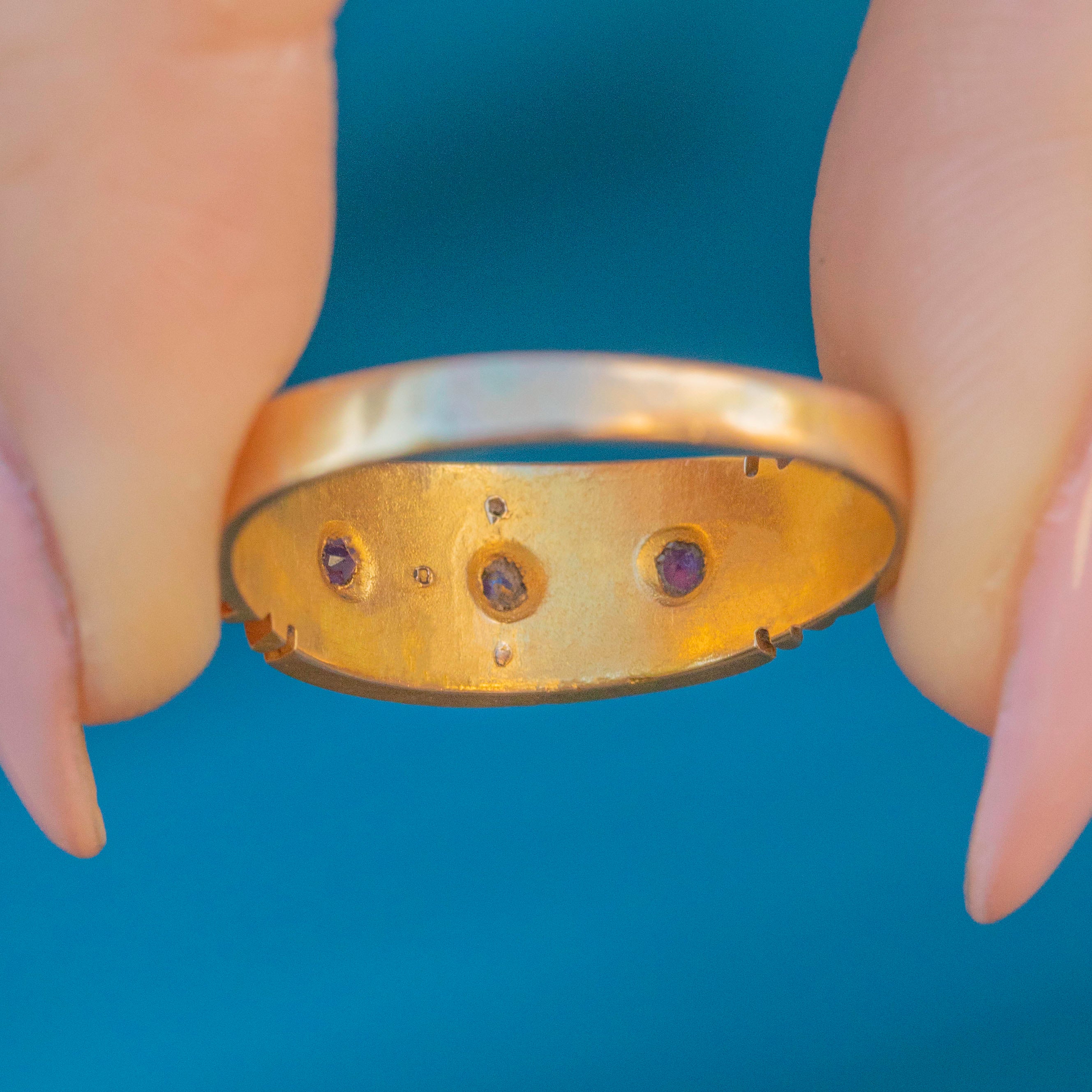 EXCELLENT. This antique 15ct Gold Ruby Pearl gypsy ring is in excellent condition. The gemstones are all original and free from chips or cracks. The Gold is bright with wonderful reflective qualities and no scratches. Only the very lightest level of surface wear, commensurate with age. The depth of the hallmarks indicates that this ring has been cared for very well over the last 150 years!