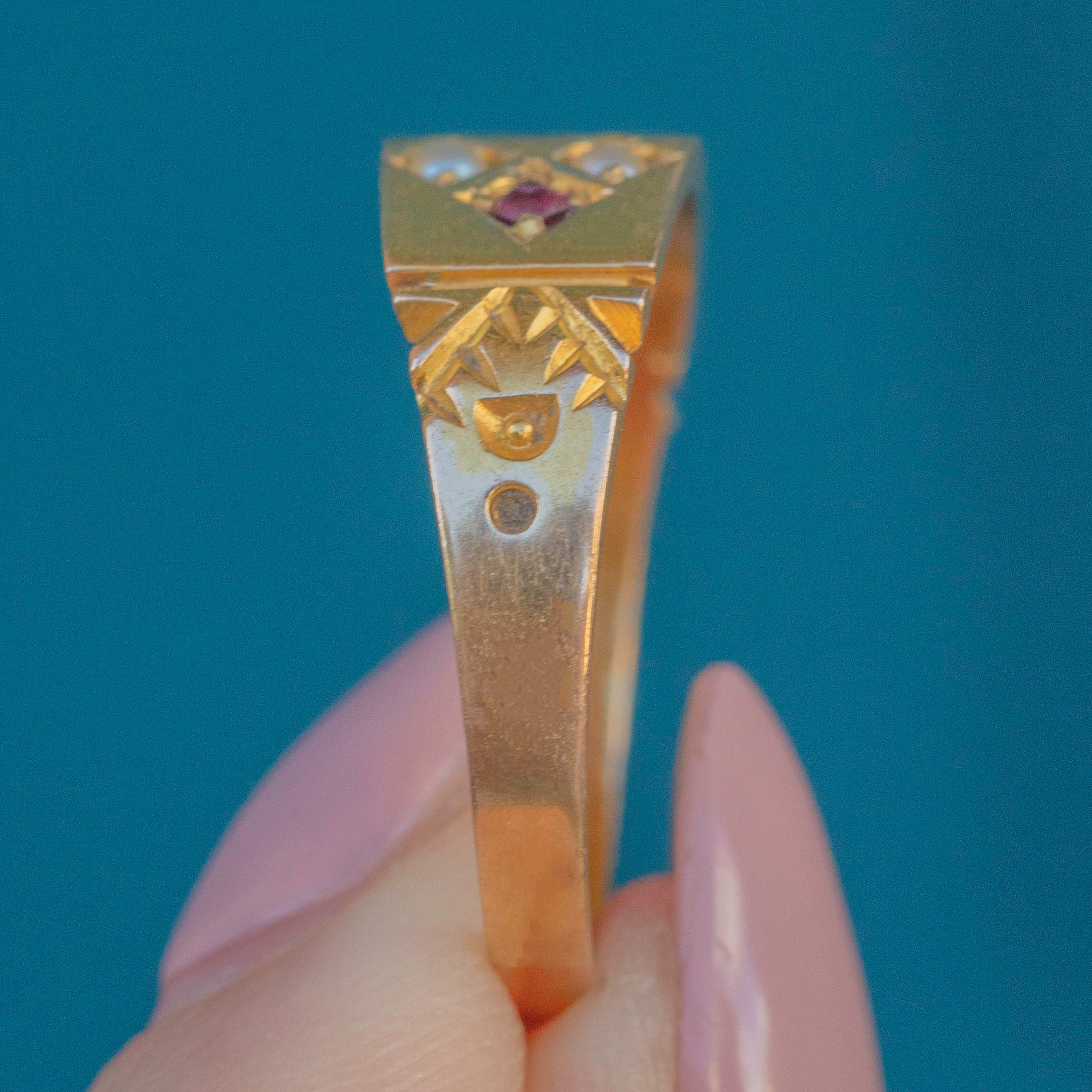 A classic antique 15ct Gold Ruby Pearl gypsy ring offered in wonderful condition, with a full complement of chunky antique hallmarks easily legible to the naked eye!