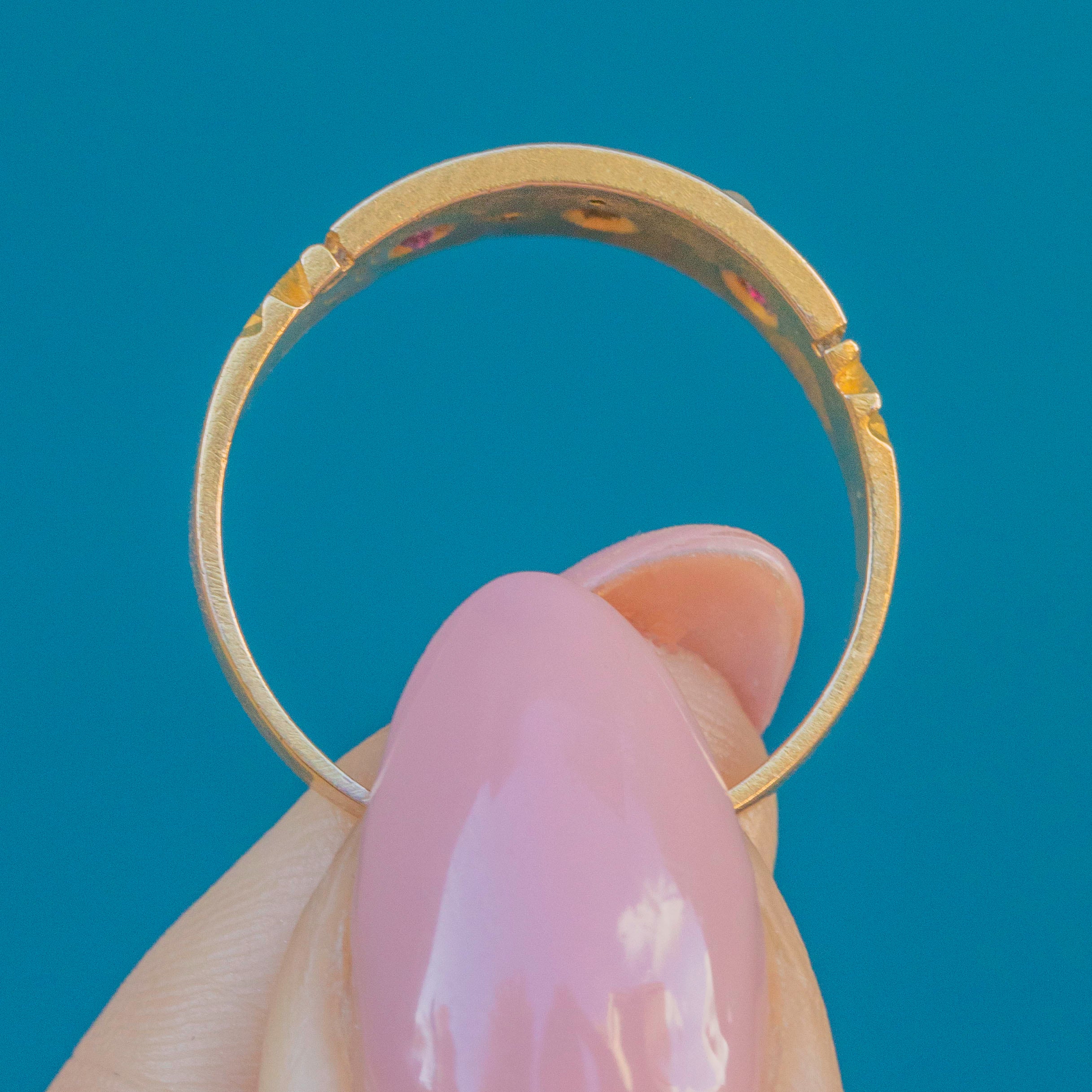 Buttery 15ct Gold, deep well-saturated red Rubies and dainty Seed Pearls give this ring a commanding presence, whilst maintaining femininity.