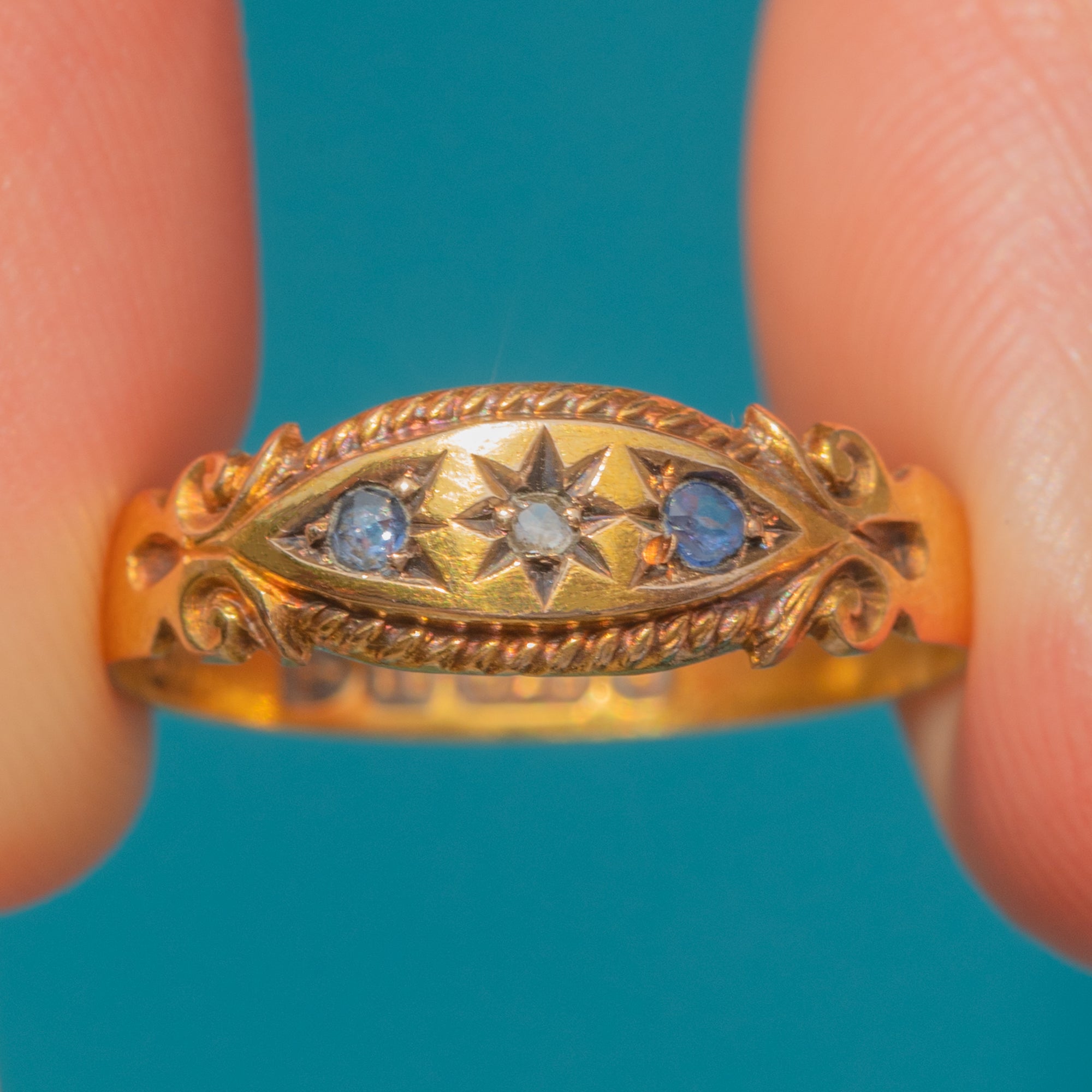 In her centre sits a scintillating Diamond flanked by Sapphires, each gemstone gleaming with a gorgeous radiance as they catch the light. These Victorian gemstones sit within bold settings, giving this antique ring a decadent charm.
