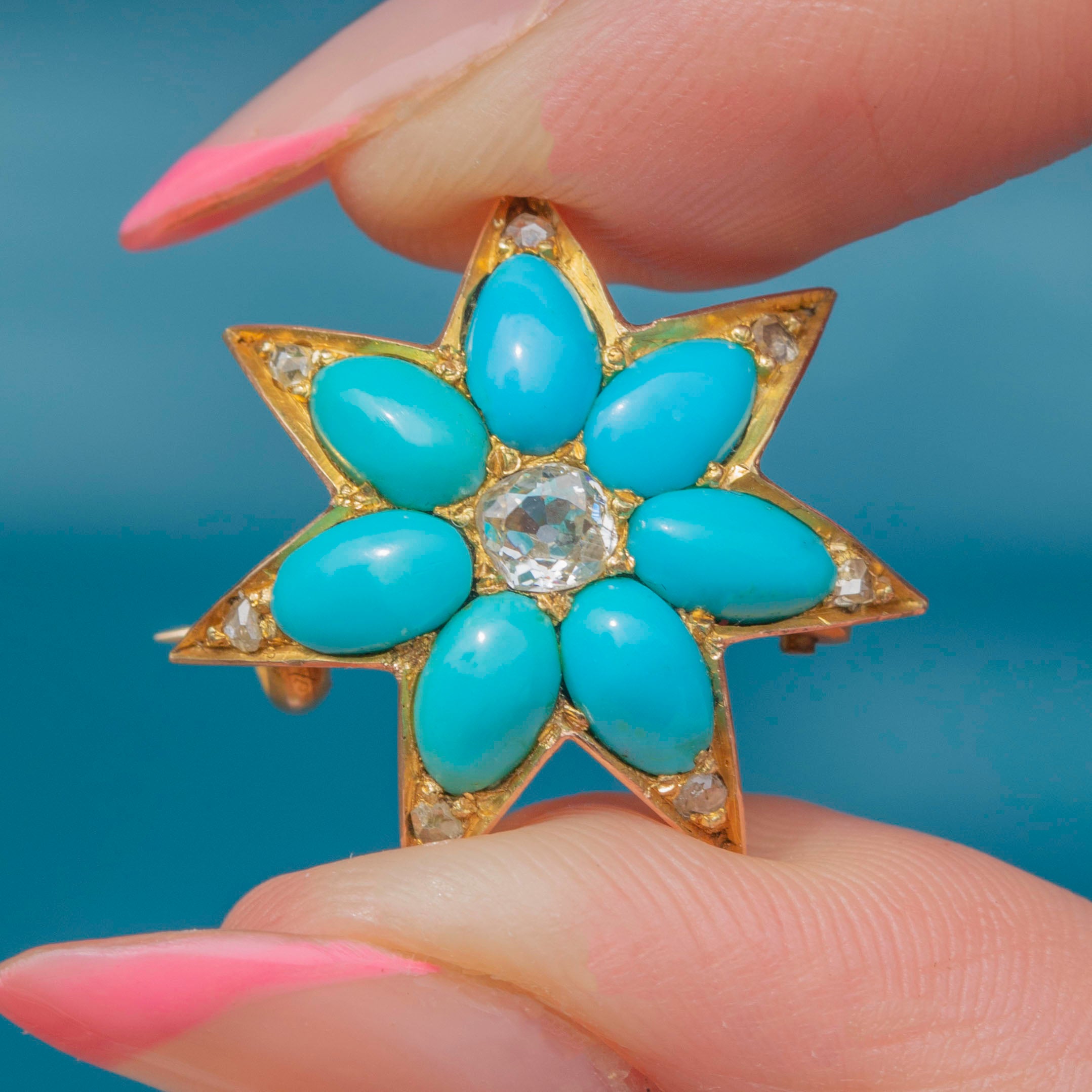 This antique 15ct Gold Turquoise Diamond star brooch is an undeniably striking piece! This seven-point star is crafted from rare, solid 15ct Gold, with a gorgeous satin finish that provides an exquisite backdrop for the resplendent gems displayed across its form.