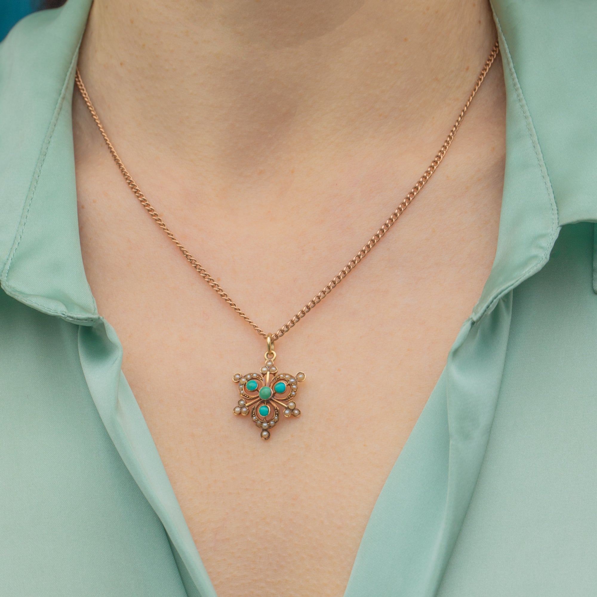 VERY GOOD. This antique 15ct Gold Turquoise Pearl trefoil pendant is in very good condition. The Gold is buttery and the form of the pendant has kept its shape well. The gems are all present with some showing signs of wear, yet they all remain securely set. The Turquoise have a gorgeous natural variation in hue, and although two have nibbles on one side, they are secure within their bezels. The Pearls provide a lovely sheen with only minor surface wear to a couple, noticeable under close inspection. There is some variation in the tone of the Gold on the back of the pendant, but this won't be noticeable while the pendant is worn. With plenty of life left in her and so much beauty to absorb, this antique trefoil pendant will make a superb addition to your collection!