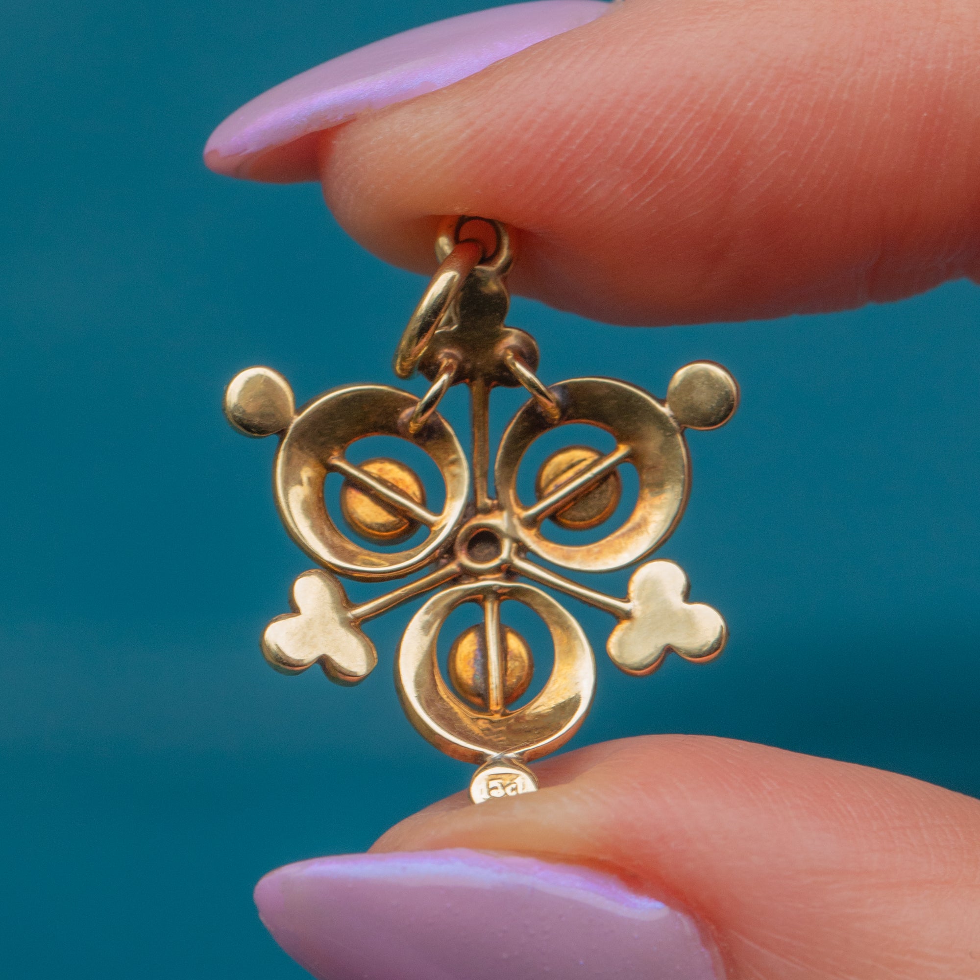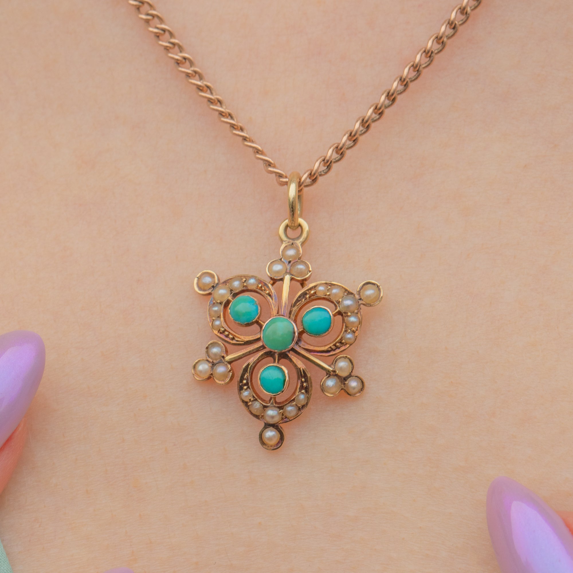 Antique 15ct Gold Turquoise Pearl Trefoil Pendant