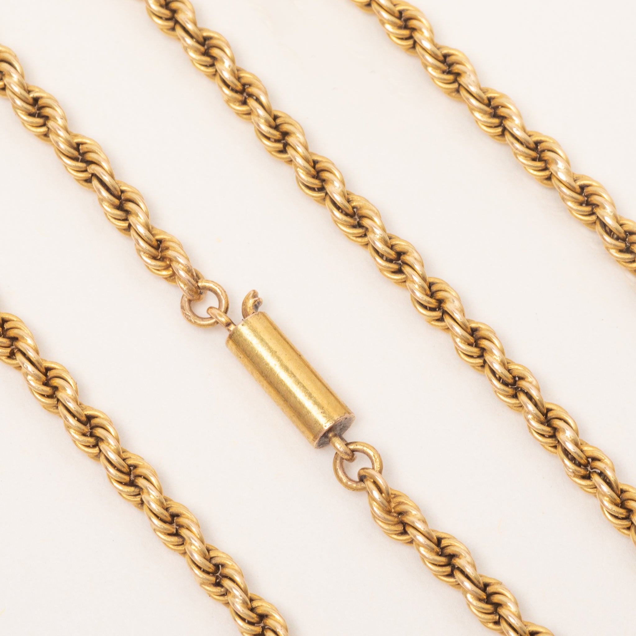 EXCELLENT. This antique 15ct Gold twisted rope chain is in excellent condition! The Gold is sumptuous and the links are tightly woven, free from any wear to note, with a rare "15" tag near the clasp. The barrel clasp is in perfect working order promising years of confident wear!
