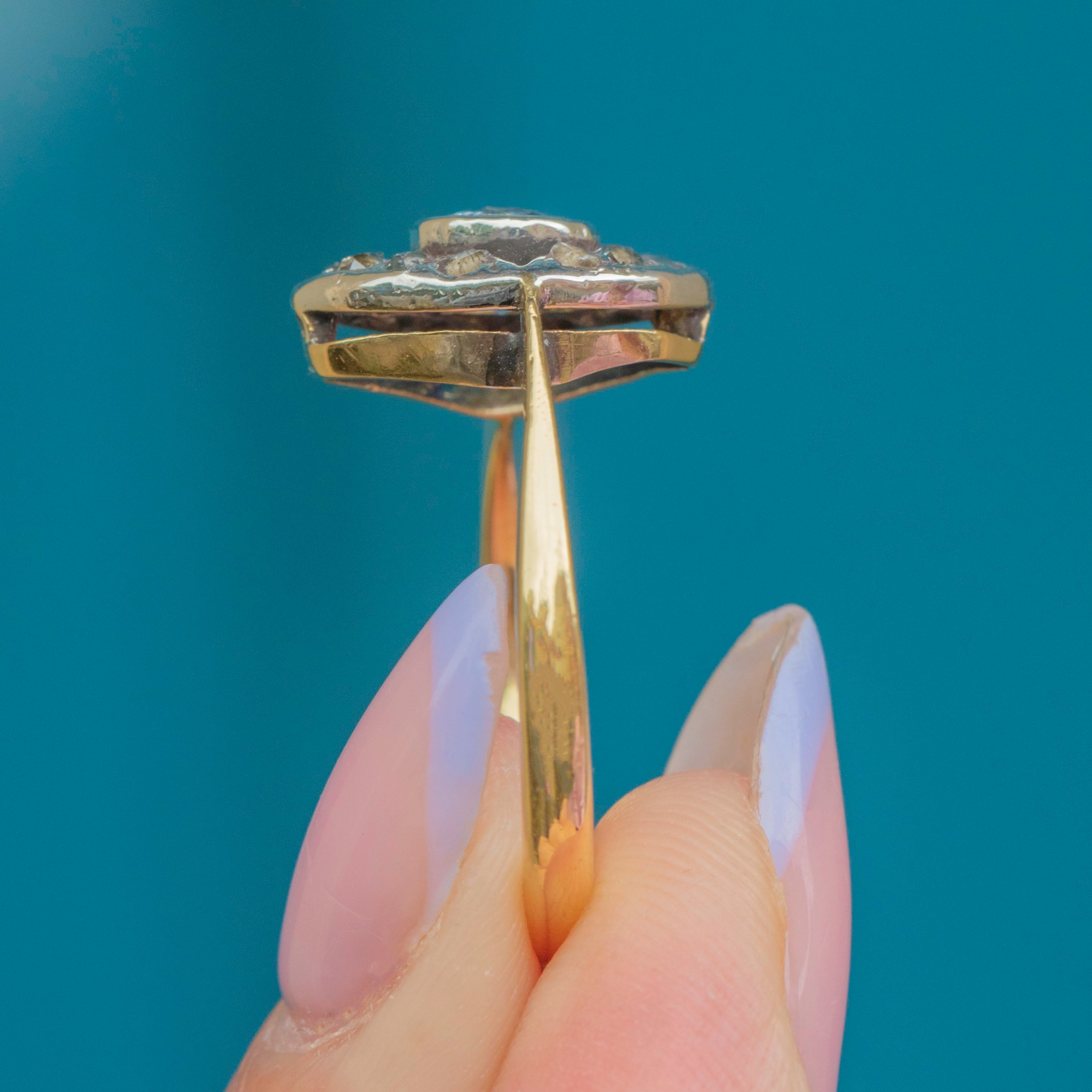 This antique 18ct Gold Aquamarine Diamond cluster ring is exquisite! Dating back to the Victorian era, this eye-catching ring boasts a striking icy-blue 0.35ct Aquamarine at her centre, frmaed by a rose-cut Diamonds that twinkle softly in their Silver settings.