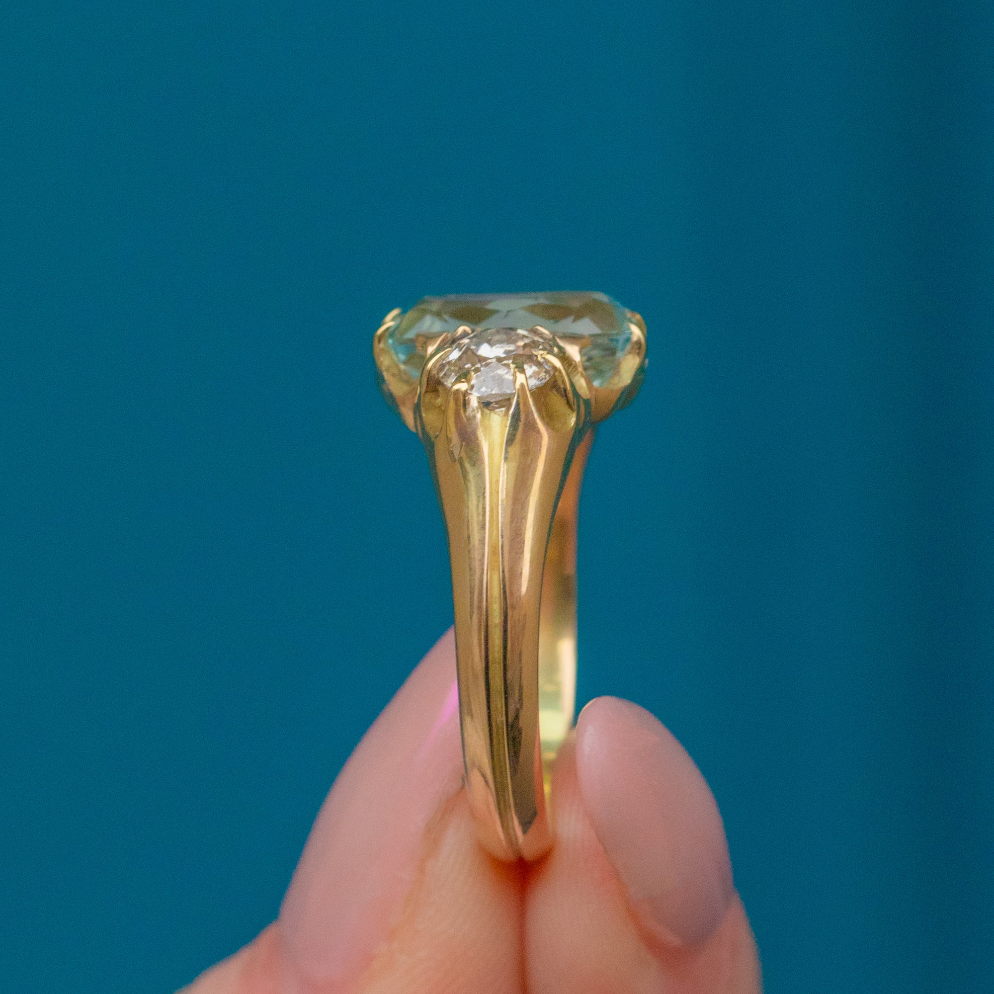 Simply stunning, her trio of gemstones glisten in the light, effortlessly complementing one another. Her central stone, a gleaming faceted Aquamarine, radiates gorgeous calming pastel blue hues. She is adorned by two crisp twinkling Diamonds either side, boasting 1.00ct combined. Each Diamond has a wonderful colour (graded as I-J) and sparkle beautifully.