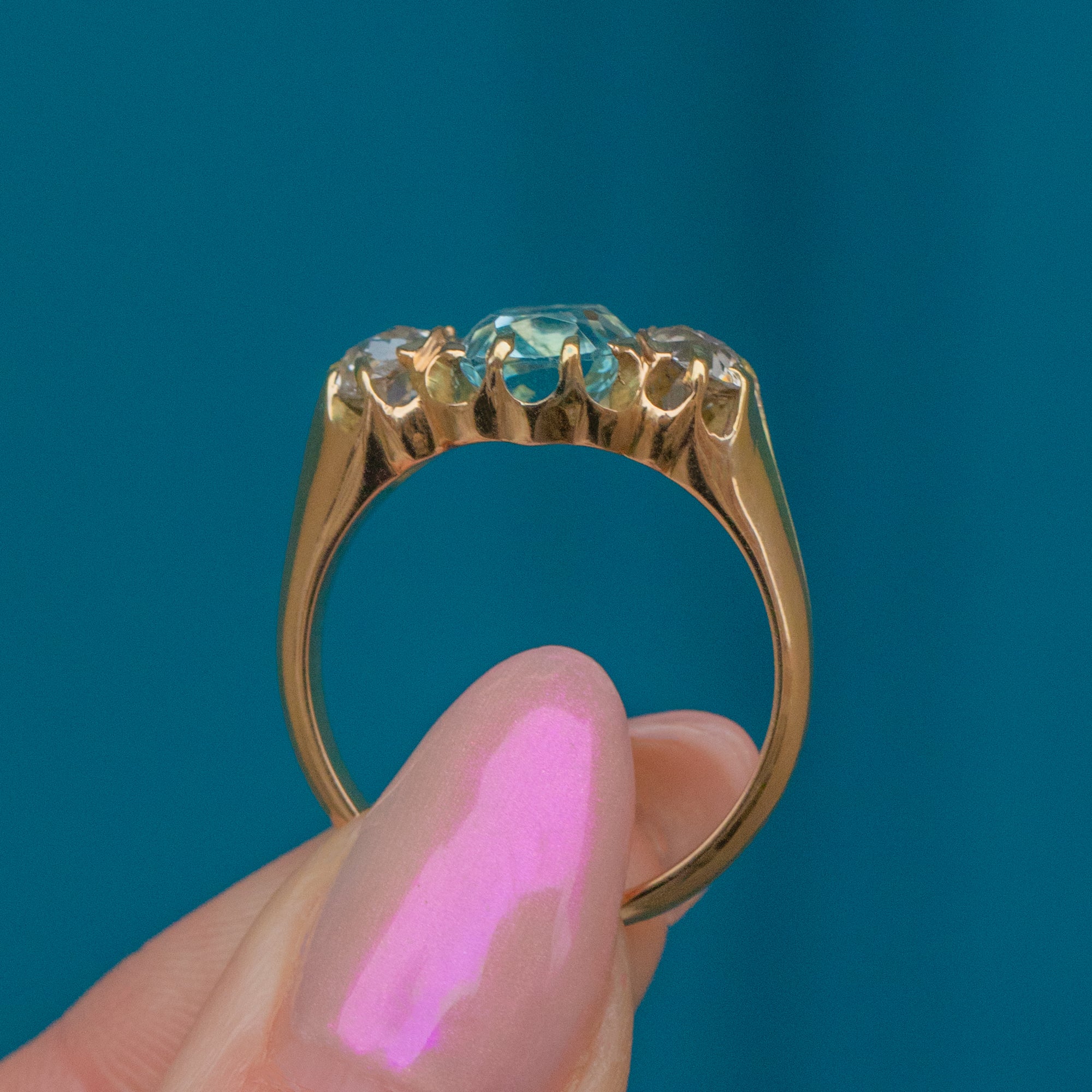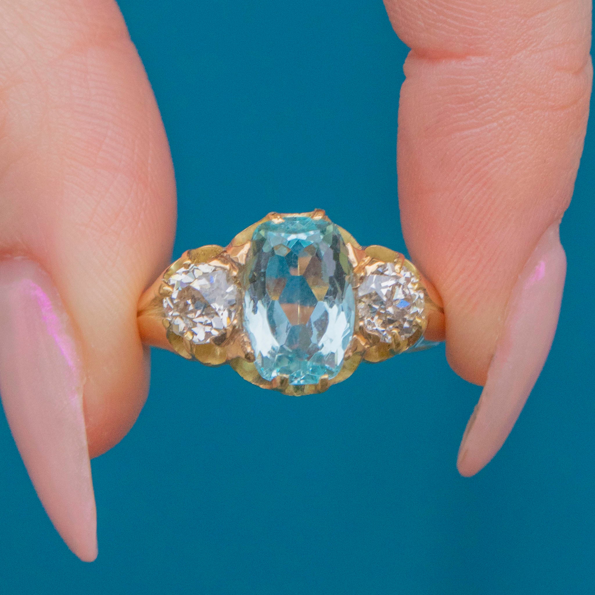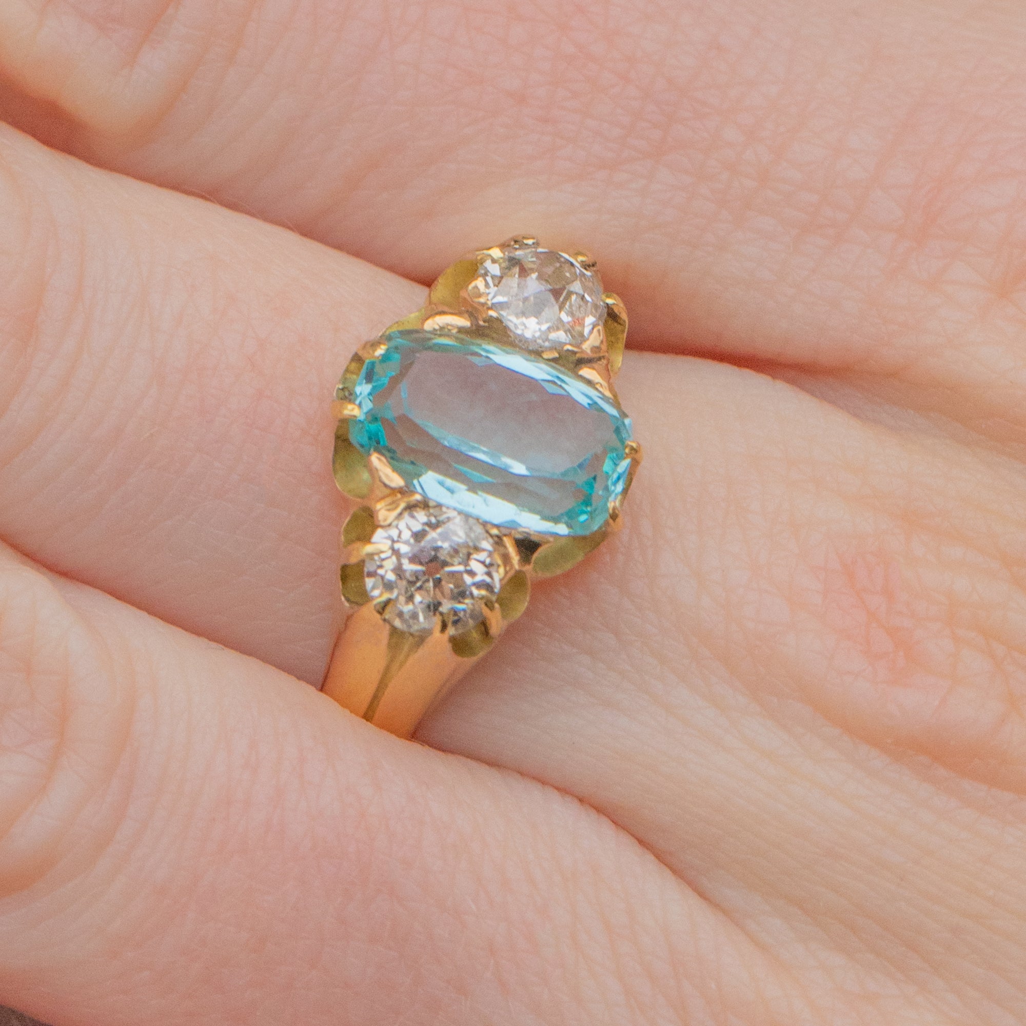 Fall in love with this antique 18ct Gold Aquamarine Diamond trilogy ring!