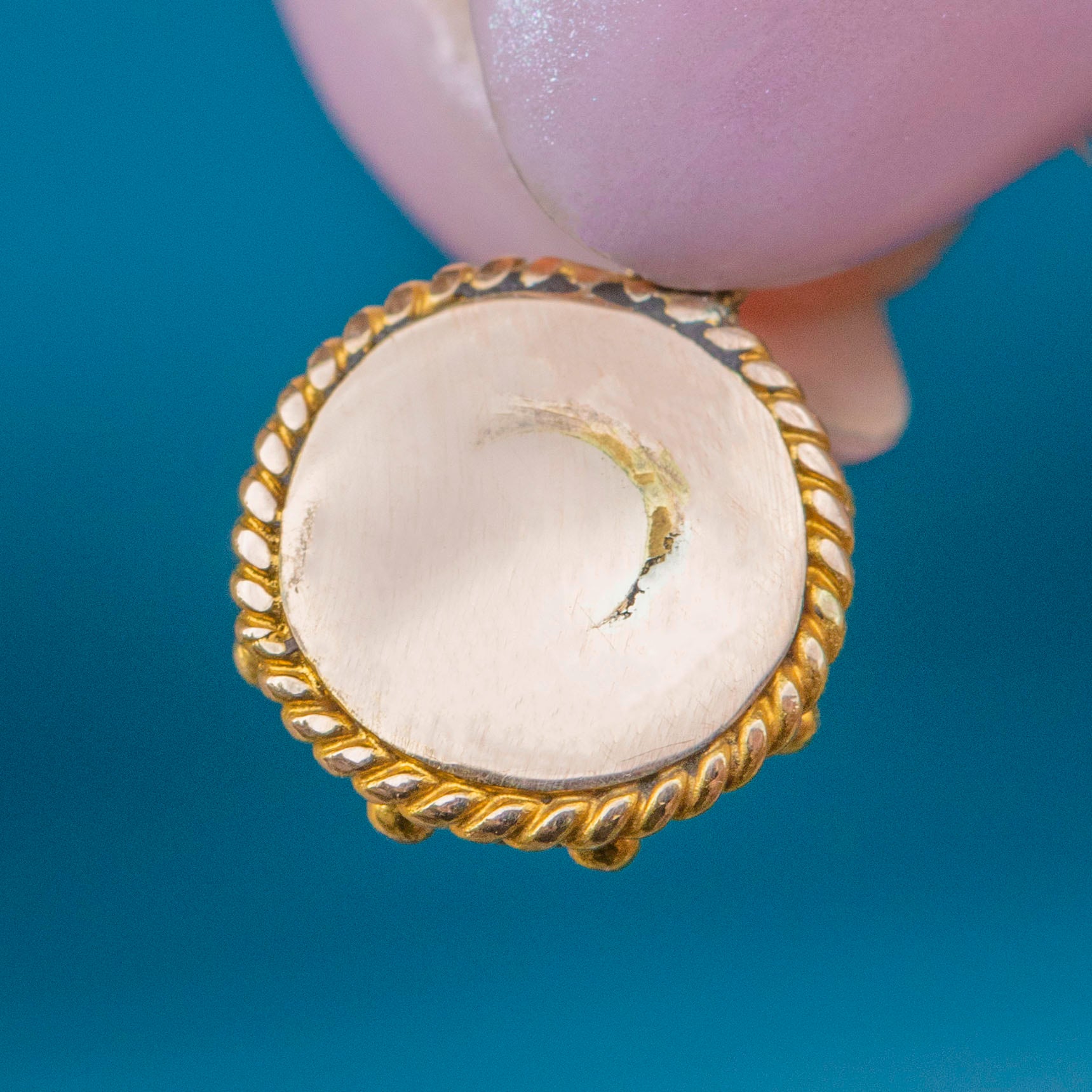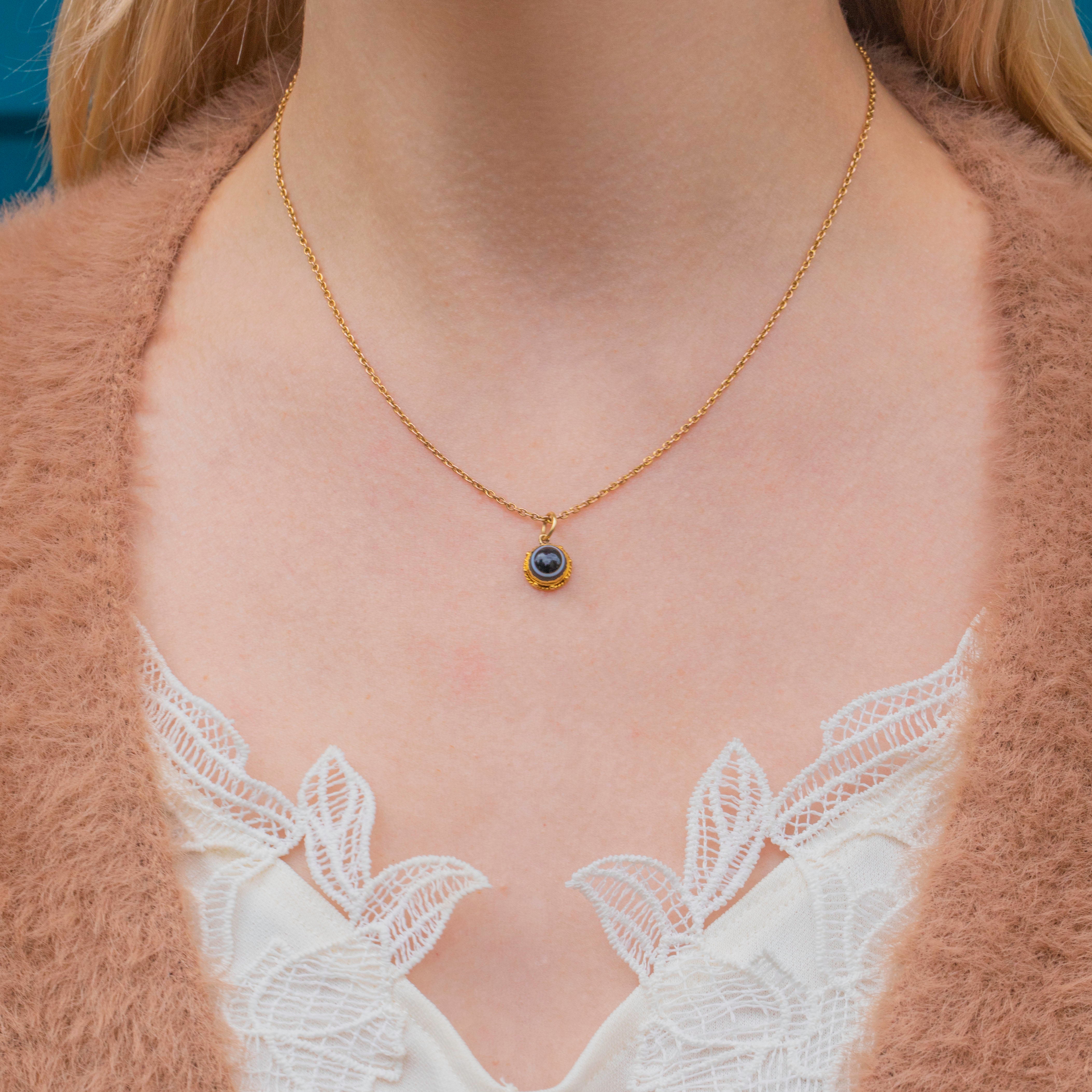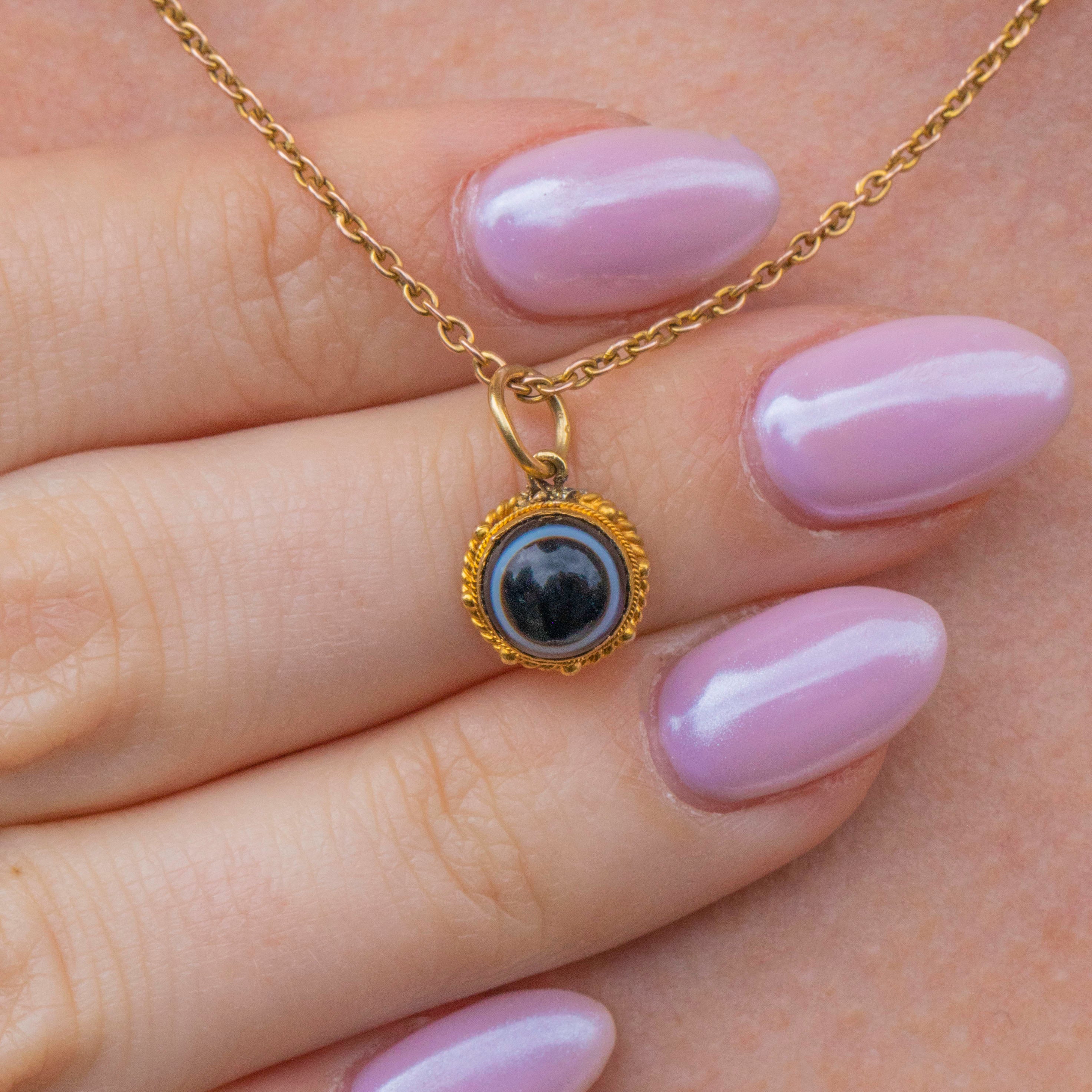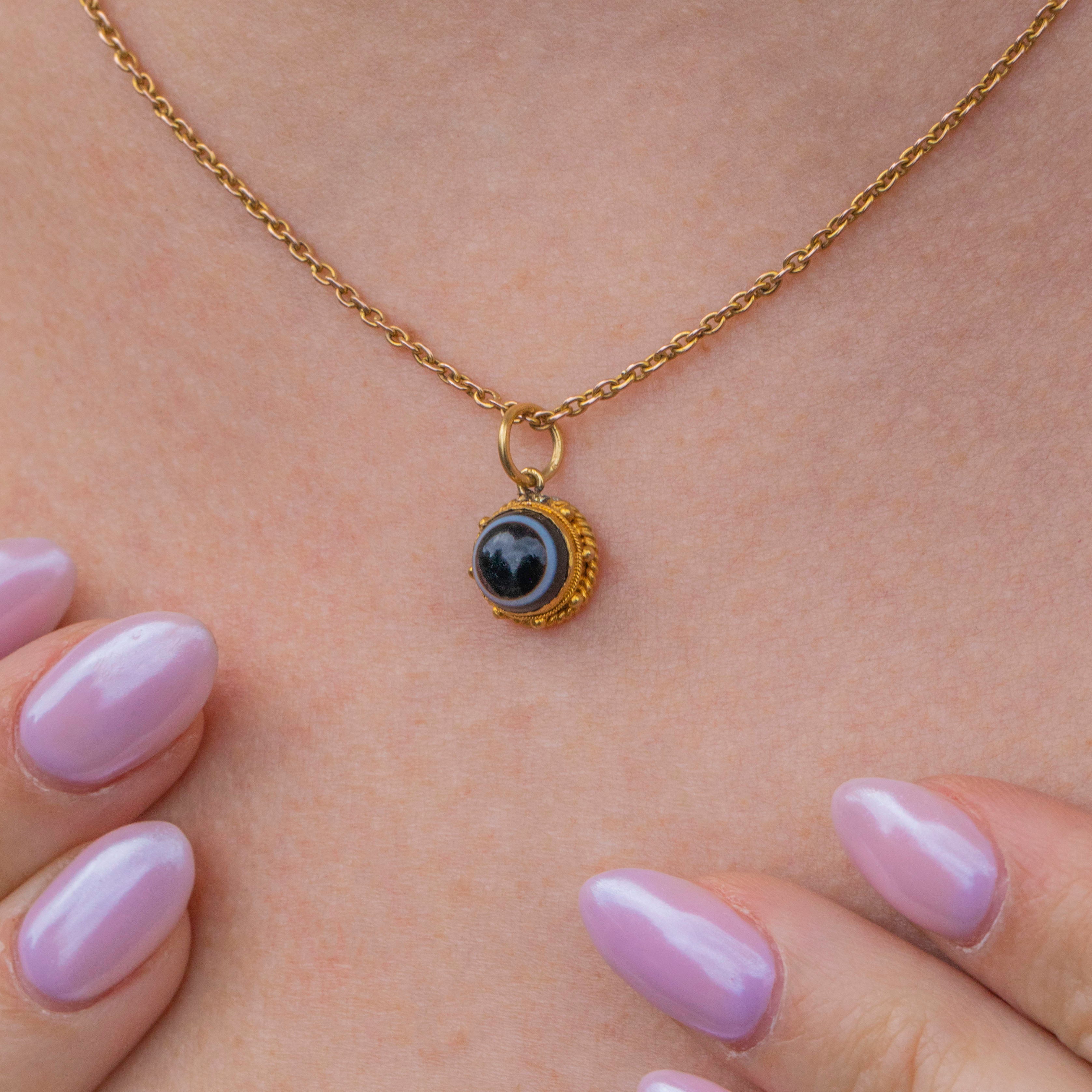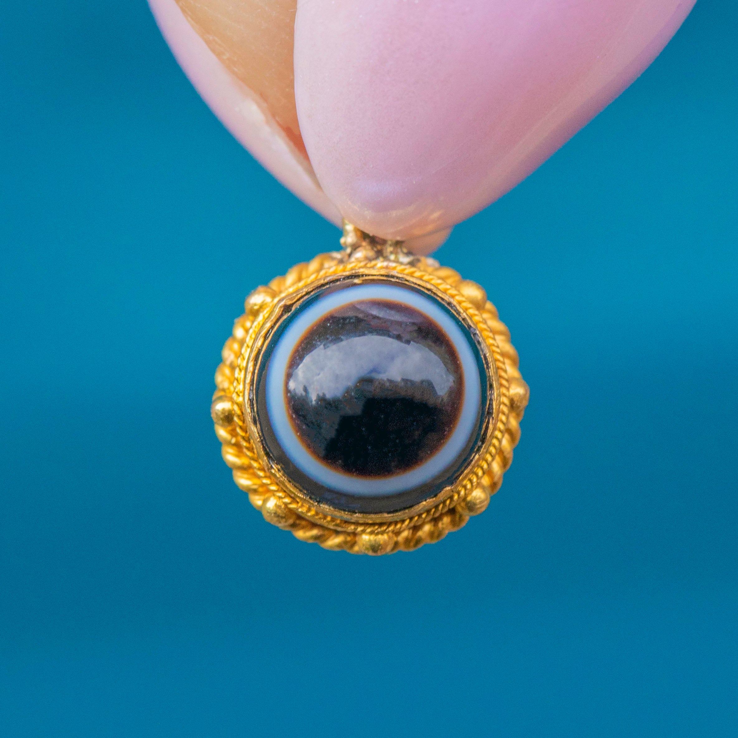 This banded Agate pendant is encased in richly saturated 18ct Gold, with a fine rope border and beaded details to finish, a classic design feature of Victorian jewellery. The beauty of this Victorian Gold pendant is her versatility; whether you choose to wear her amongst other charms or worn alone suspended from a chain, her beauty is timeless.
