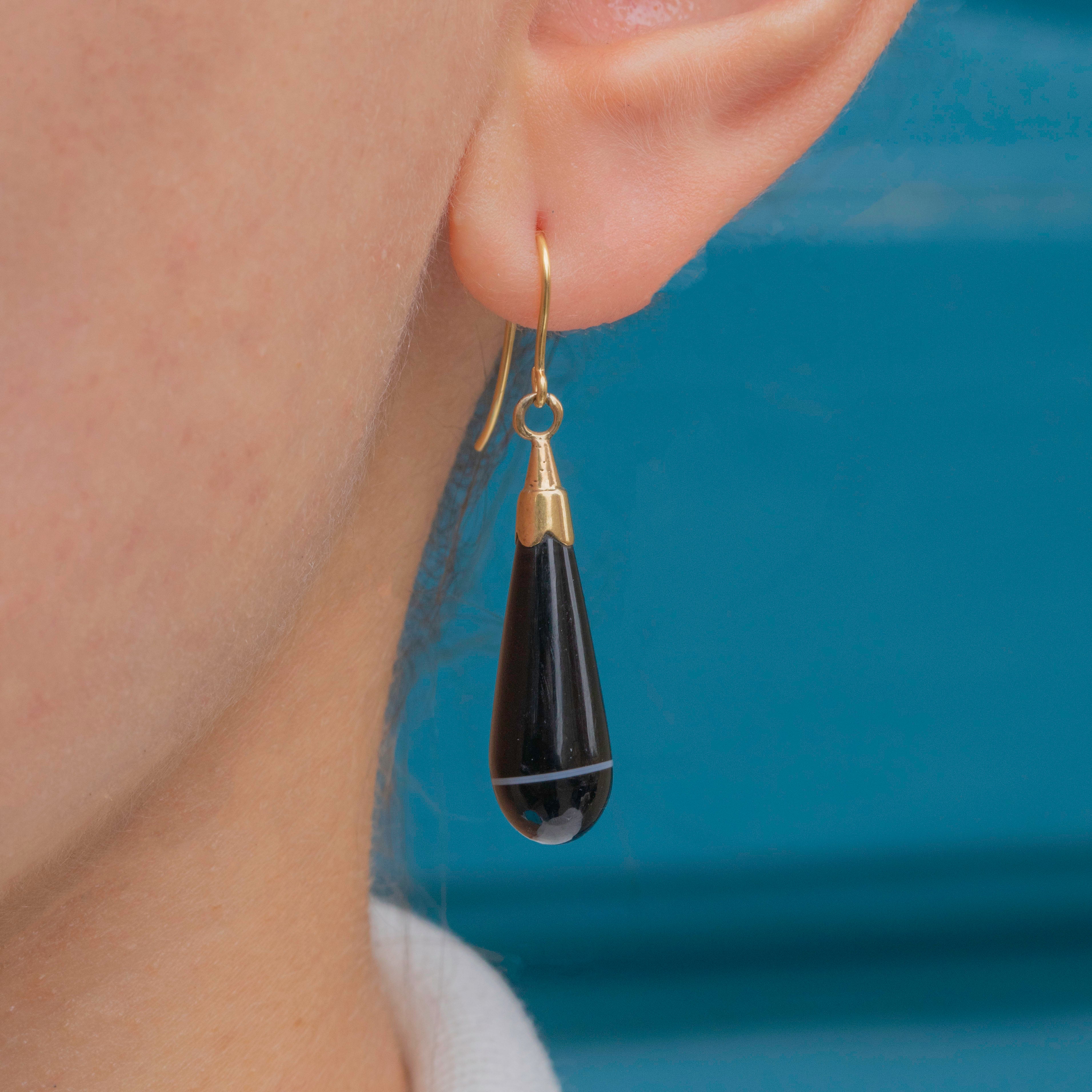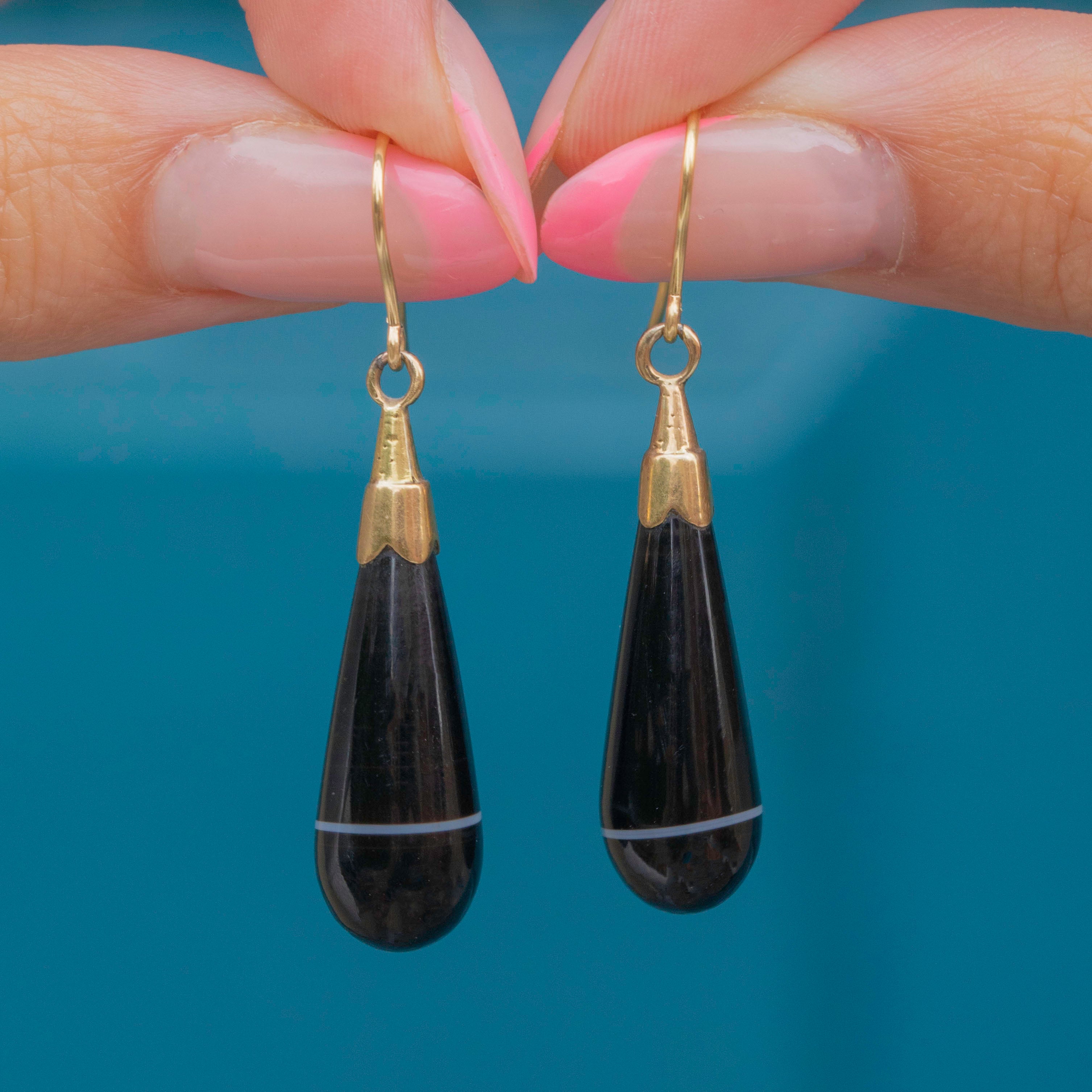 VERY GOOD: These Victorian 18ct Gold banded Agate drop earrings are in very good condition. Each Agate is saturated and securely attached to their settings. There are some scuffs and scratches to the Agate, though this is difficult to spot unless upon close inspection. The Gold is bright and buttery and, despite some minor dings, is in wonderful condition. With securely soldered hooks, these Victorian drop earrings can be worn with utmost confidence.