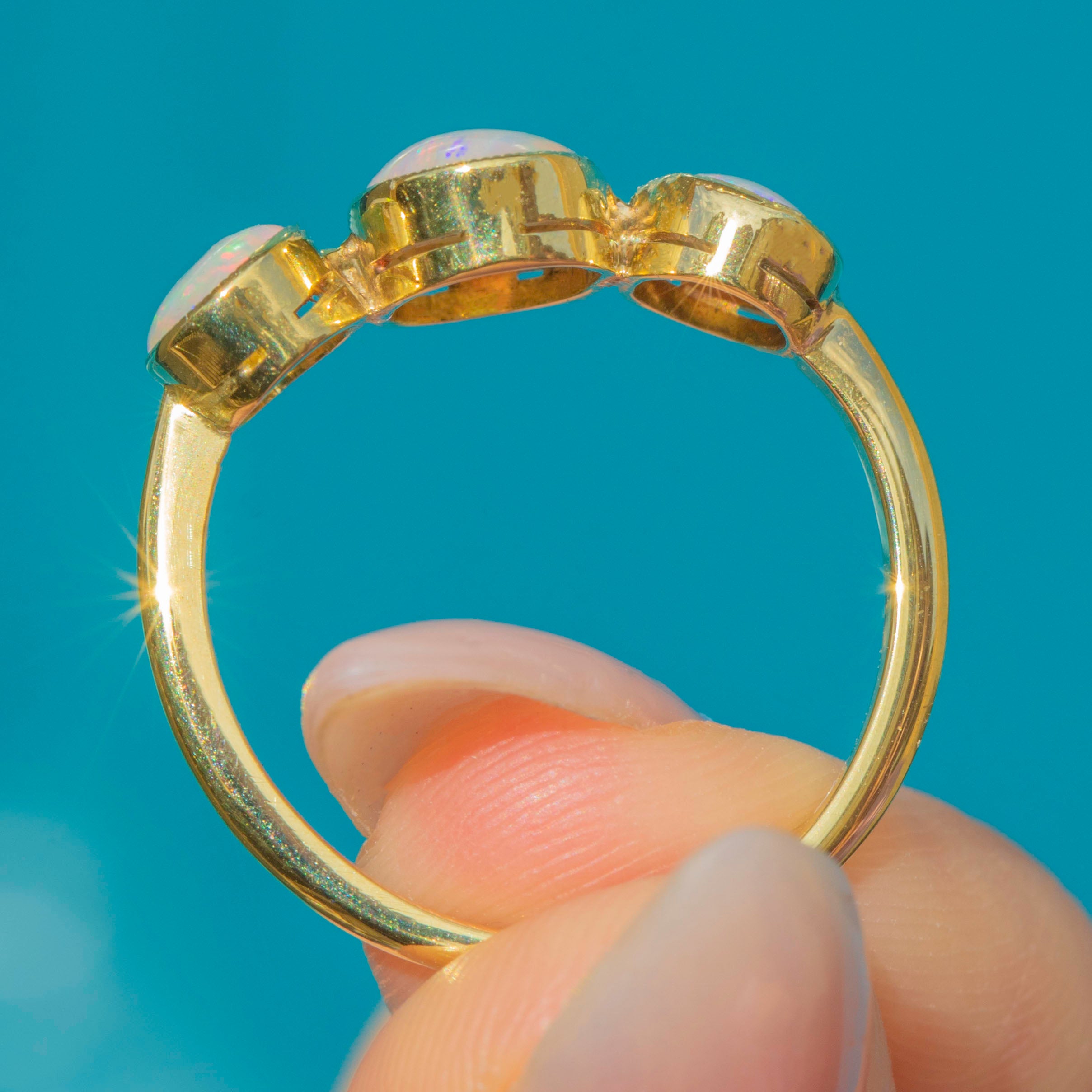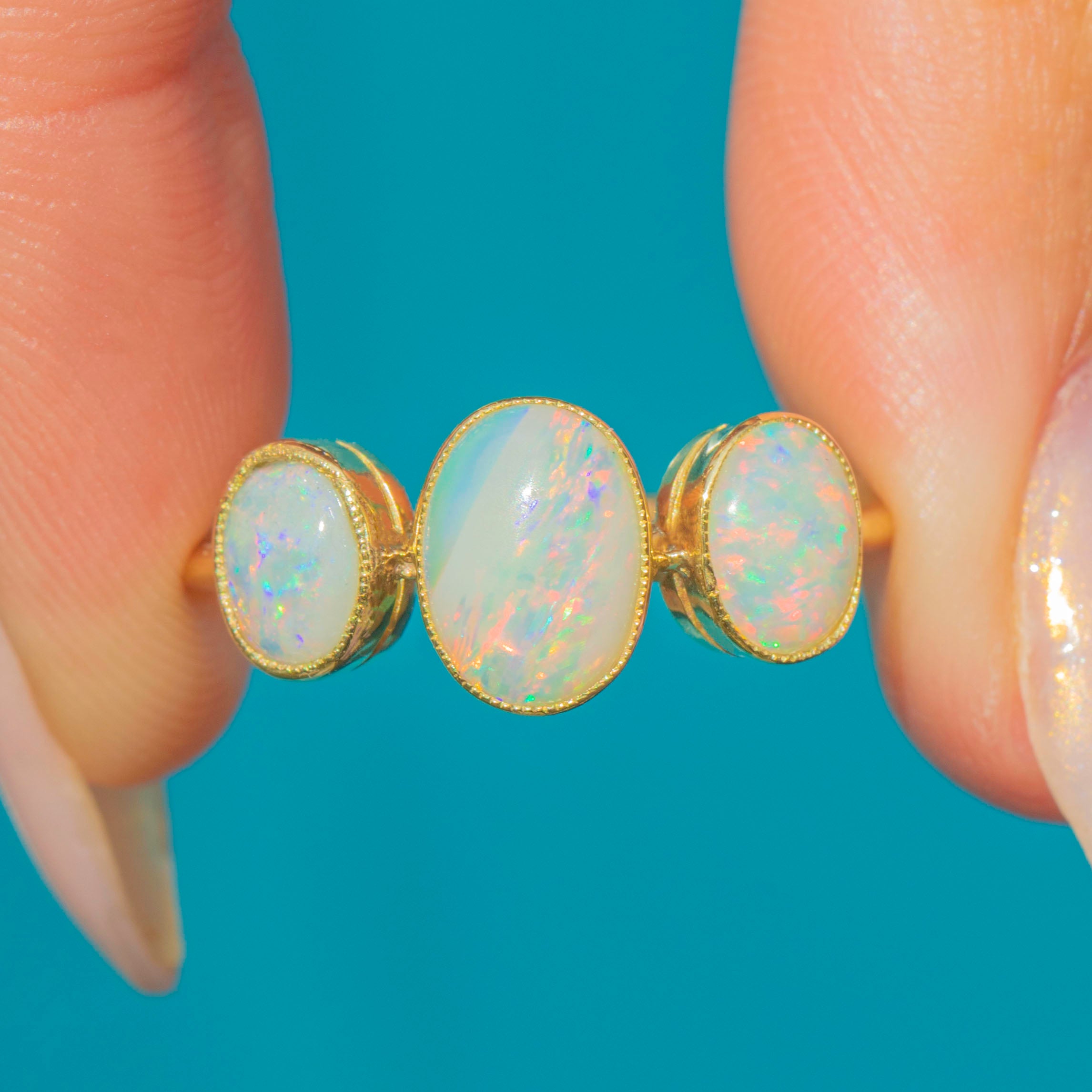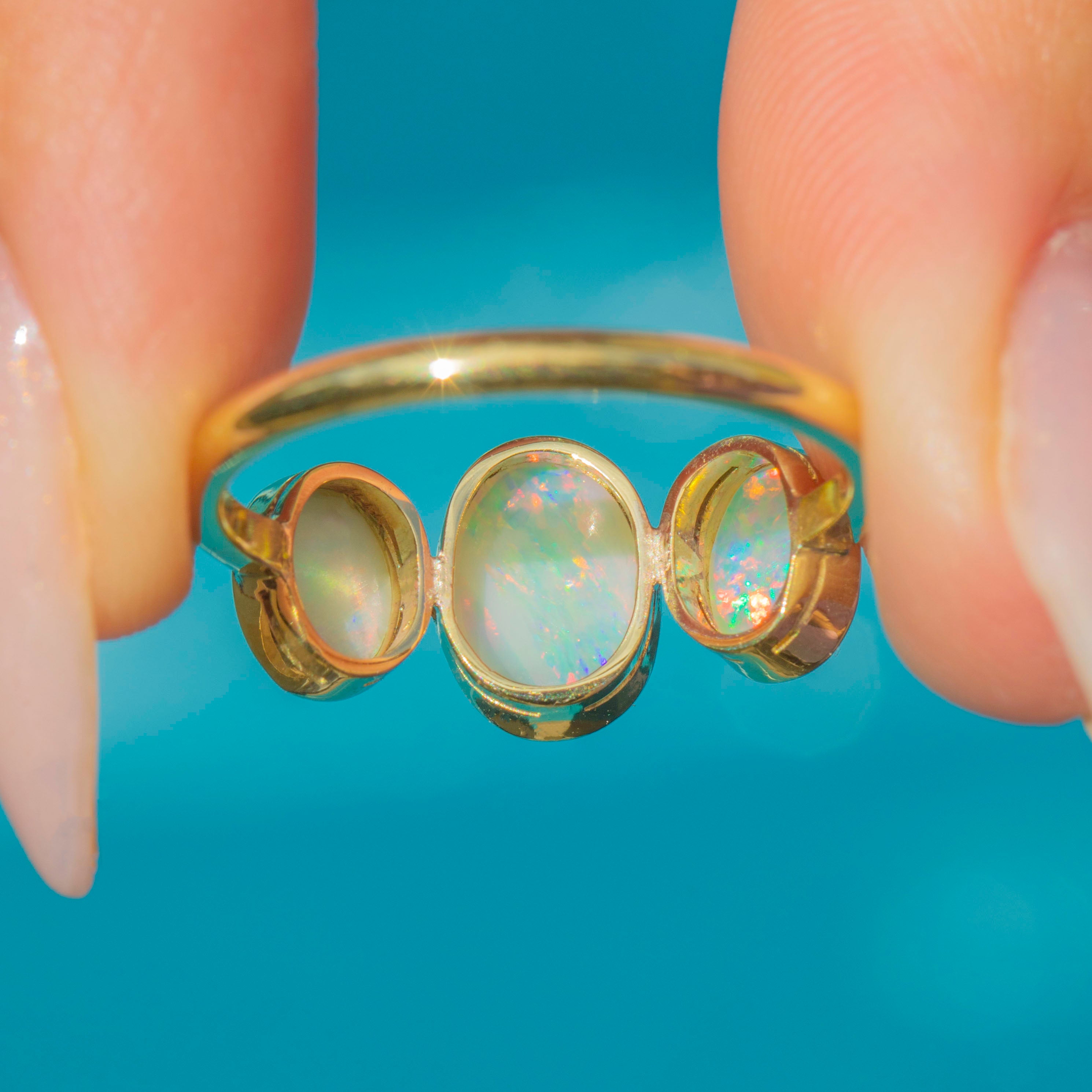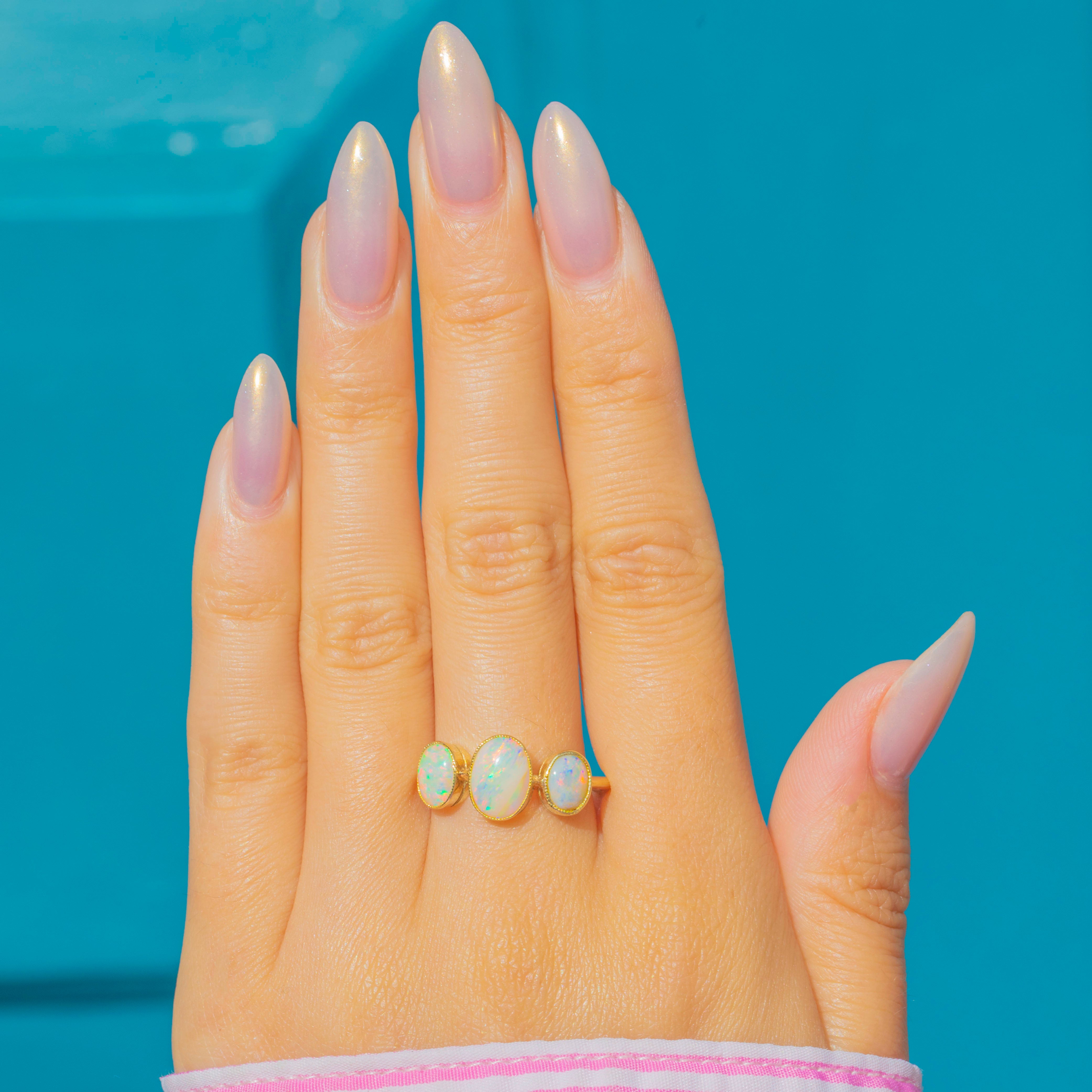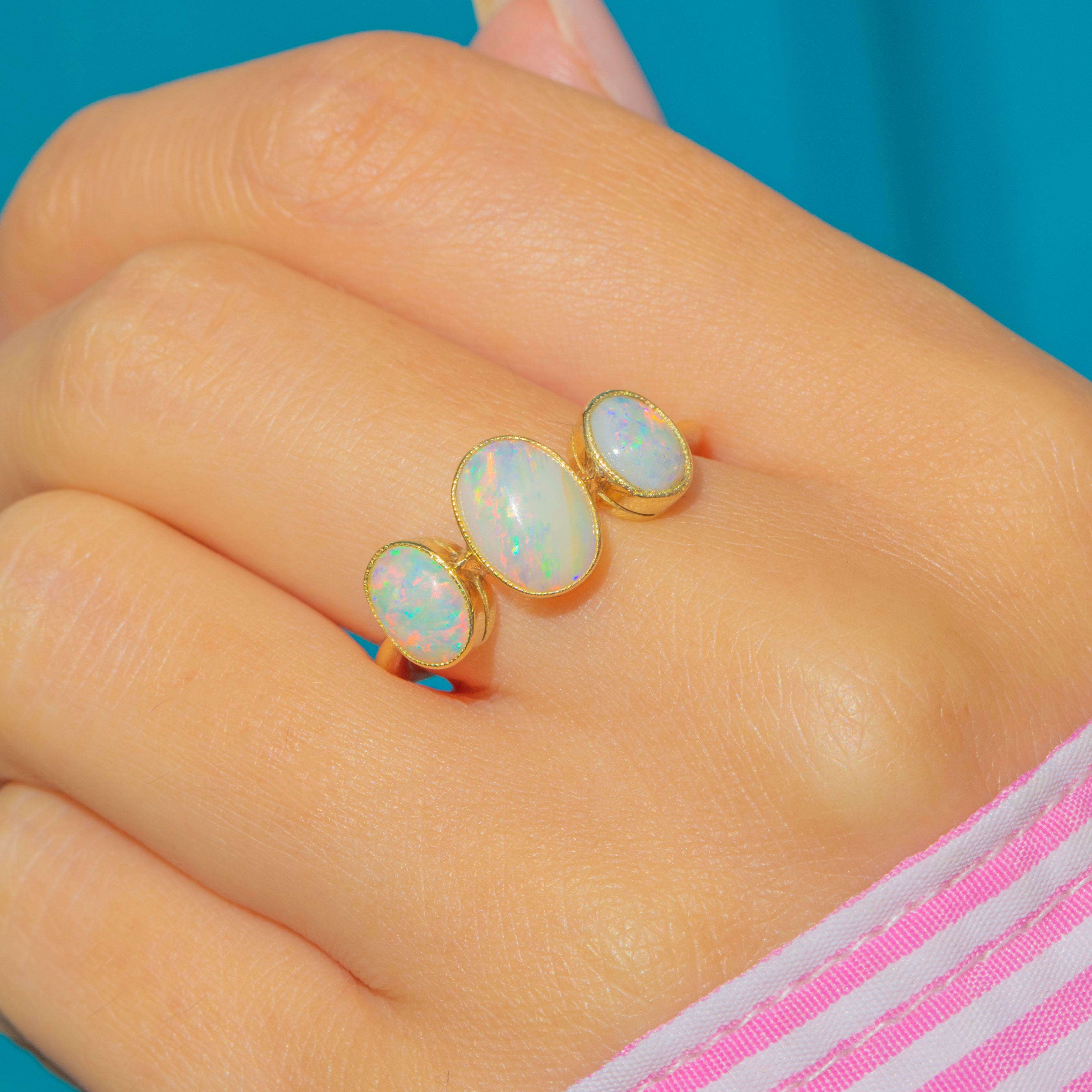 A beautiful Antique late Victorian 18ct Gold Opal trilogy ring, c.1900. The three natural solid Opals are bezel-set with delicate millegrain details, glowing with rainbow pastel colours and flashes of stripes in pinks, greens and blues.